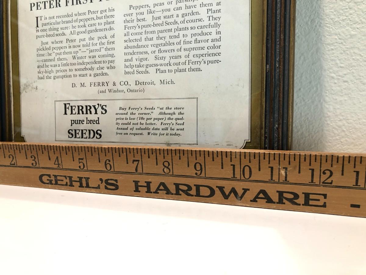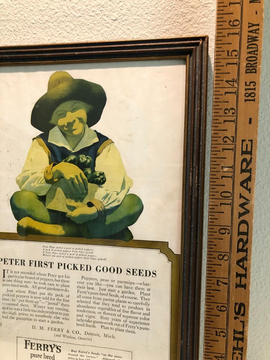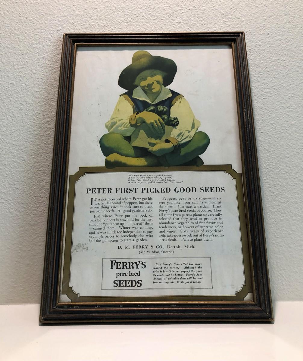 Framed 1921 Maxfield Parrish Advertisement Print Peter Piper selling Ferry's Pure Bred Seeds. In good condition, with one smudge mark (shown in photo).