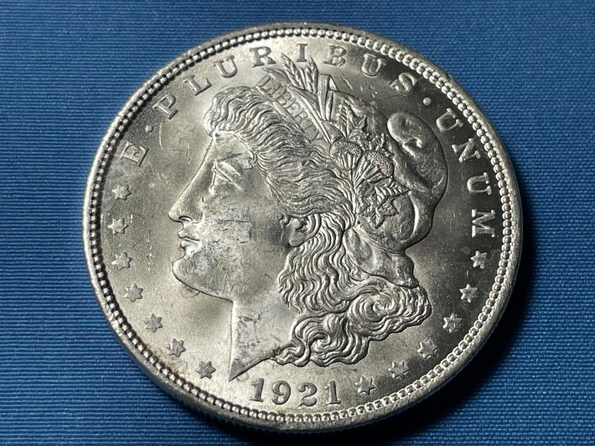 1921-P UNCIRCULATED CONDITION MORGAN SILVER DOLLAR (COIN #37). $5 DOMESTIC SHIPPING.