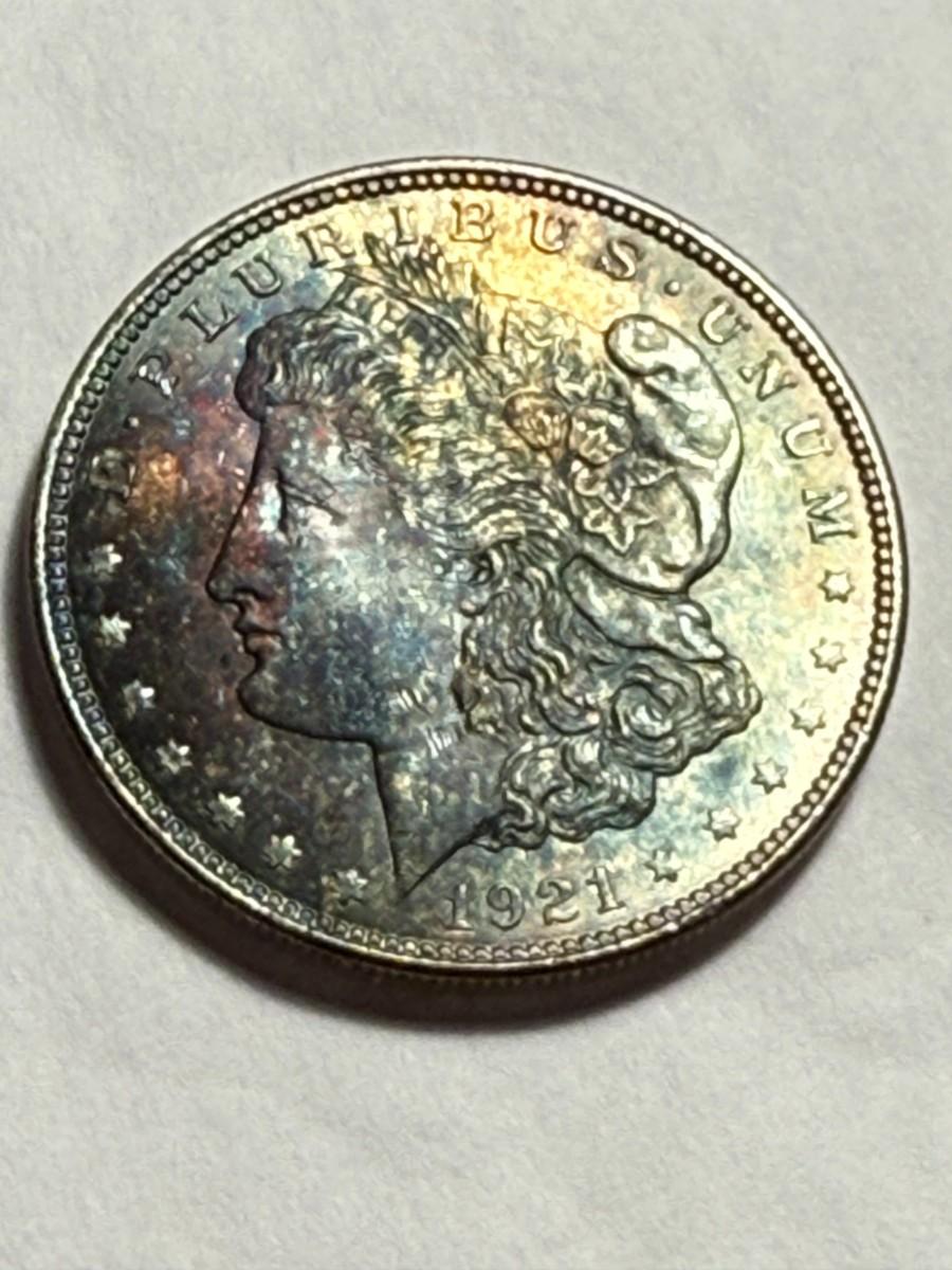 1921-P UNCIRCULATED GORGEOUS OBVERSE TONED MORGAN SILVER DOLLAR AS PICTURED. $5 DOMESTIC SHIPPING.