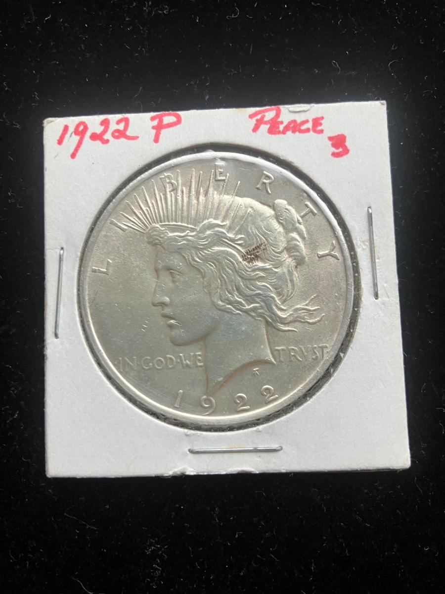 This 1922 Peace Silver Dollar, struck at the Philadelphia Mint (no mint mark), is from the second year of the iconic Peace dollar series (1921–1935) and the first year of the standard low relief design — often referred to in collector shorthand as the "Peace three" type (likely denoting the mature, finalized three-year evolution from the experimental high-relief 1921 issues through early 1922 trials to this enduring low-relief format). Designed by Anthony de Francisci to symbolize post-World War I peace, the obverse shows a radiant Liberty with sun-ray crown, inscribed "LIBERTY" above and "IN GOD WE TRUST" below, dated 1922. The reverse features a proud eagle on a mountaintop facing the rising sun, encircled by "UNITED STATES OF AMERICA," "E PLURIBUS UNUM," and "ONE DOLLAR."