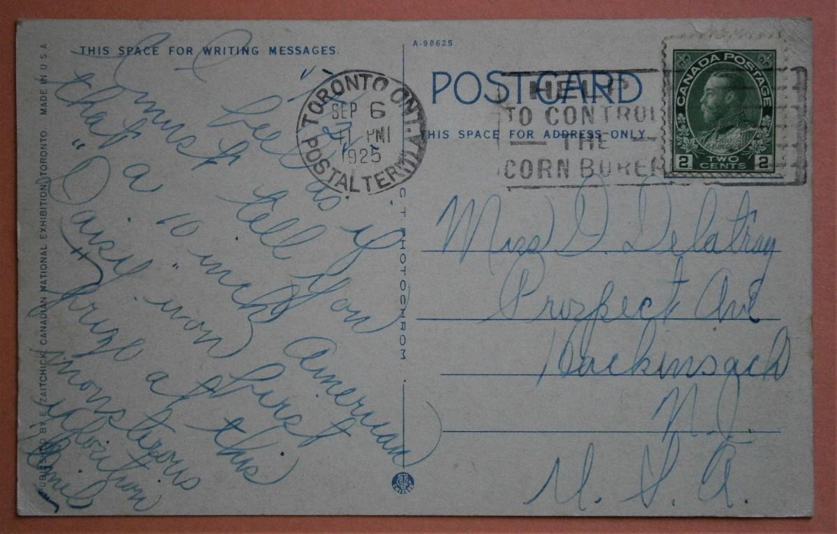Postcard of Canadian National Exhibition, Toronto posted in 1925, standard size, posted from TORONTO ONT. POSTAL TERMINAL, probably a Exhibition postmark.