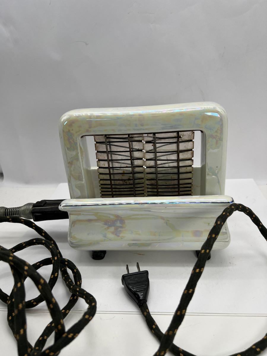 The Onyxide China Electric Toaster, available in a variety of colors, offers an opportunity to match tableware and decorations. It is made of Onyxide China, is tremendously sturdy and withstands heat. The Onyxide China Electric Toaster is so simply made that it cannot get out of order. The heating element is practically everlasting and it makes delicious toast instantly. Only a damp cloth is needed to clean it." Unit is being sold as a "non-working" vintage electronic device that should be gone over by a qualified technician prior to use. May have rust, corrosion or other flaws see pictures. The main body has been glued and repaired.
