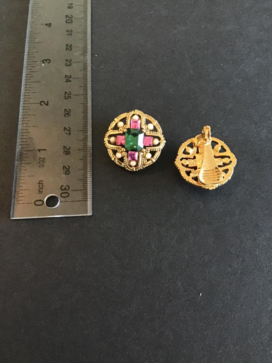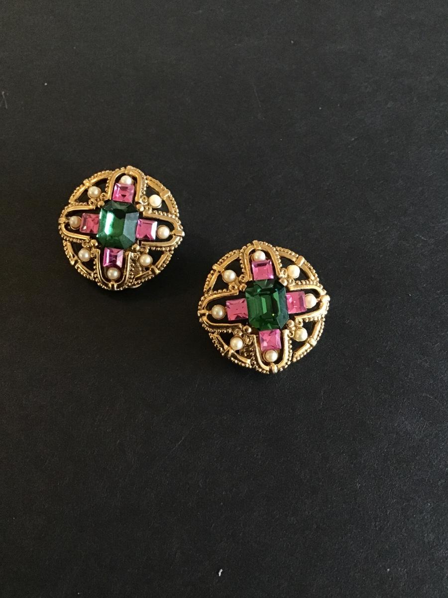 1928 gold tone Maltese cross style clip on earrings with pink and green Glass rhinestones and faux pearls Please see attached photos