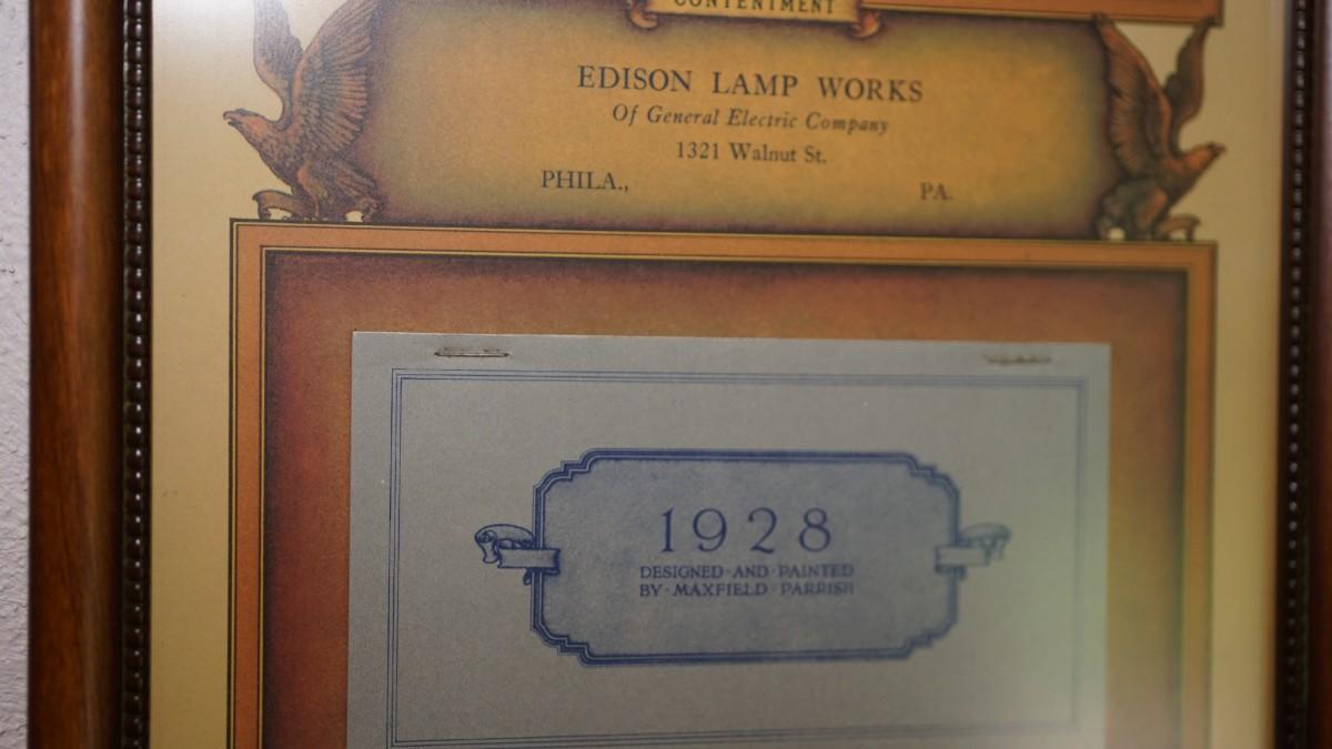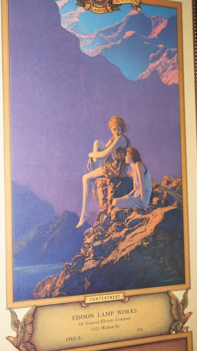 1928 MAXFIELD PARRISH CALENDAR "CONTENTMENT" FRAMED FOR EDISON LAMP WORKS. CALENDAR IS INTACT