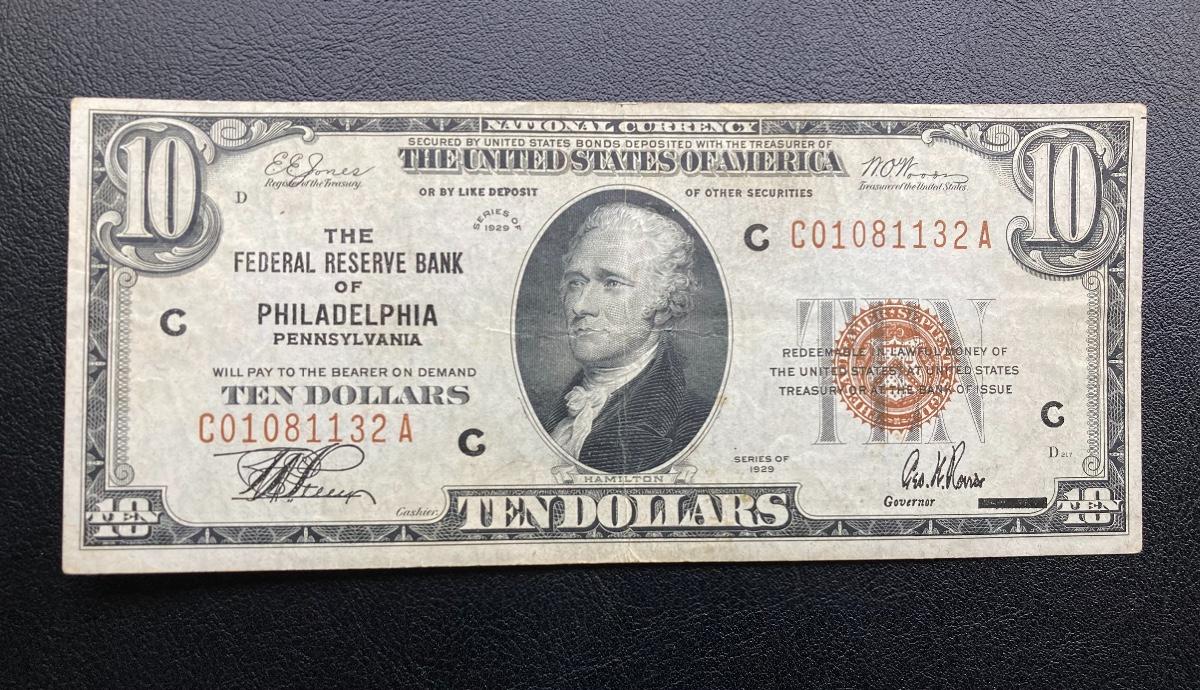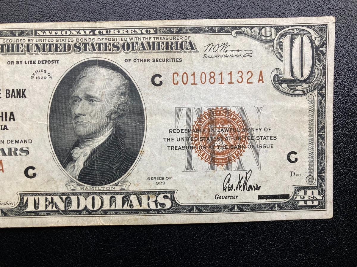 1929 federal reserve bank of Philadelphia $10 note. Lot A2