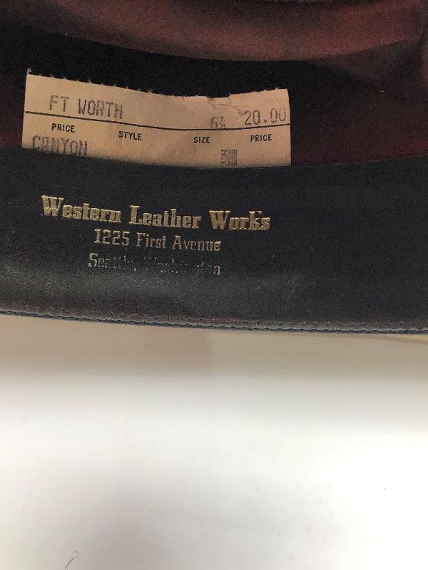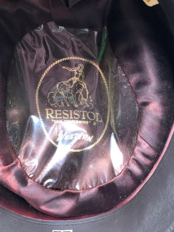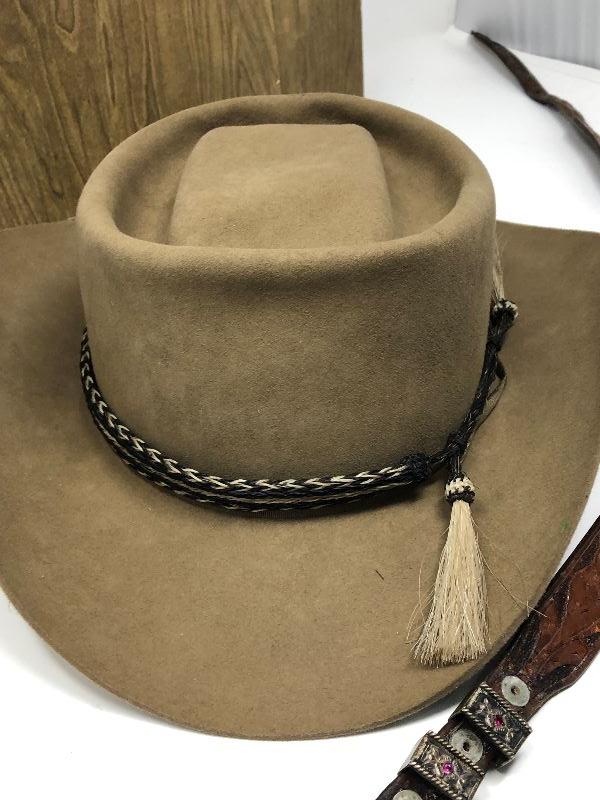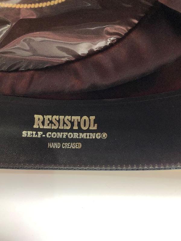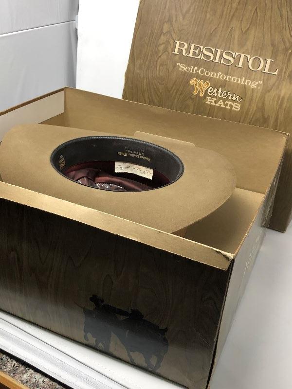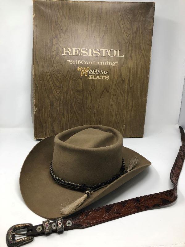 Small Resistol western leather works hand creased hat size 6-7/8 (20")still in it's original box, and a small leather western style belt 26" long.
