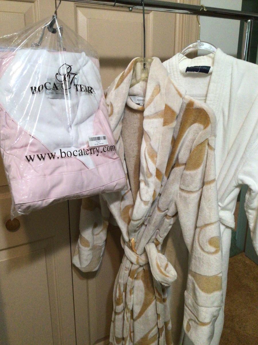 There are 3 robes in the lot, boca Terry is new in package, Highgate manor is very plush sized M/L and the Claybrooke is white and one size.