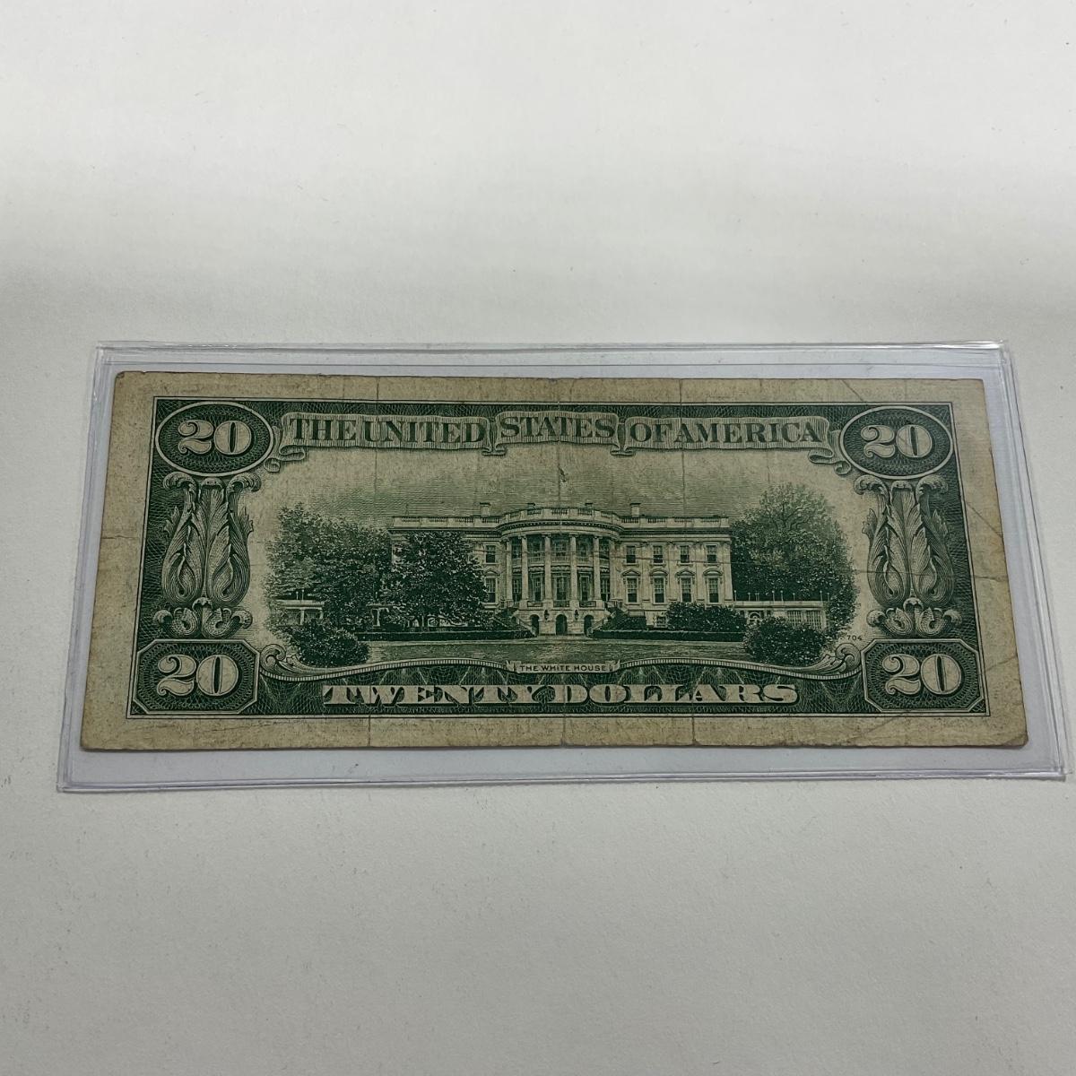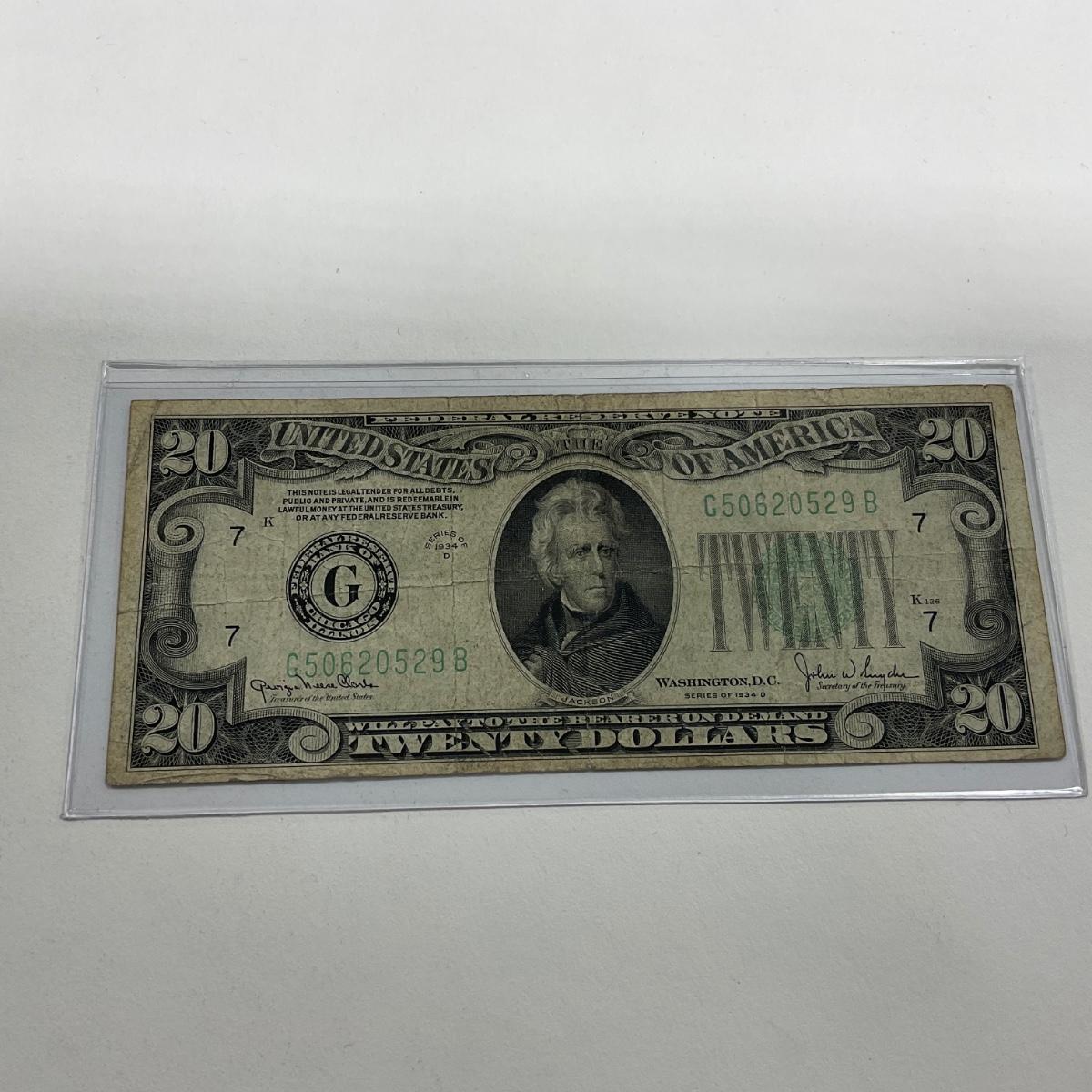 One 1934D federal reserve twenty dollar bill average wear and very presentable. Please see photos for details and condition. ::: Shipping is available on this lot. If you require shipping you must let us know at the close of the auction. We will coordinate with you after the item has been won. Shipping fees will include insurance up to or exceeding the value of all items being mailed. If you have any questions regarding this lot please contact the auctioneer either via this website, by direct email or by phone. PICK UP TIMES and other important information can be found in the TERMS and DESCRIPTION of the auction. Please take a look for pertinent information. Thanks!