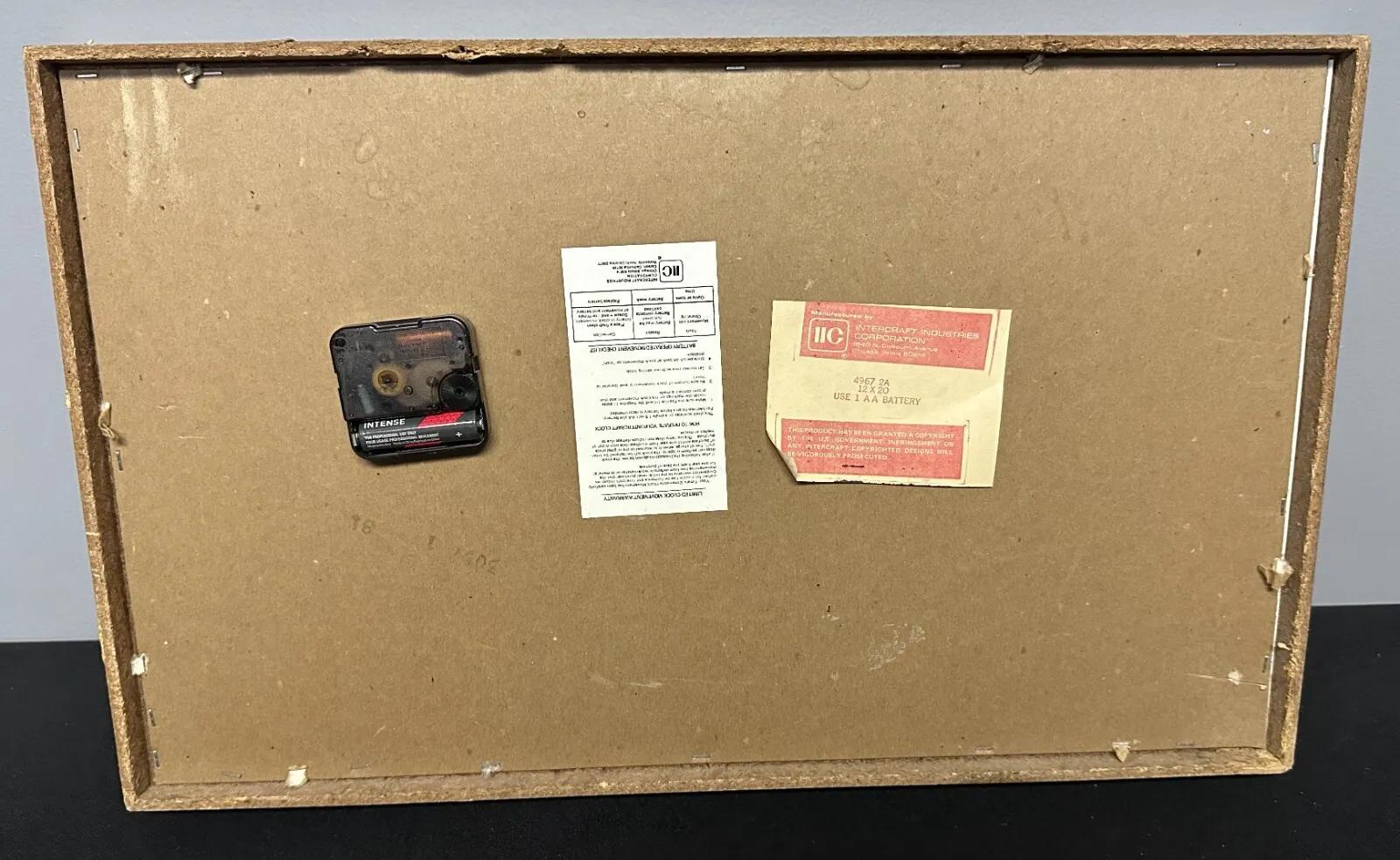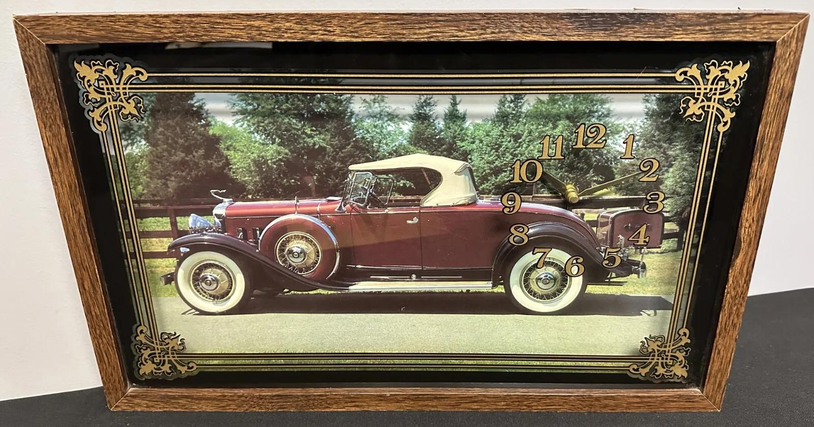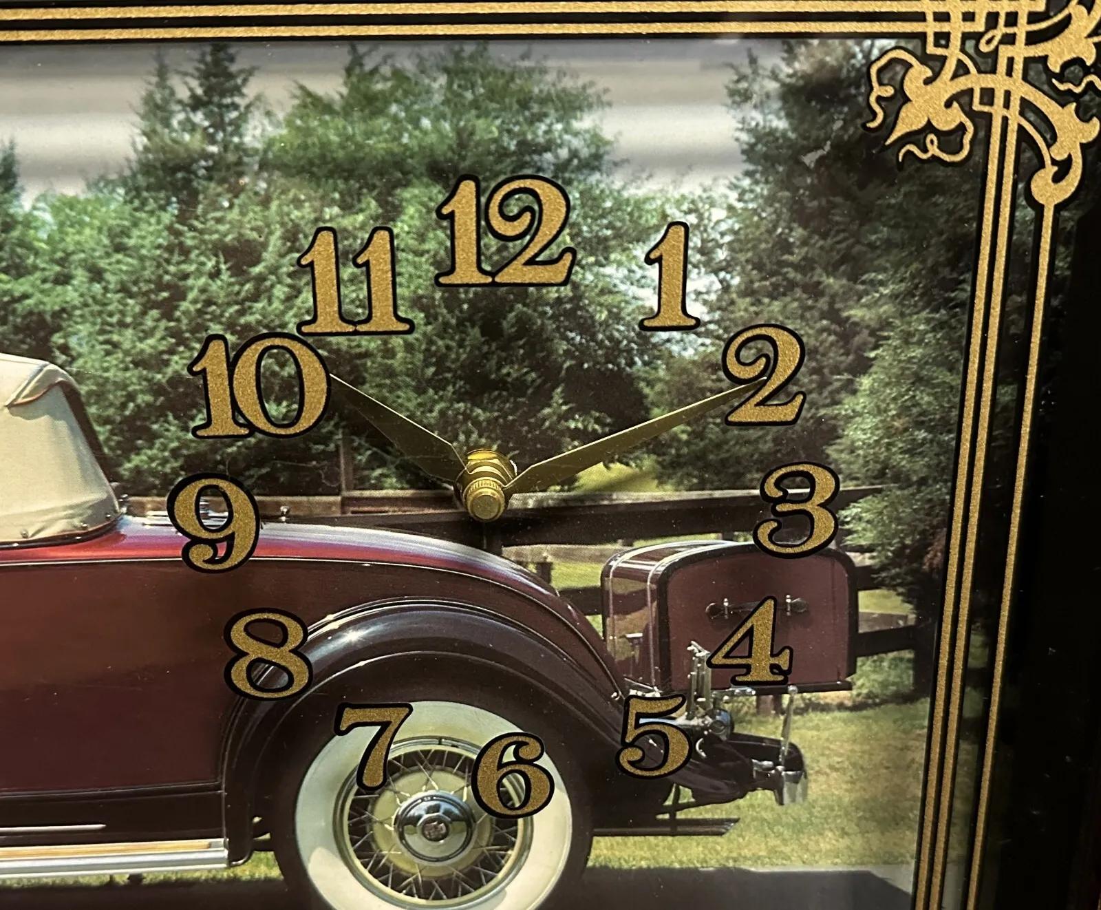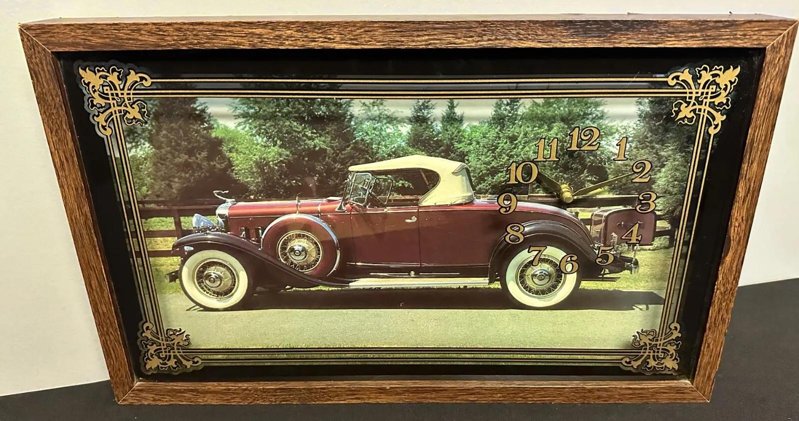 Nice condition on this vintage shadowbox quartz wall clock from Intercraft Industries circa 1970s...Wood box frame...a full-color photo of a 1930 Cadillac V-16 Roadster...Clock runs on an AA battery..Sets easily..Analog display..Measures 20.5 x 12.75"...Note some reflections in photos from the reverse painted glass.