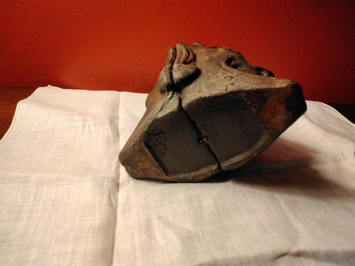 The homeowner's father designed these metal banks at A.C. Williams therefore this one was unpainted. It measures 4 1/2 inches high, 4 inches chin to chin 3 inches ear to ear. This is a really great piece that is hard to find! All in all this is a magnificent cast iron bank. You don't see many of these out there. Tier 2.