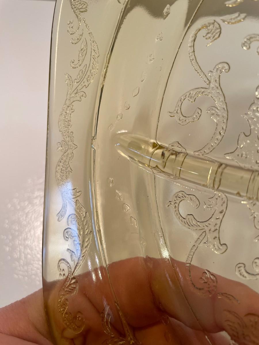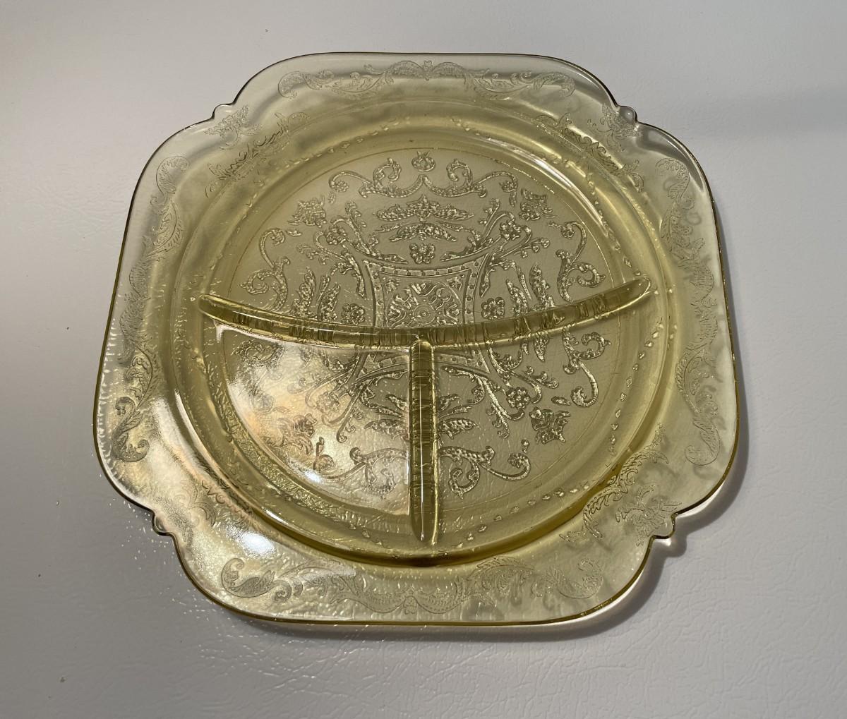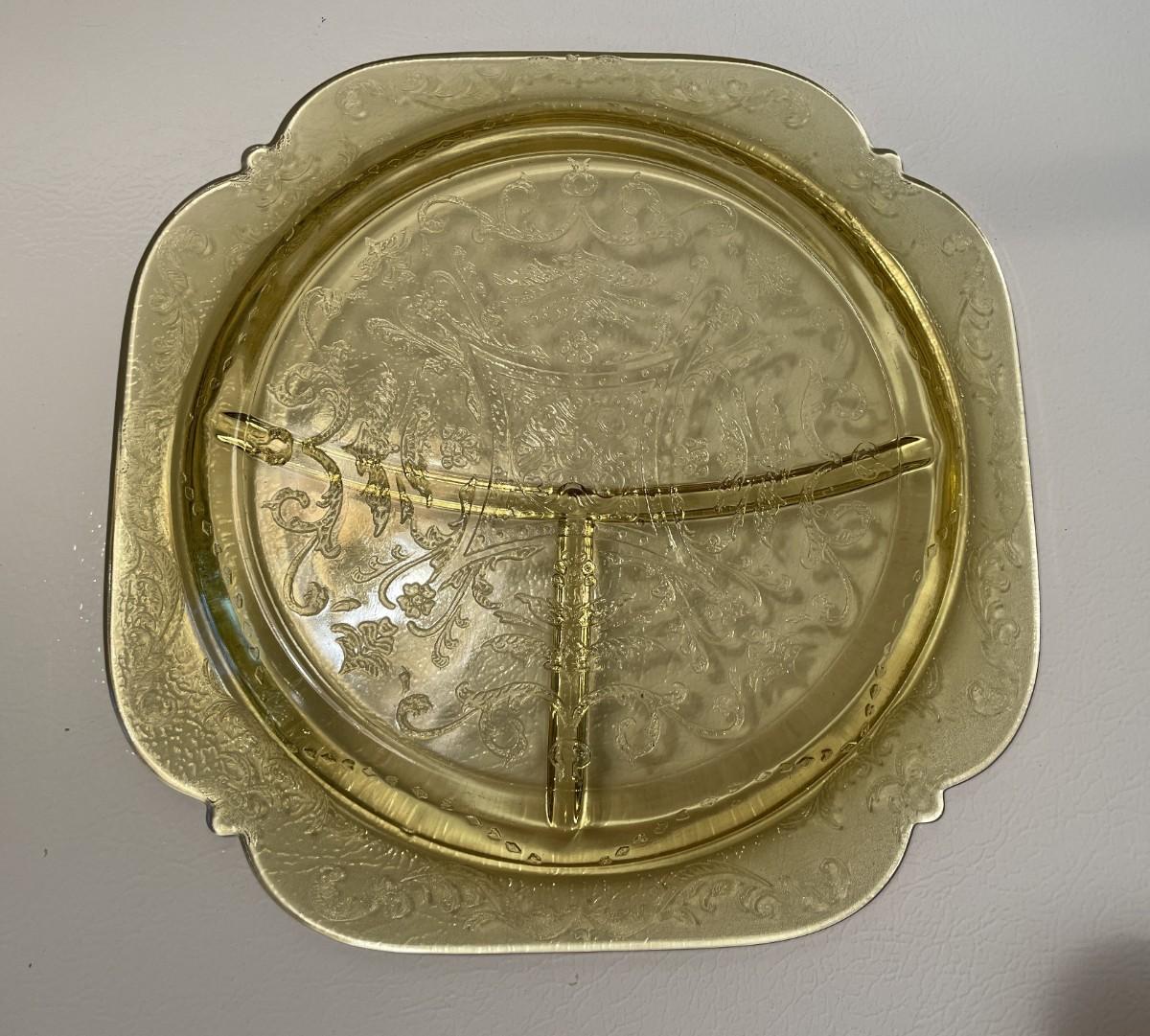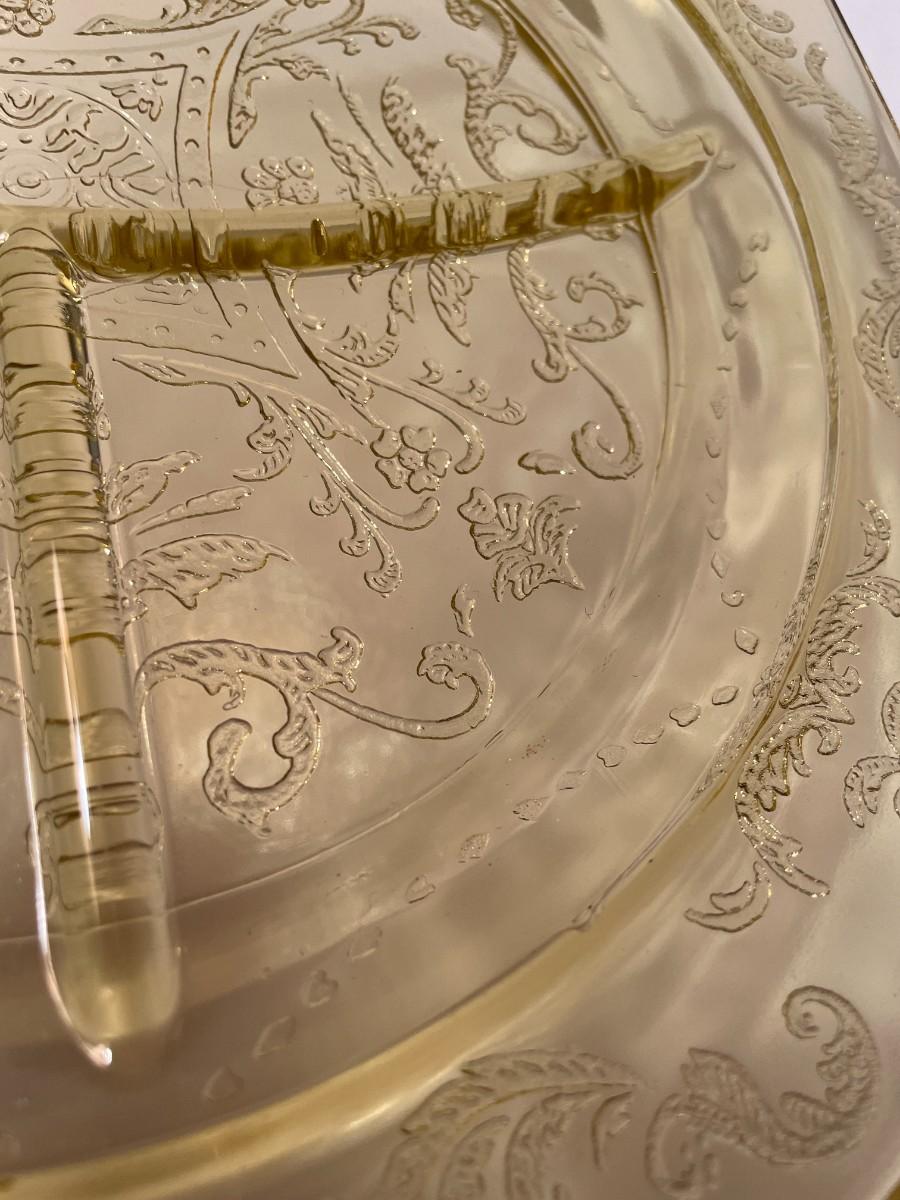 This divided plate is about 10.25 in diameter and other than two light chips along the edge which could be easily smoothed with a nail file, it is in excellent condition. This pattern was made by the Federal Glass Company in the 1930s.