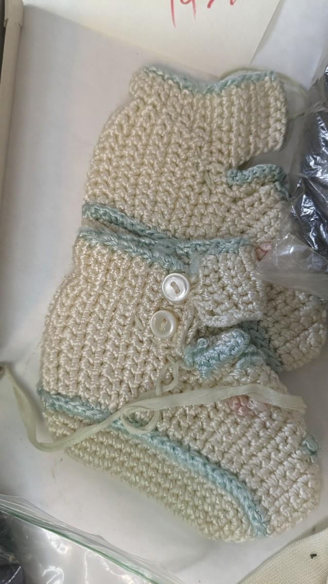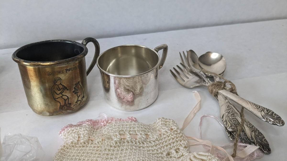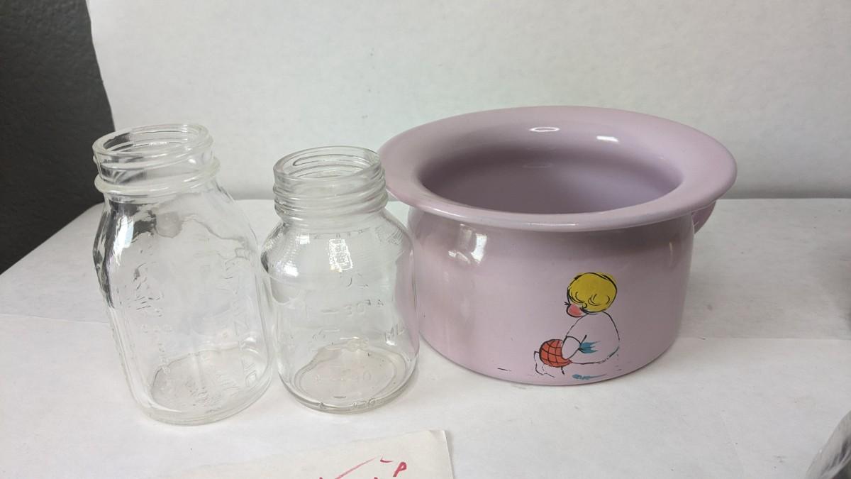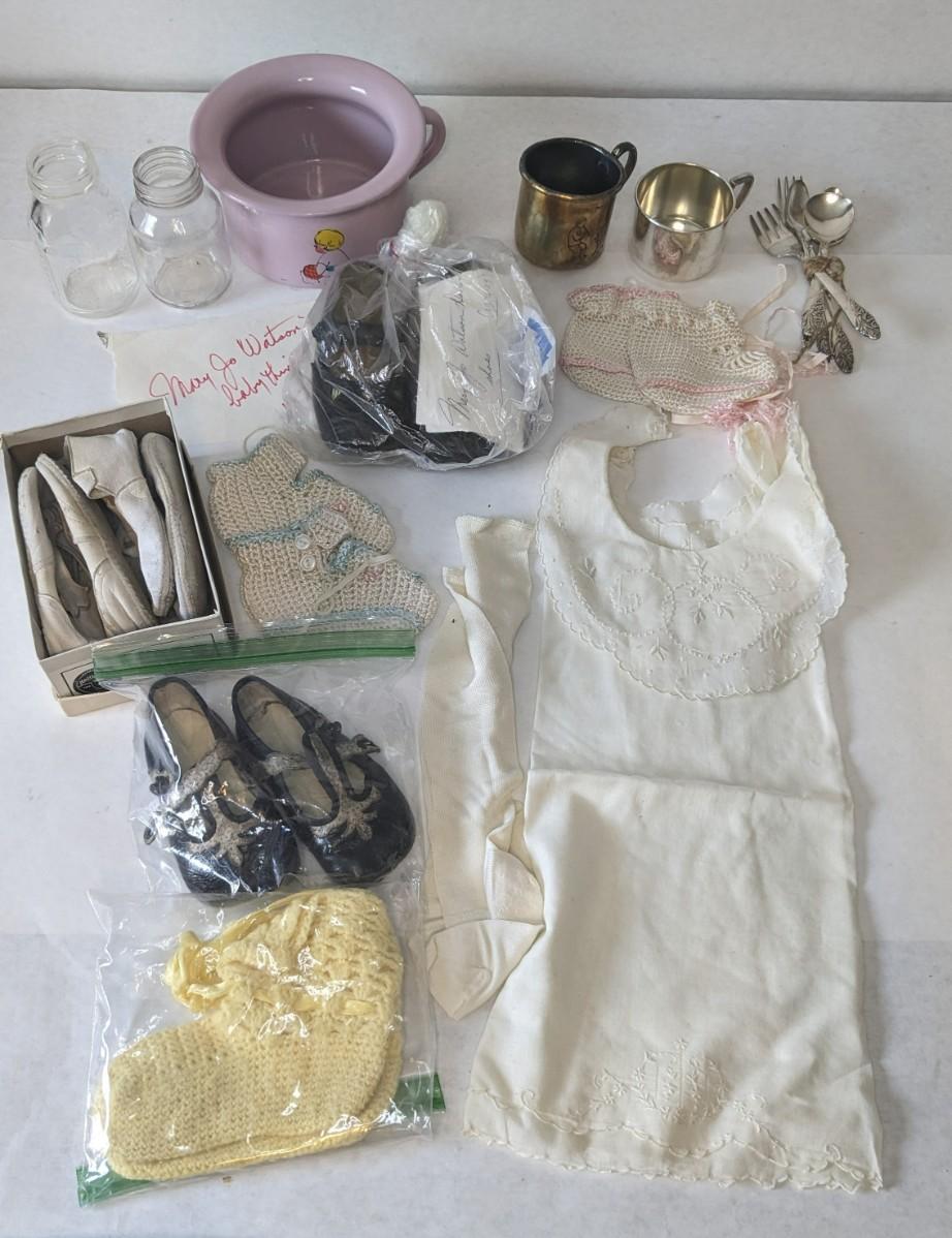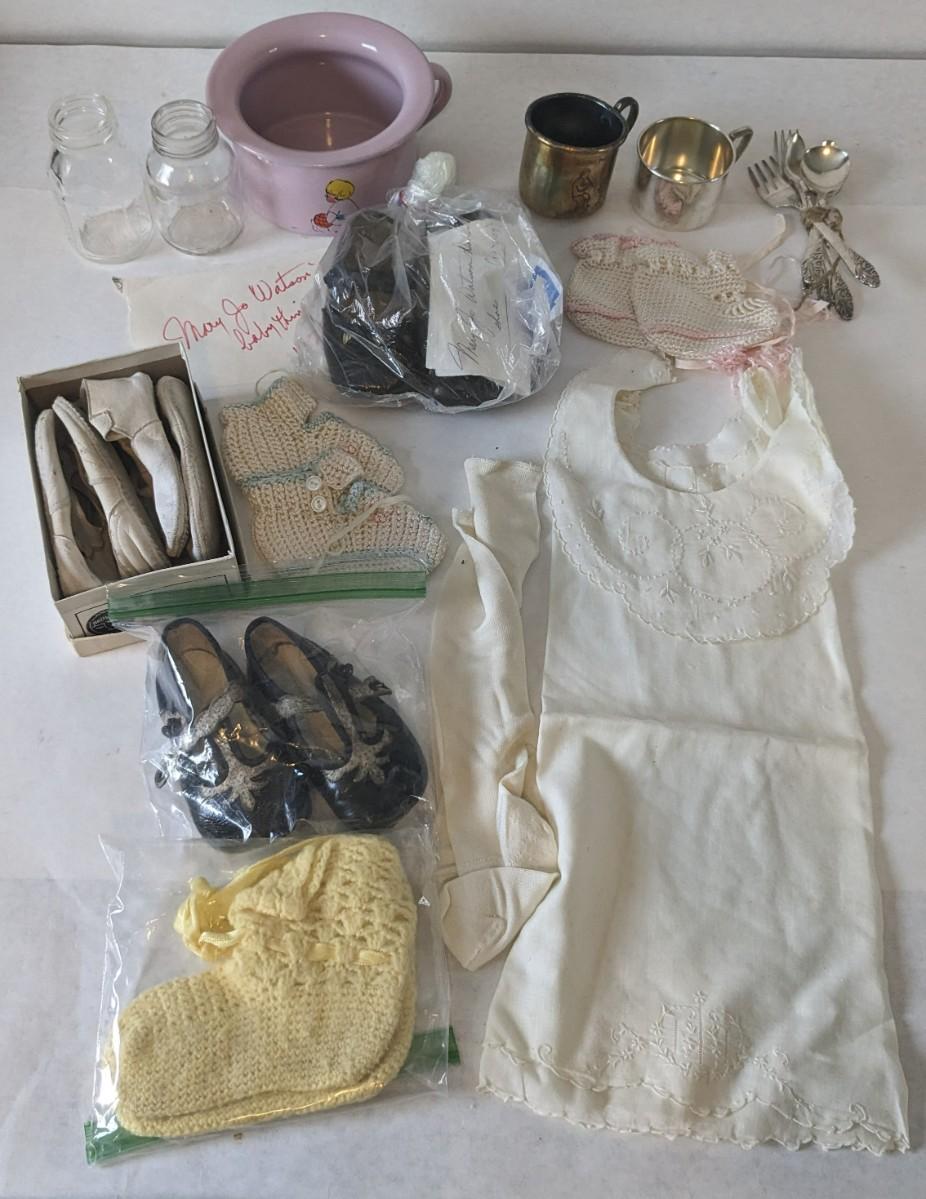 A lovely assortment of glass Even-flo and Similac baby bottles, an adorable enamel chamber pot, shoes, clothing items, and silver plate service. These items were kept in wonderful condition and are quite the items to behold.