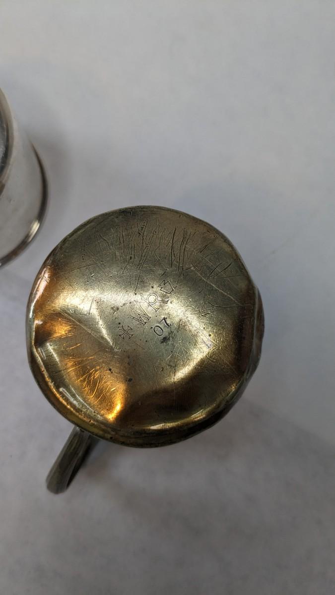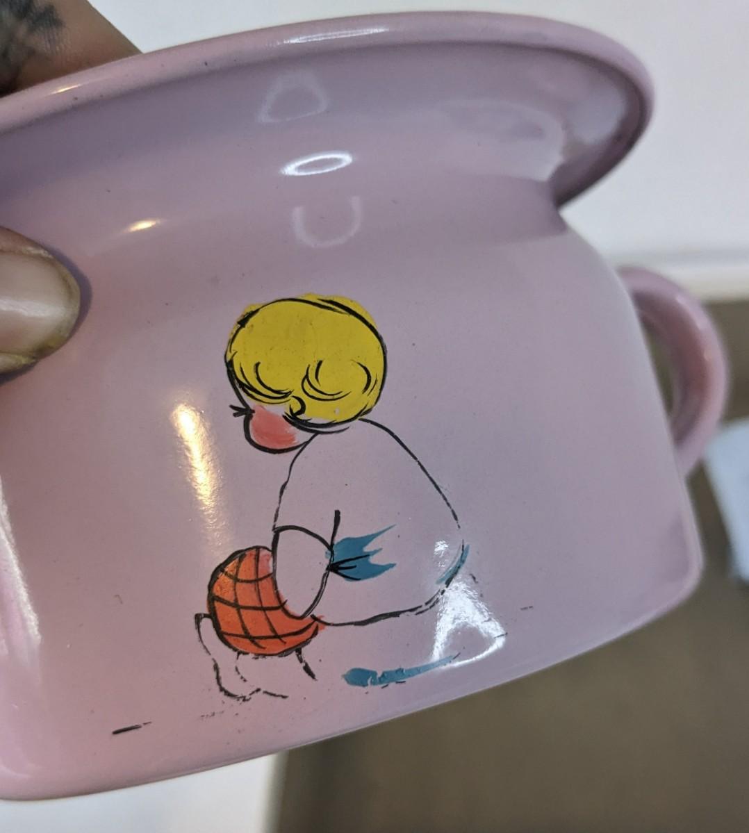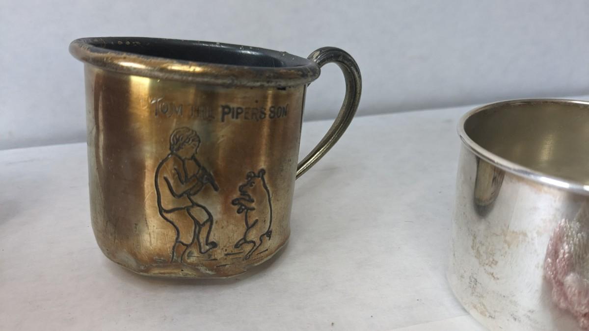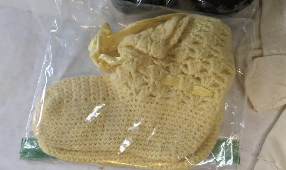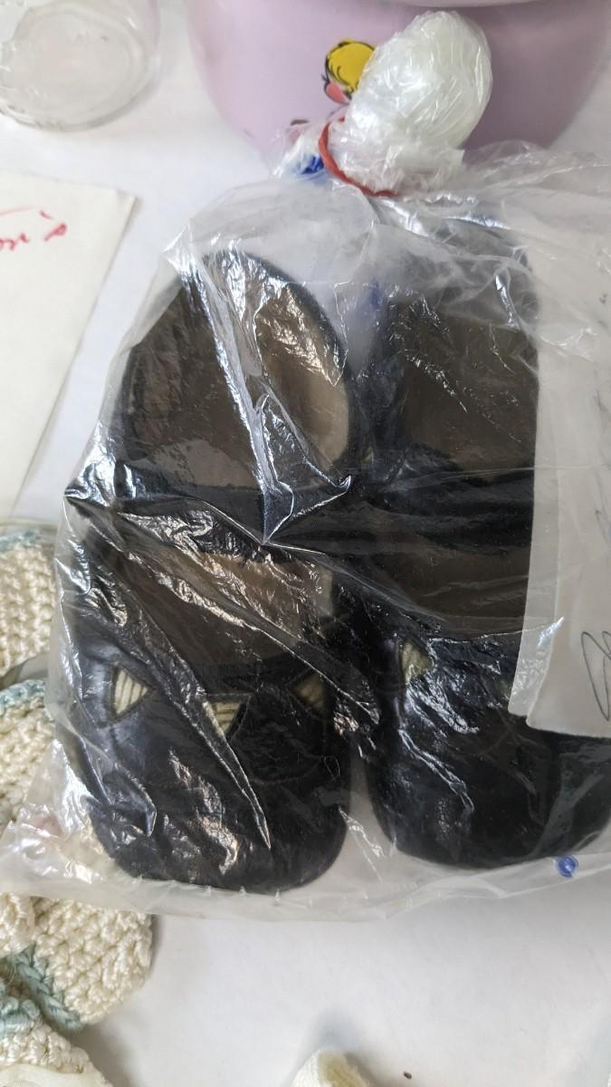 A lovely assortment of glass Even-flo and Similac baby bottles, an adorable enamel chamber pot, shoes, clothing items, and silver plate service. These items were kept in wonderful condition and are quite the items to behold.