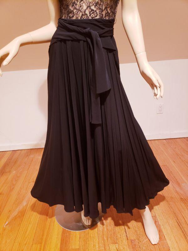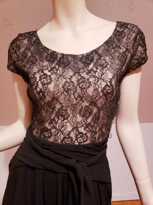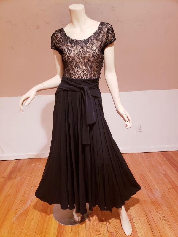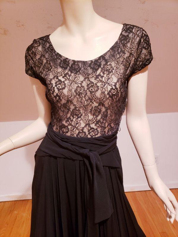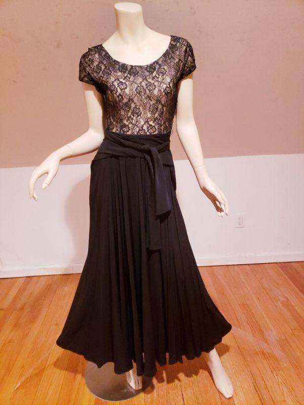 Elegant ballroom Dance gown from the 1930's . Soft crepe flowing skirt with lots of full movements. French black lace bodice with sheer natural lining forming an illusion look.