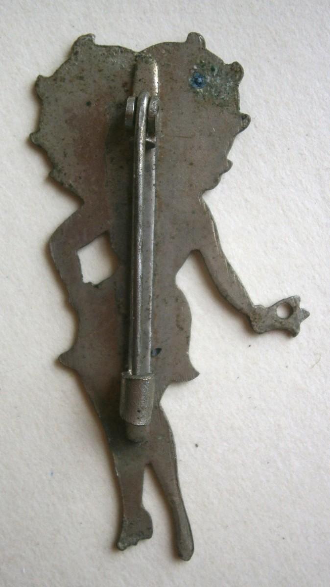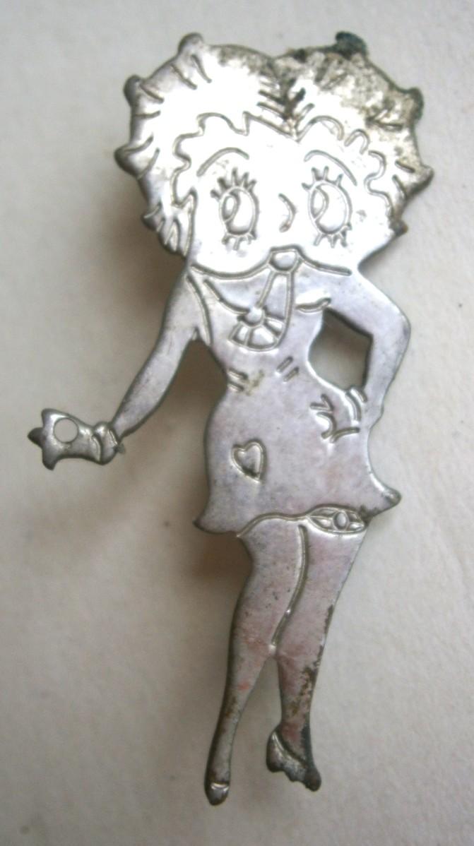 1930's Betty Boop Pin, 1 1/2 in. tall, nickel plated metal, has hole in hand - held chain that would be attached to another pin of her dog "Pudgy", good old pin.