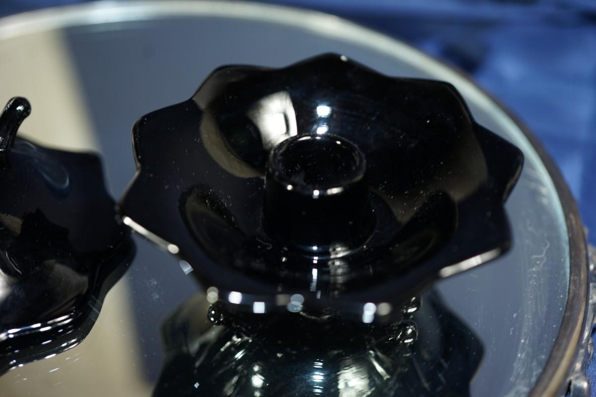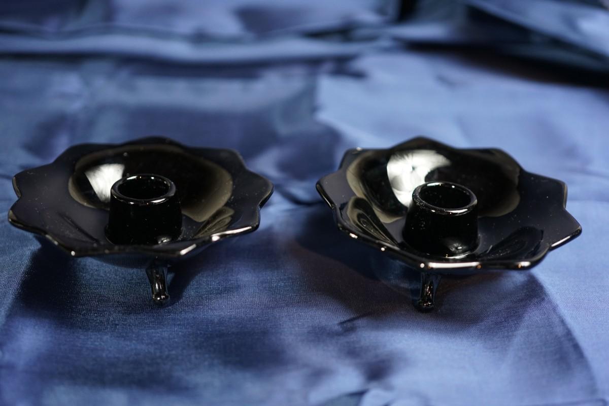 1930's BLACK AMETHYST CANDLE HOLDERS PEDAL EDGE FOOTED 4 1/2" x 1 1/2"