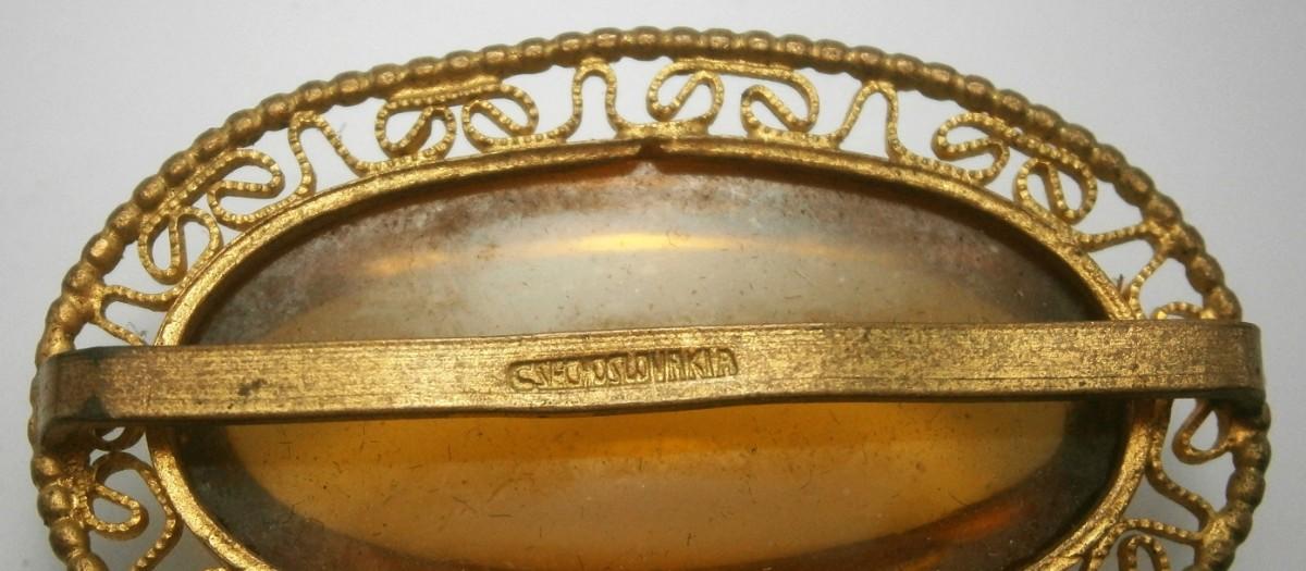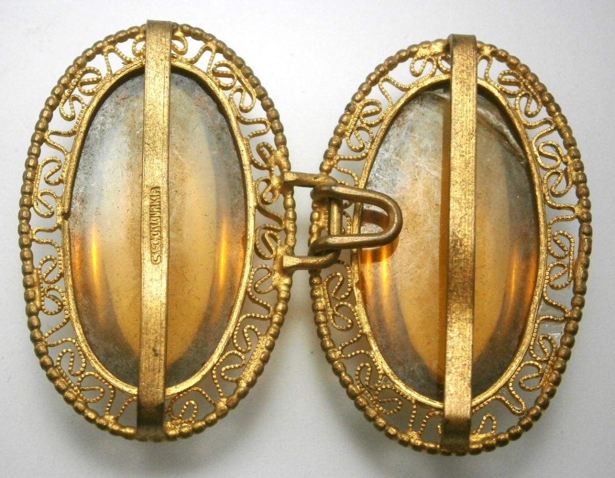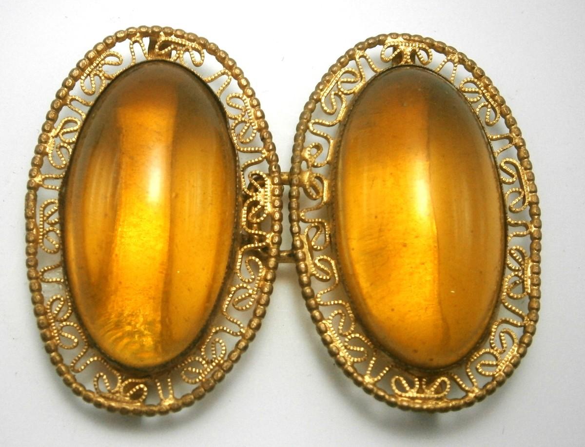 1930's Czechoslovakian Ladies Belt Buckle with yellow Honey colored simulated glass stone set in filigree frames, 1 5/8 in. tall.