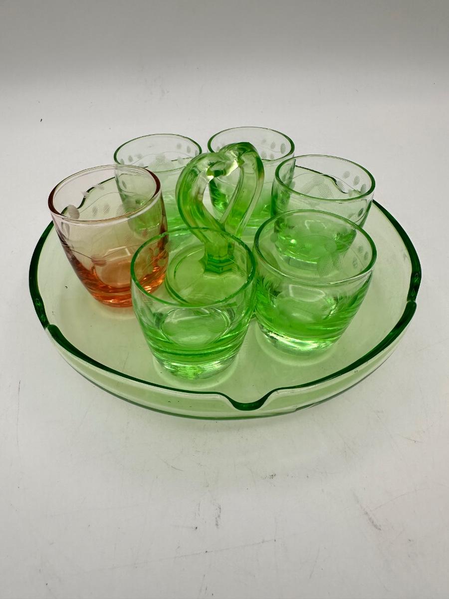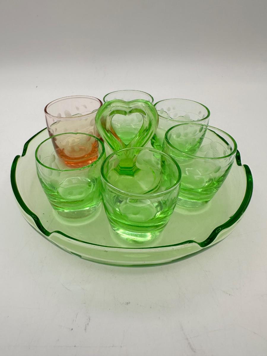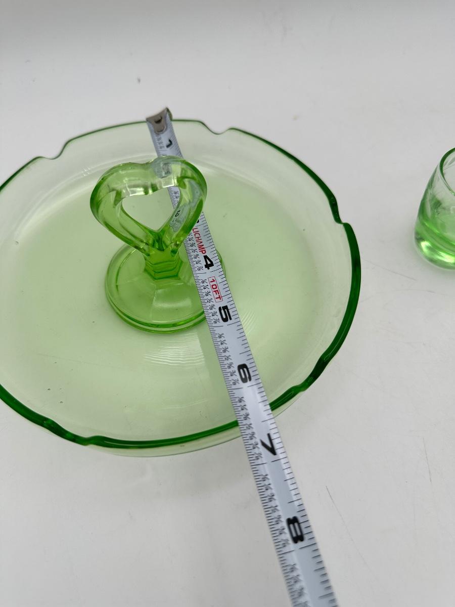 1930’s Depression glass shot glasses, ash tray caddy set, heart handle. Green glass, one pink? One shot glass chipped - see pics