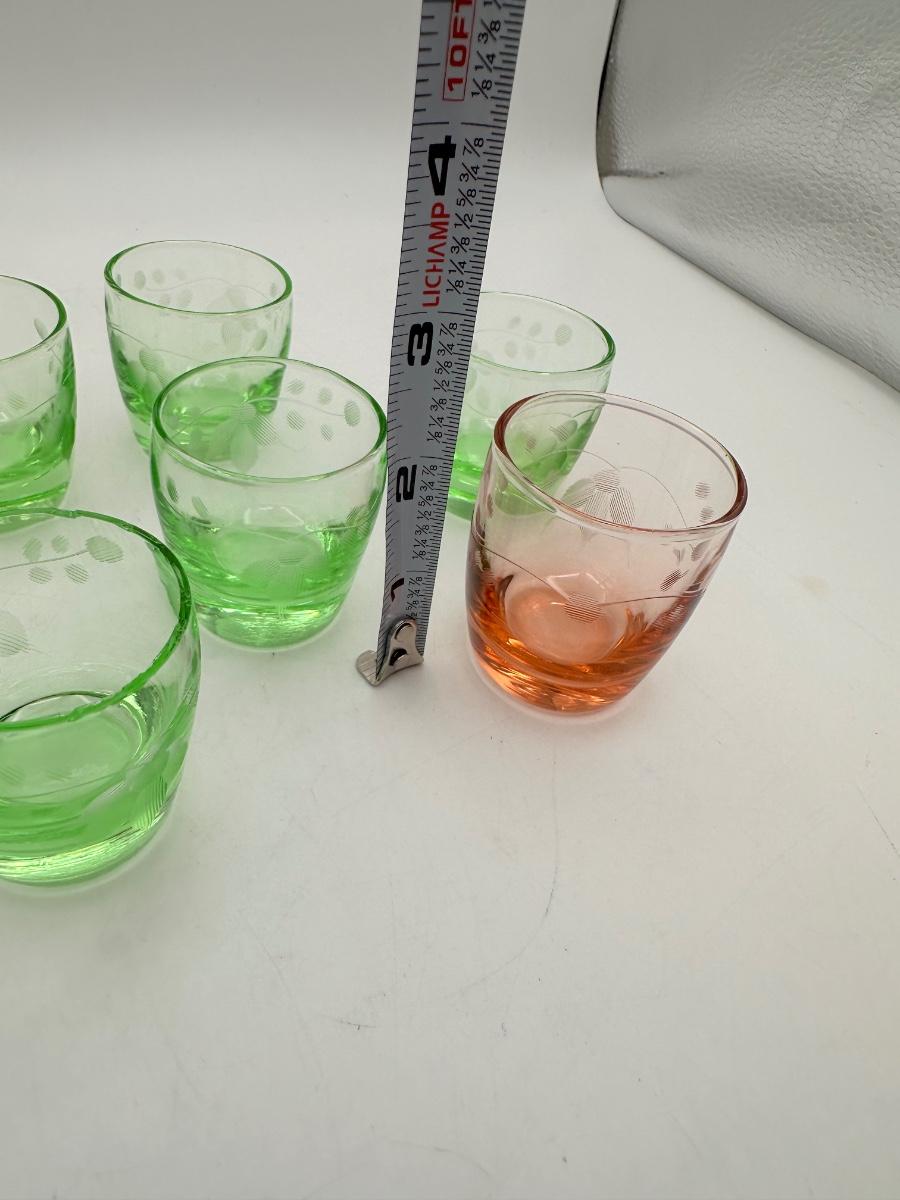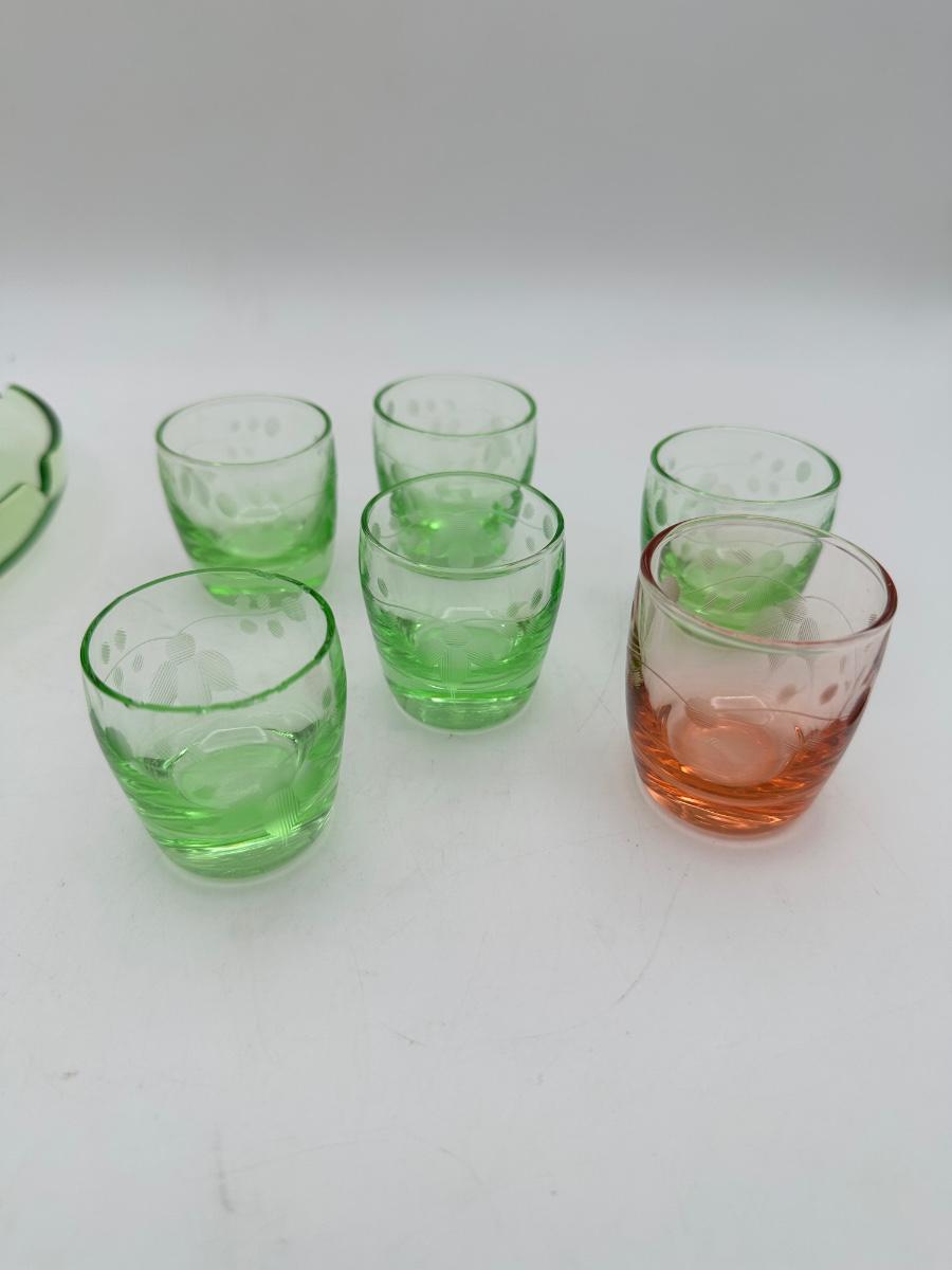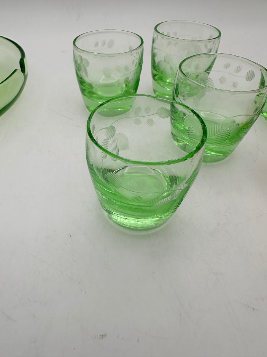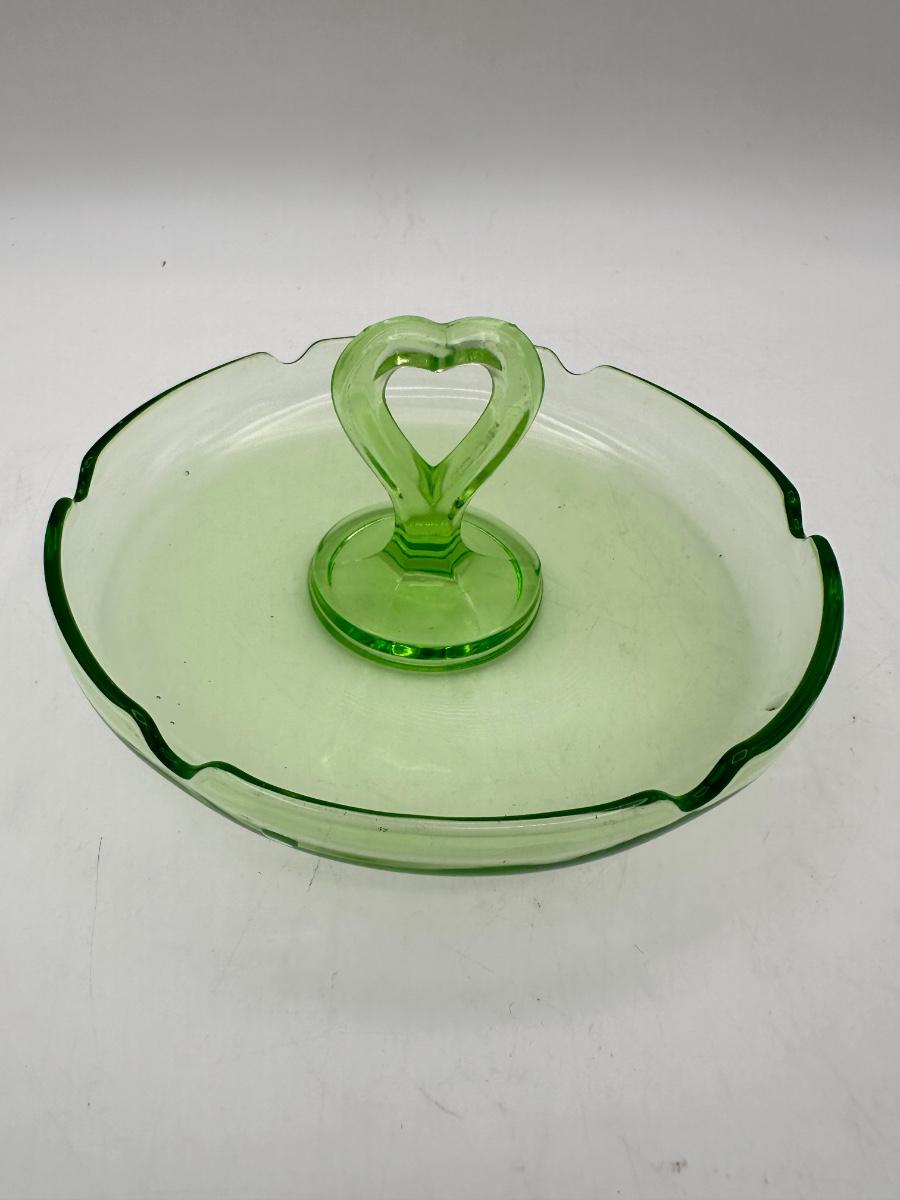 1930’s Depression glass shot glasses, ash tray caddy set, heart handle. Green glass, one pink? One shot glass chipped - see pics