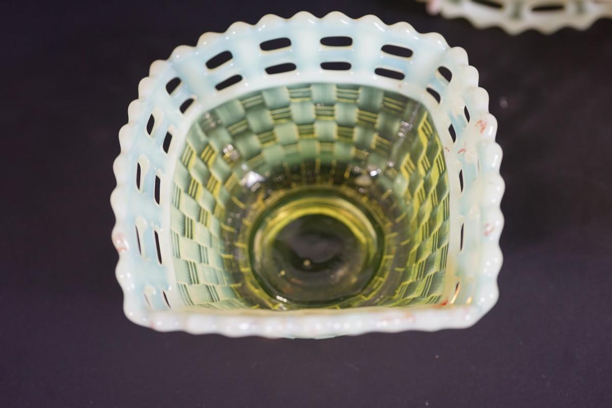 At auction is a grouping of three Fenton candy dishes in the basket weave pattern,