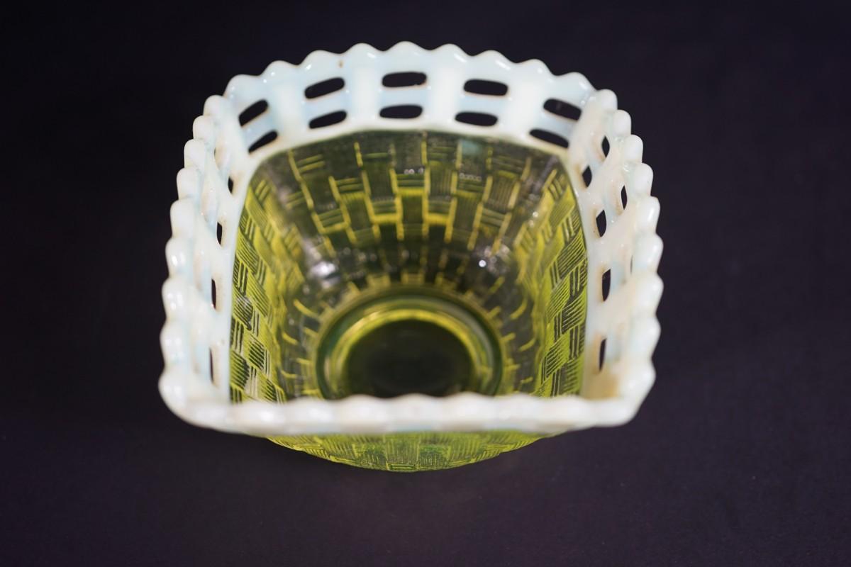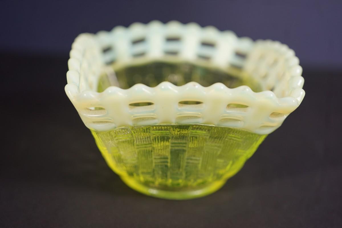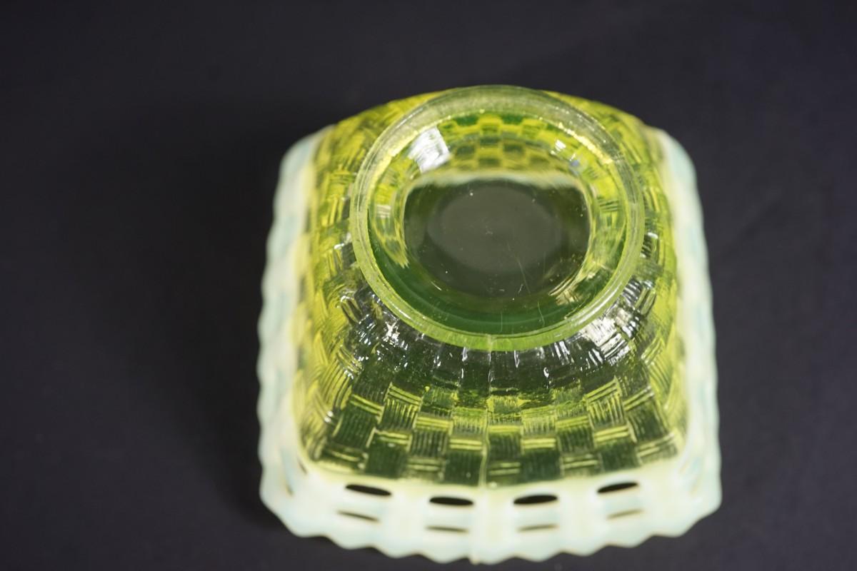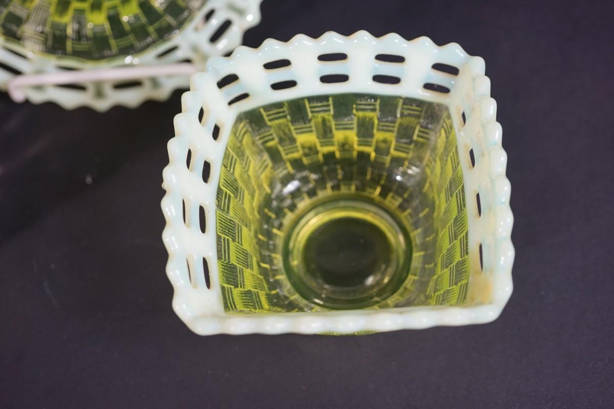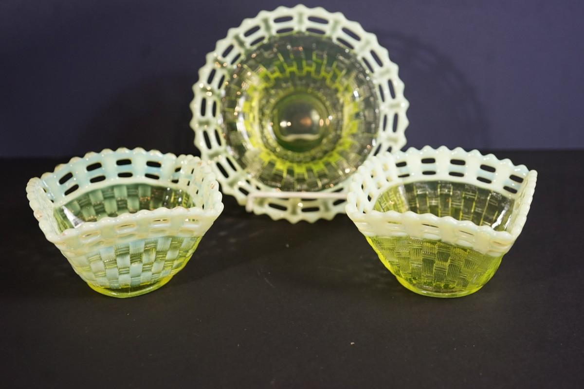 1930's FENTON BASKET WEAVE PATTERN YELLOW GLASS PEARLINE EDGE CANDY DISH SET (3)-URANIUM