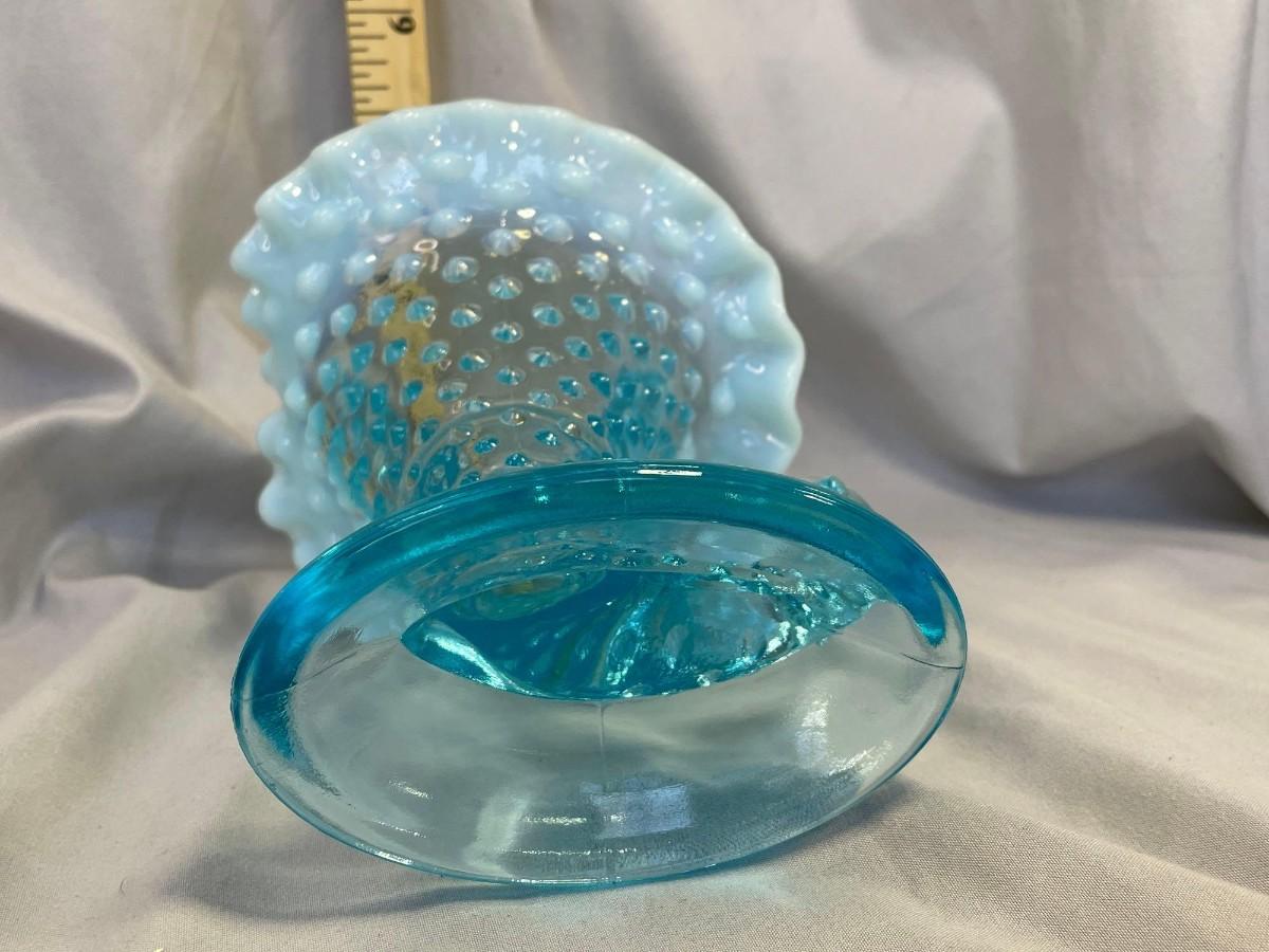 This ruffle-edged, hobnail pattern candlestick holder is in excellent condition. It is from the paper label era and most of what I could find places it in the 1930s.<br />