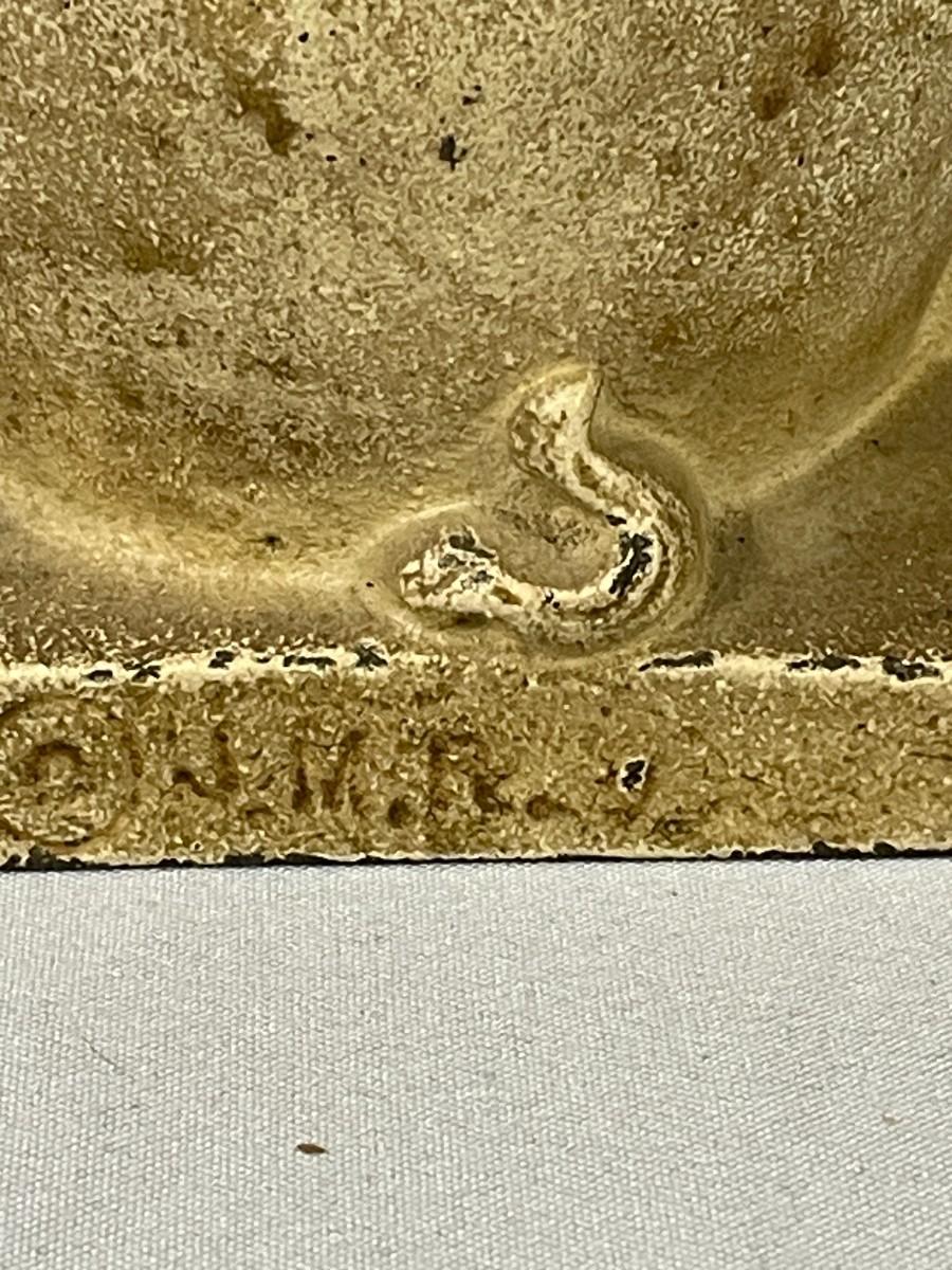 This back is embossed J.M.R. on the back of the base and Thrifty on the front of the base. It is about 6.75" tall and made of cast iron. Hubley produced the bank with J.M.R. on it between 1930-1945.
