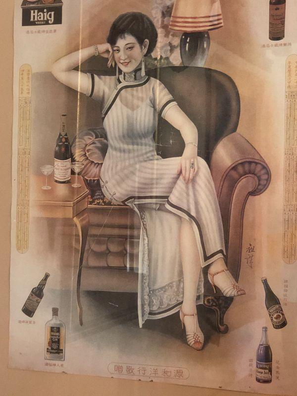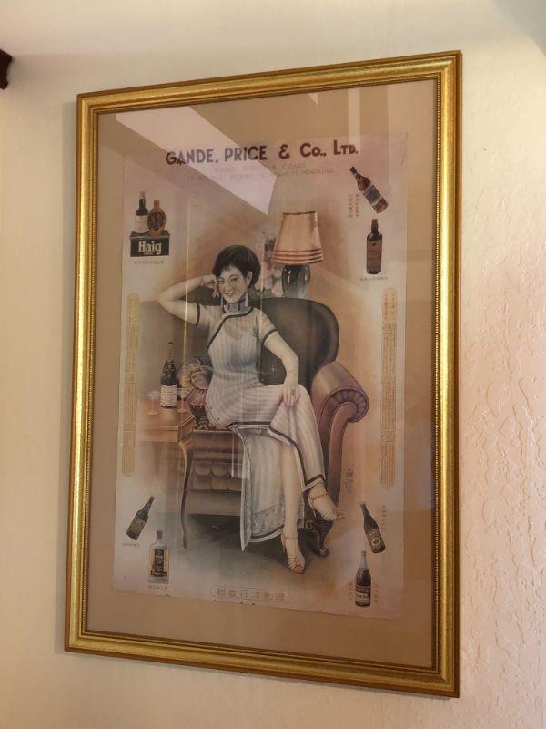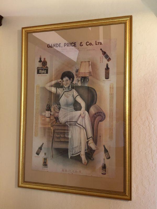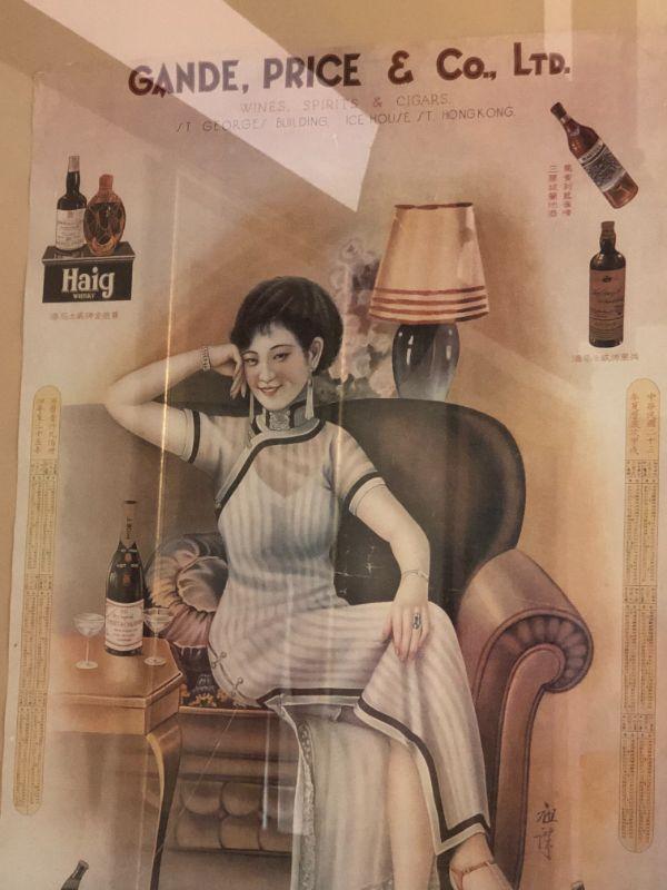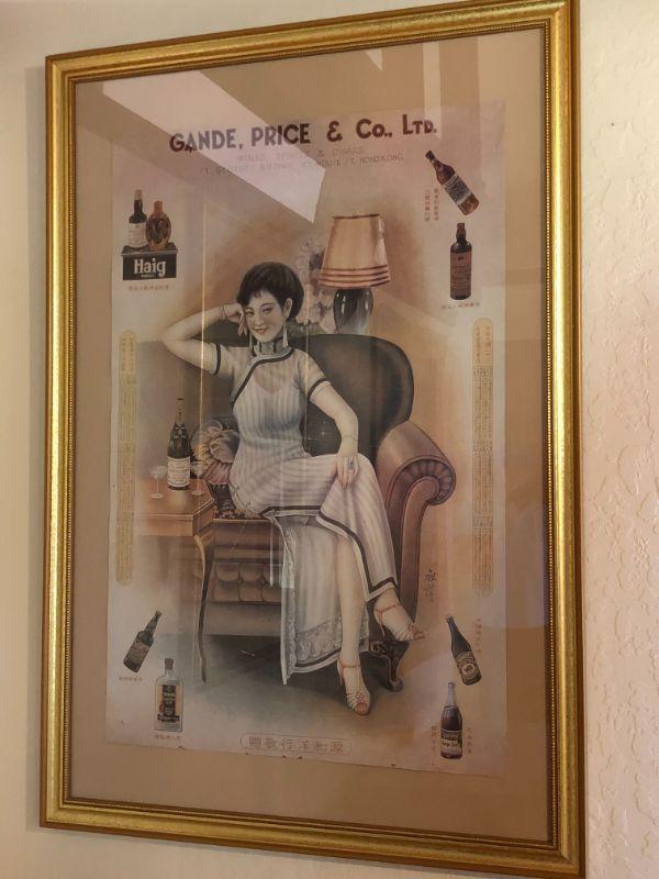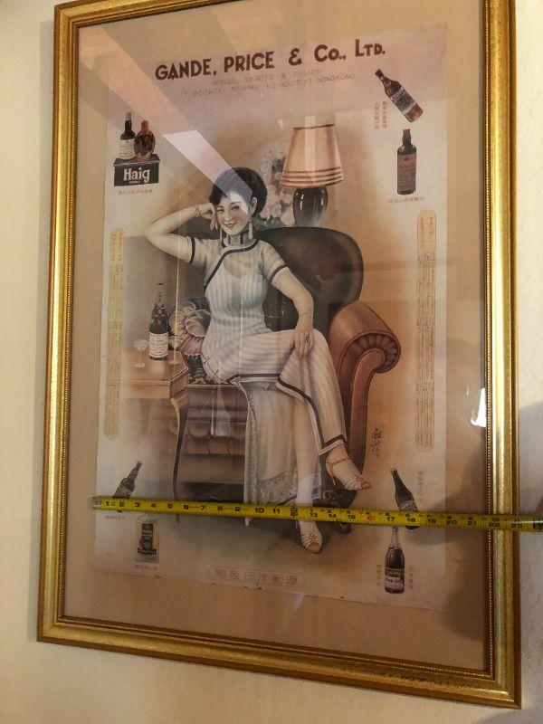Beautiful vintage "Gande, Price & Co Ltd" advertising poster with a beautiful woman in full length dress with slit. In very good used condition, and set in a lovely gold frame. The "Shanghai Girls" advertising posters were used as advertisements during the 1930s in Shanghai . The women used in these posters were considered the height of fashion in their time.