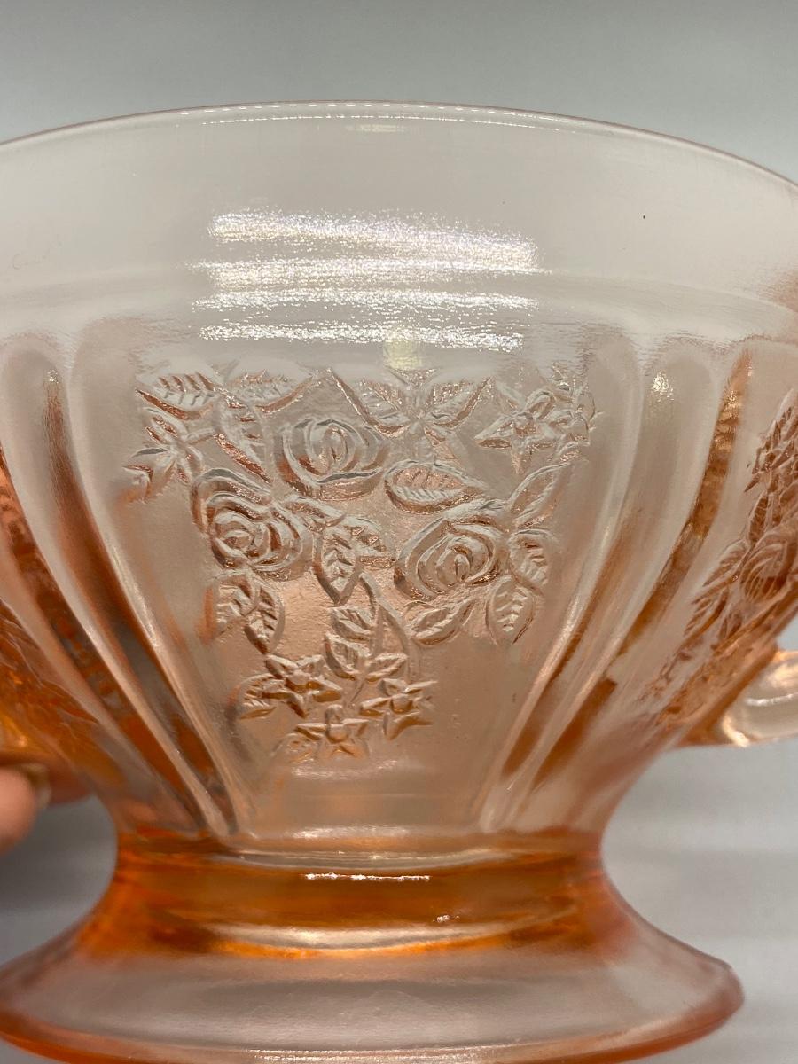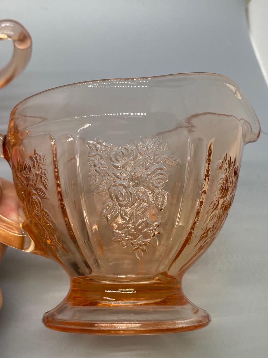 1930's Sharon Cabbage Rose Footed Cream & Sugar Set Pink Depression Glass Set. In good condition, no chips found.