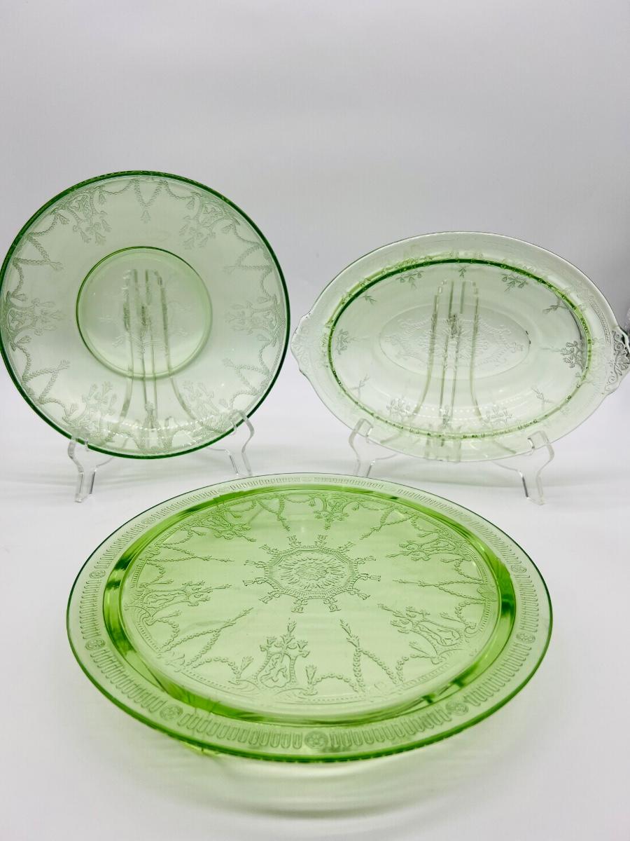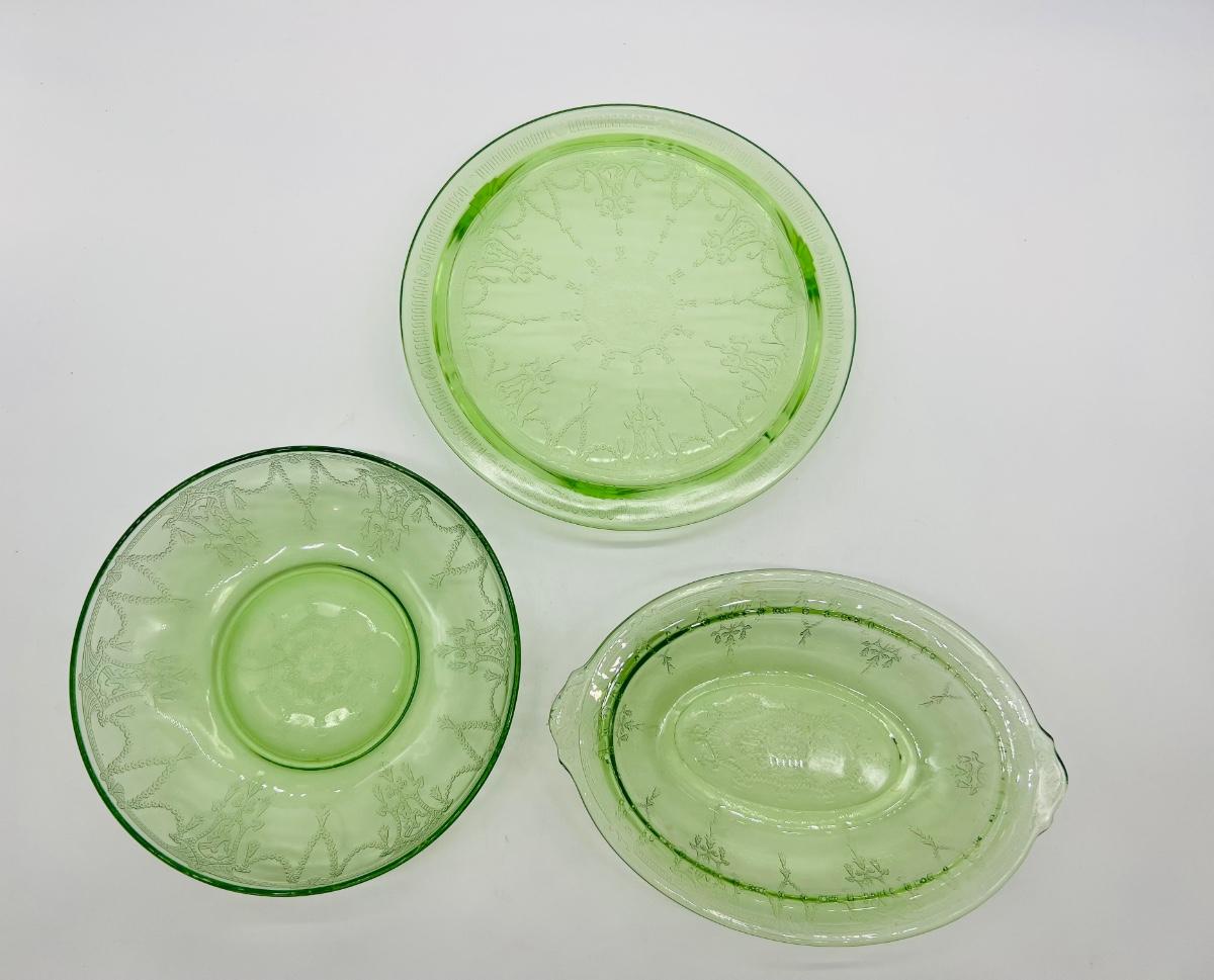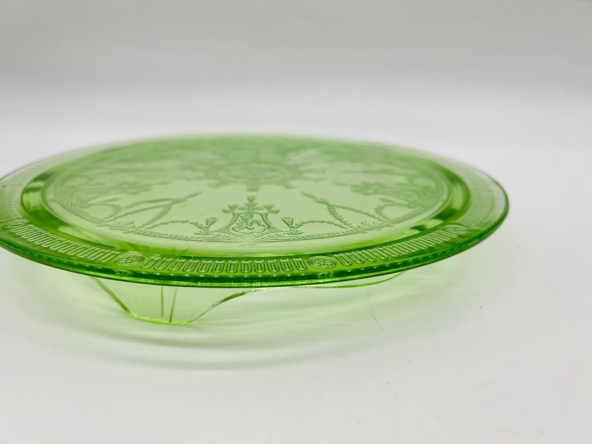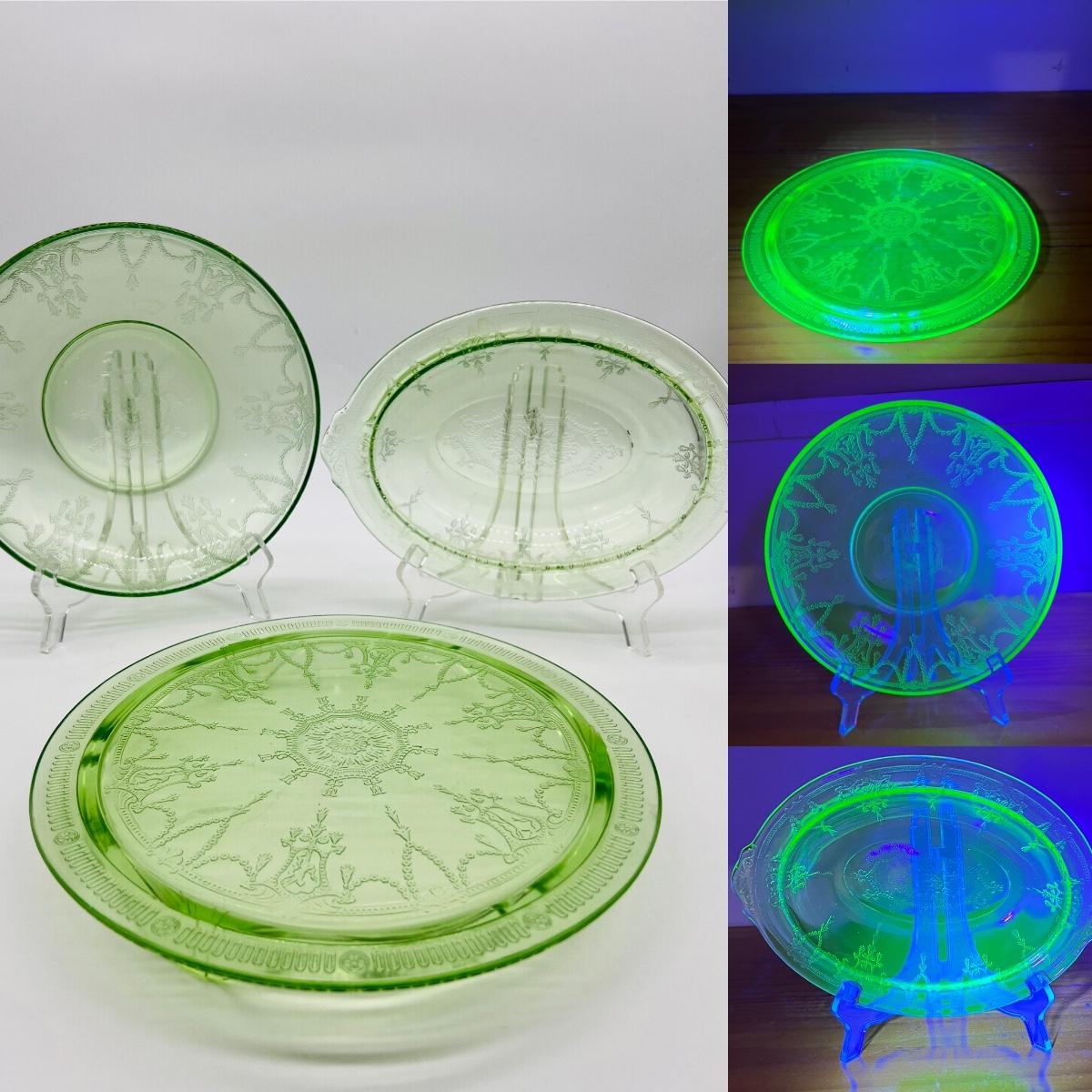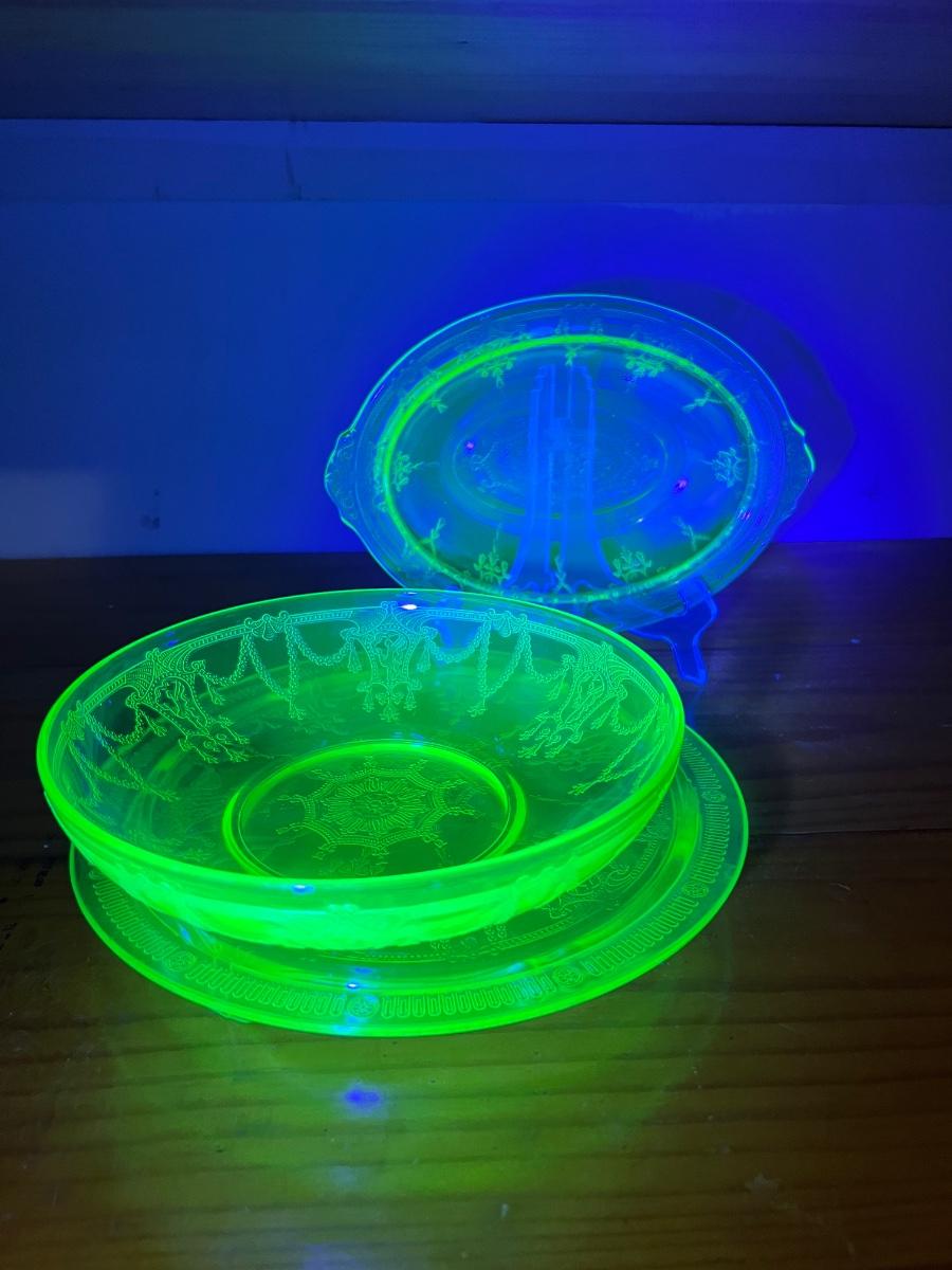 Circa 1930s(?) Uranium Ballerina/Cameo Design Glass, footed cake plate, double handed serving bowl. All vintage uranium UV reactive depression glass.