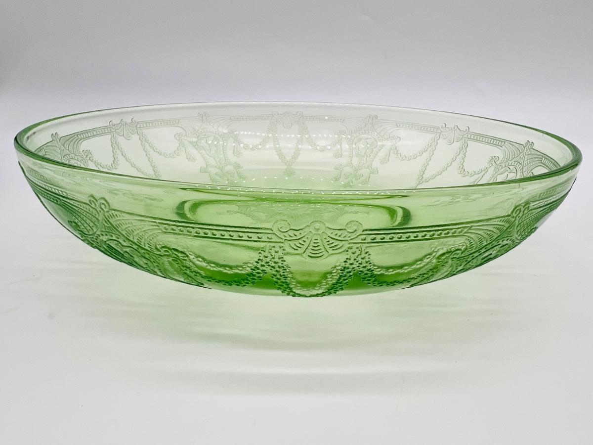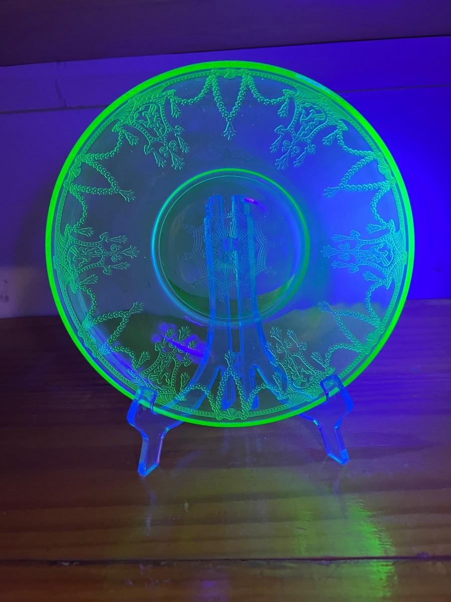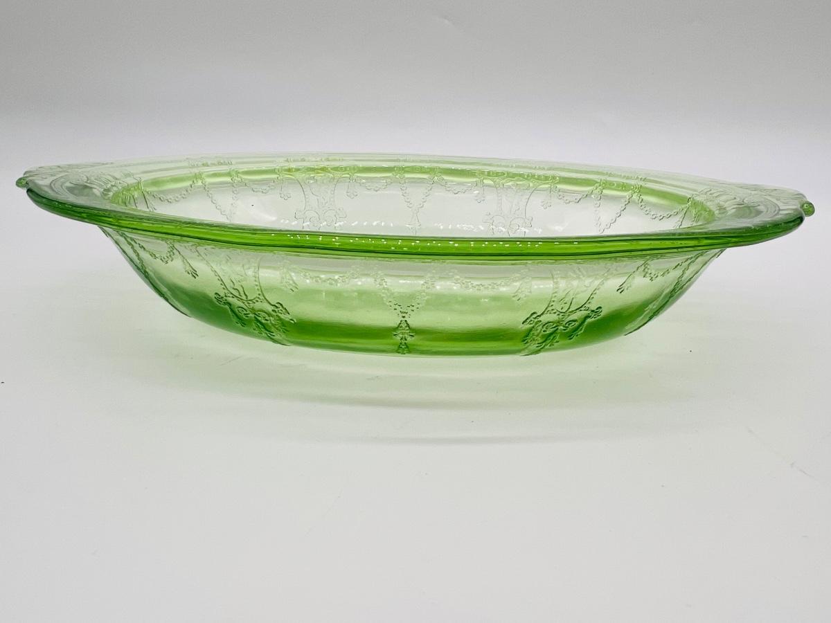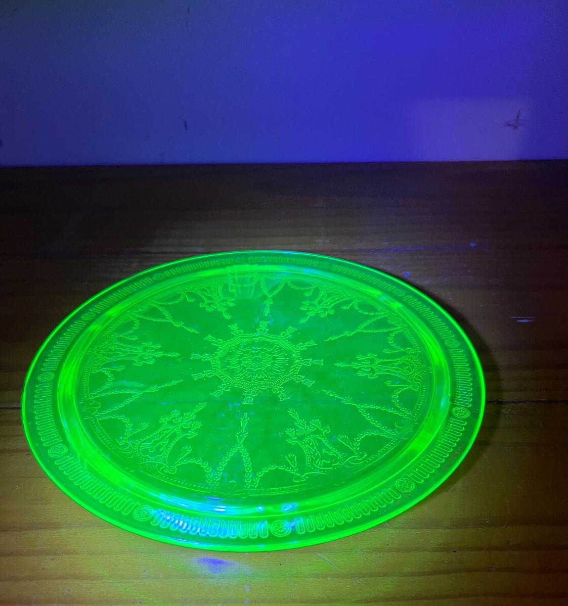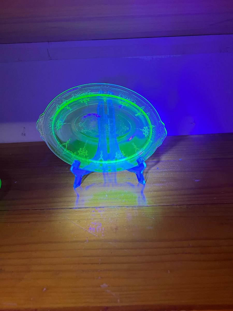 Circa 1930s(?) Uranium Ballerina/Cameo Design Glass, footed cake plate, double handed serving bowl. All vintage uranium UV reactive depression glass.