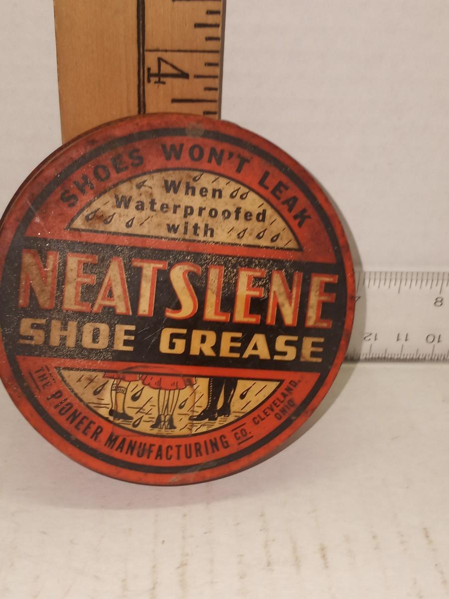 1930s USA Vintage Boot Shoe Grease Tin NEATSLENE PIONEER MANF. CLEVELAND OHIO