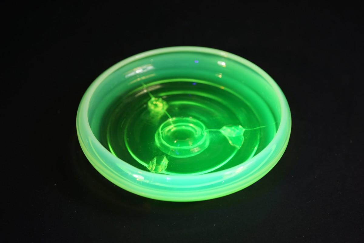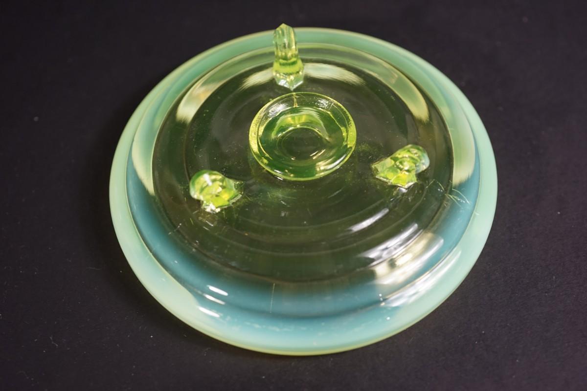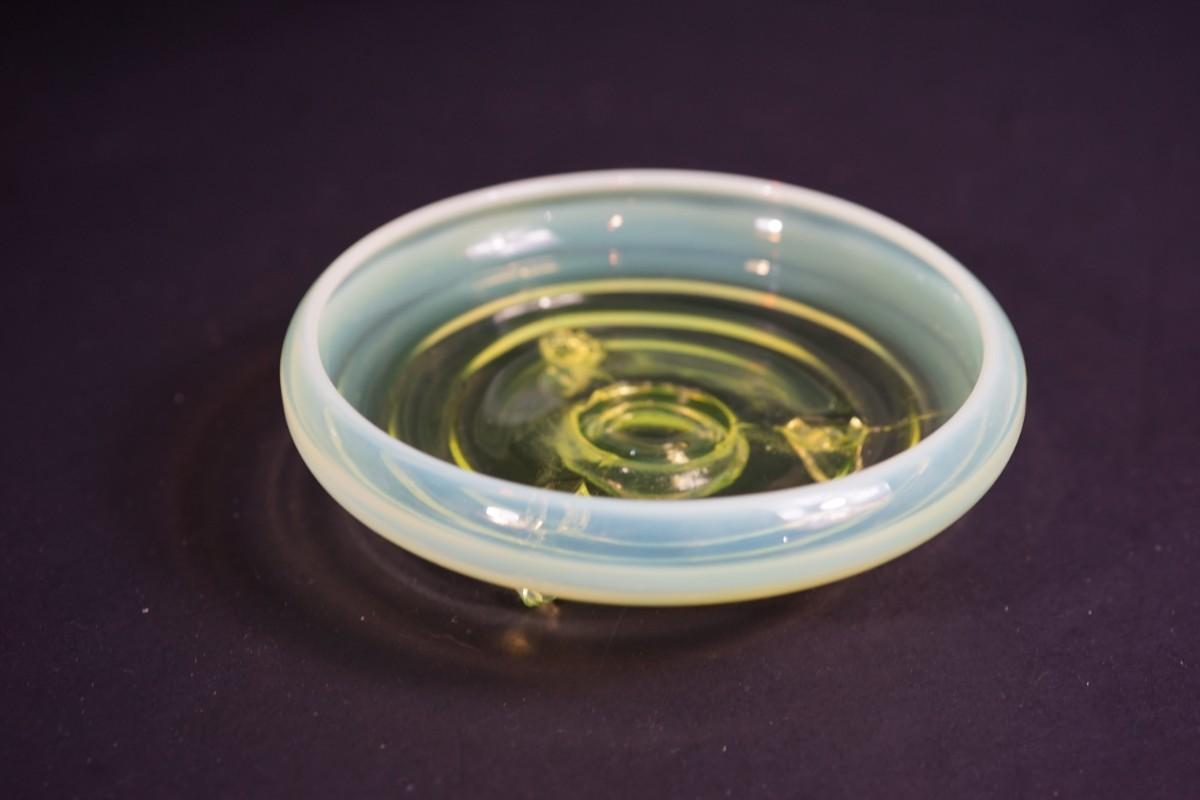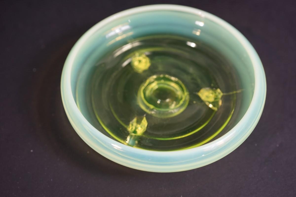 6" low bowl of 2" in height . Vaseline glass with an opalescent rim,