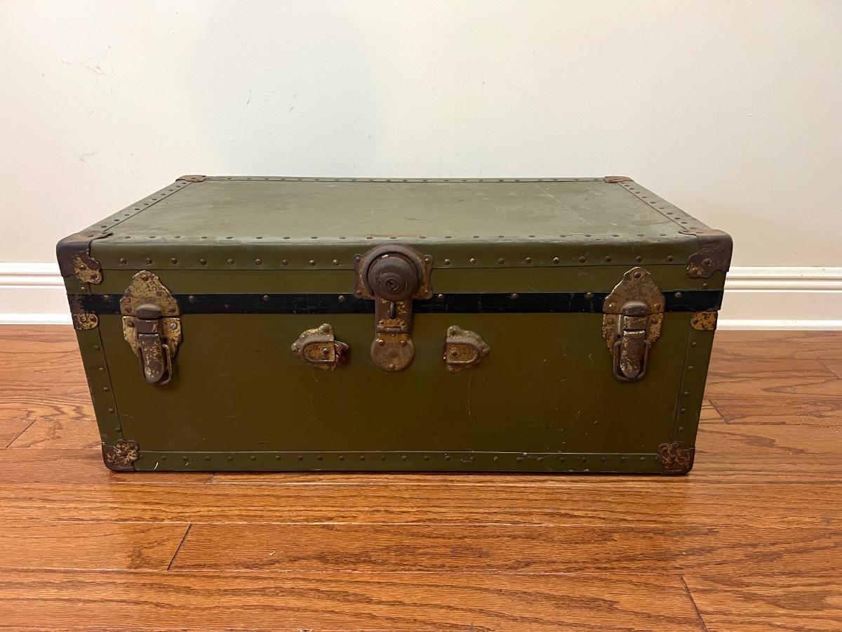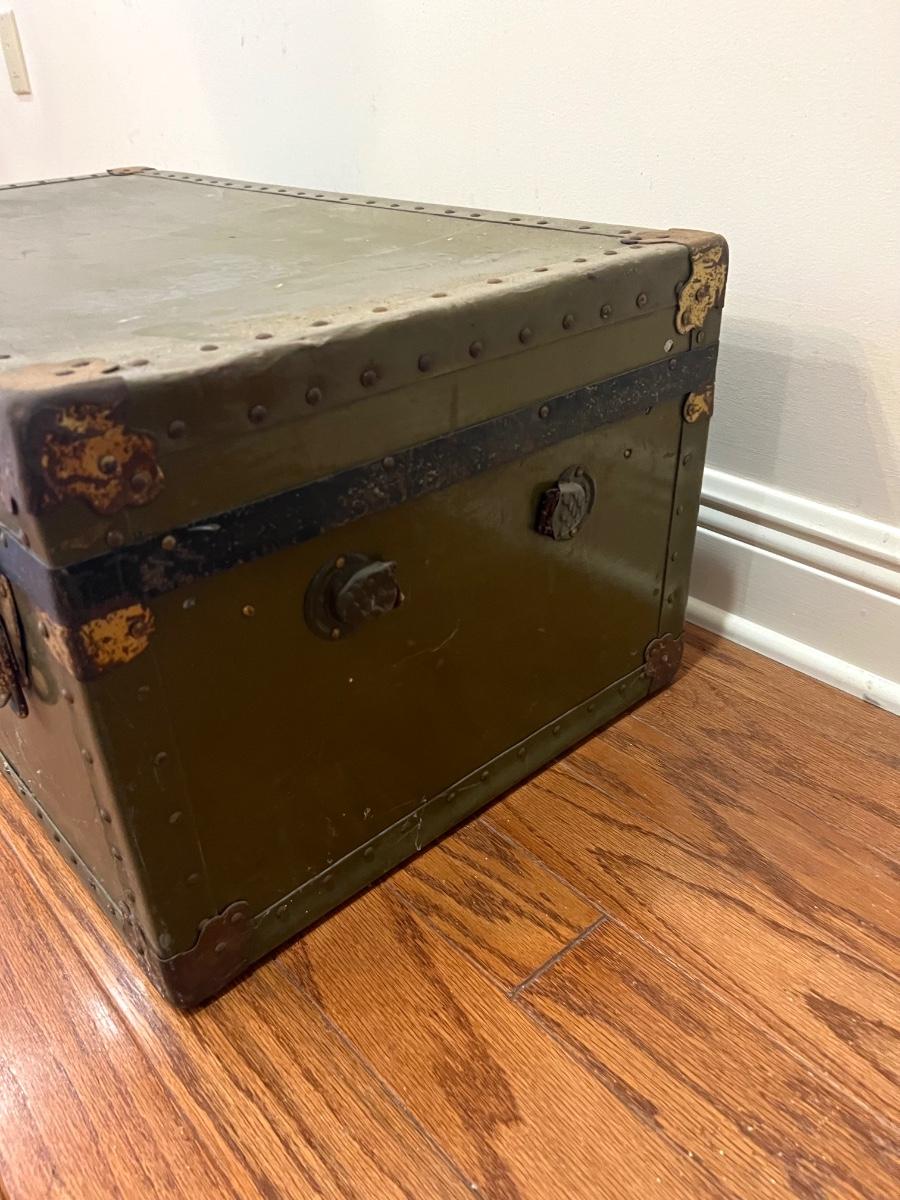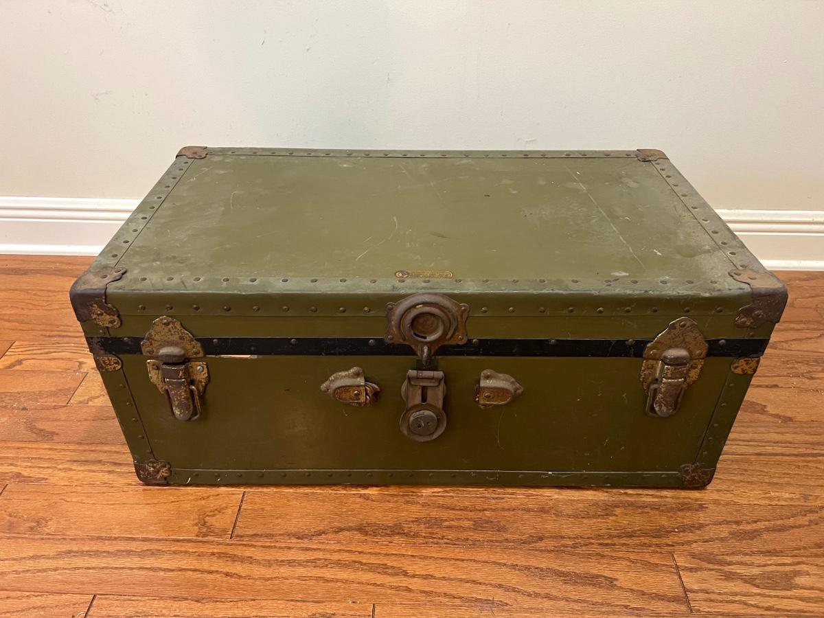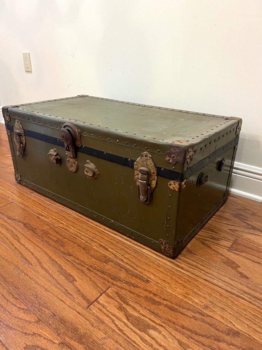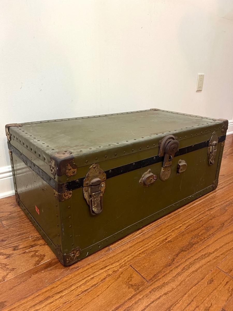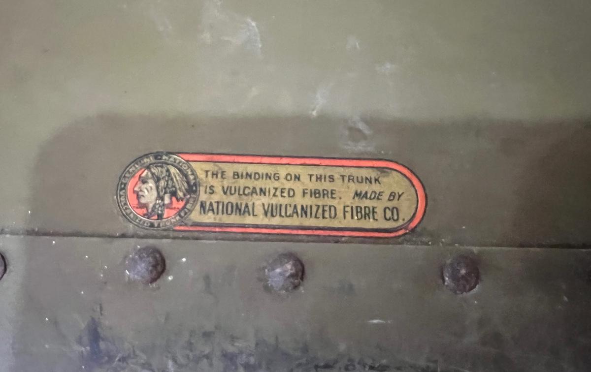 This army green chest is a genuine National Vulcanized Fibre Co. Trunk. See