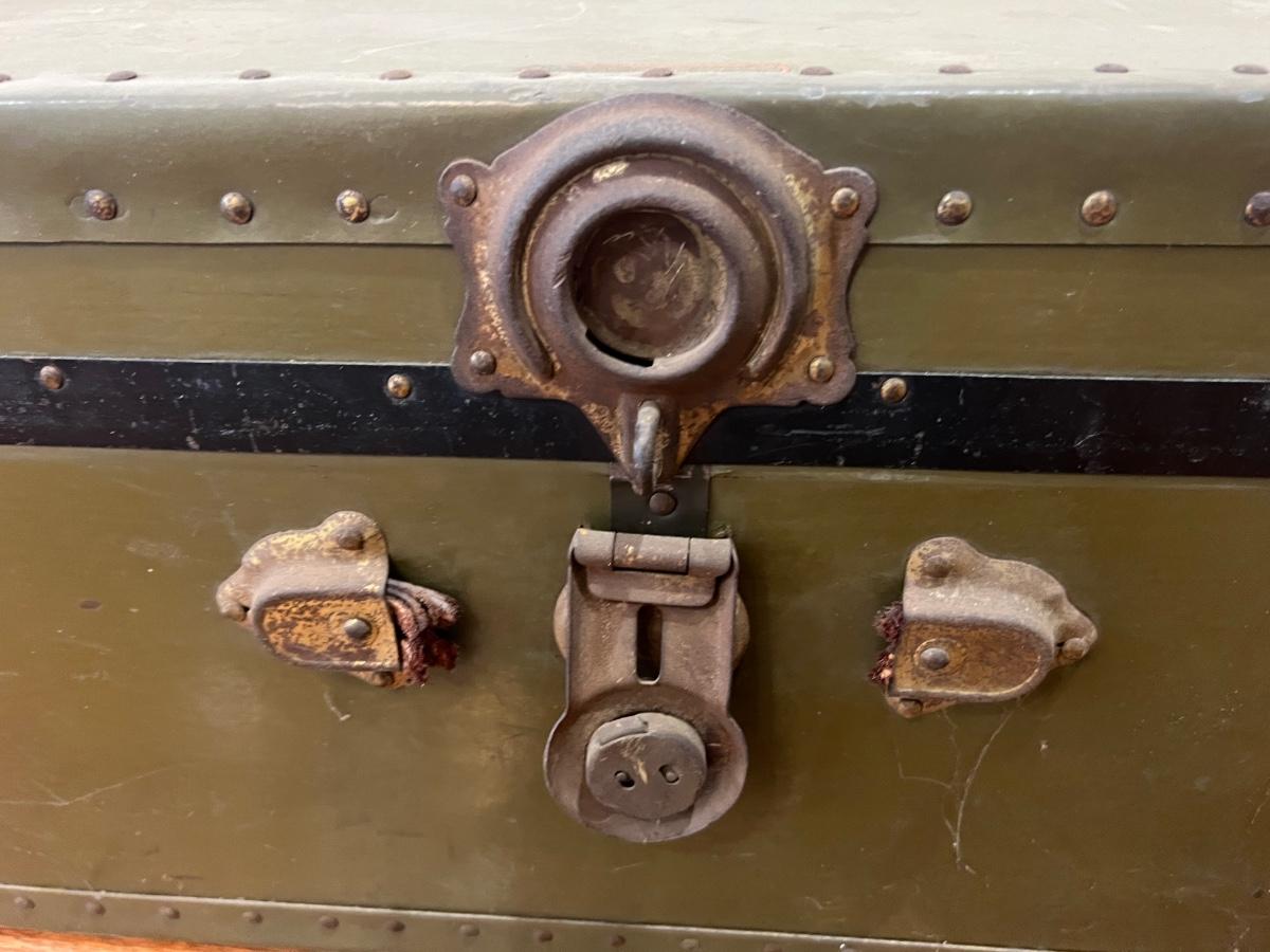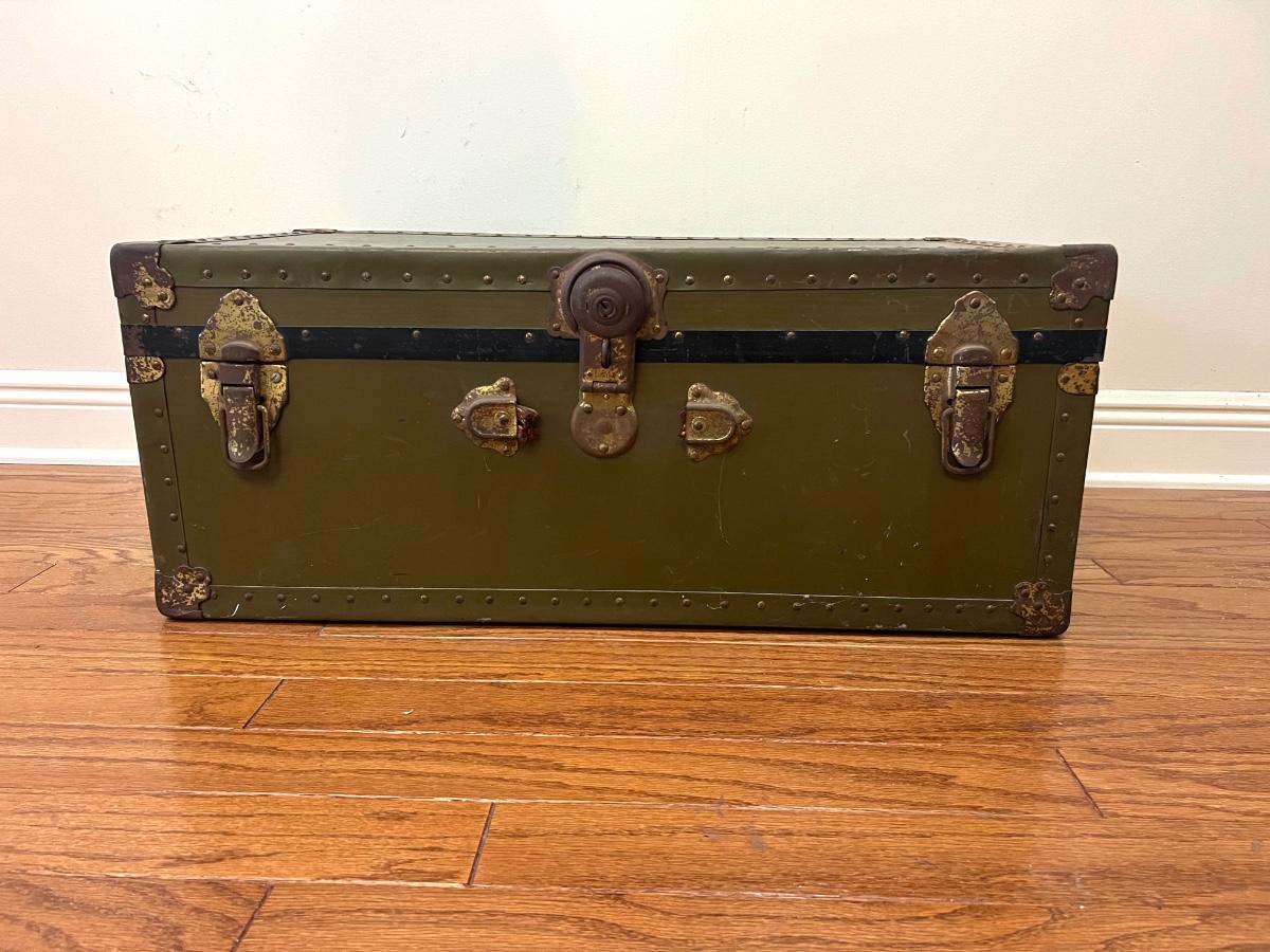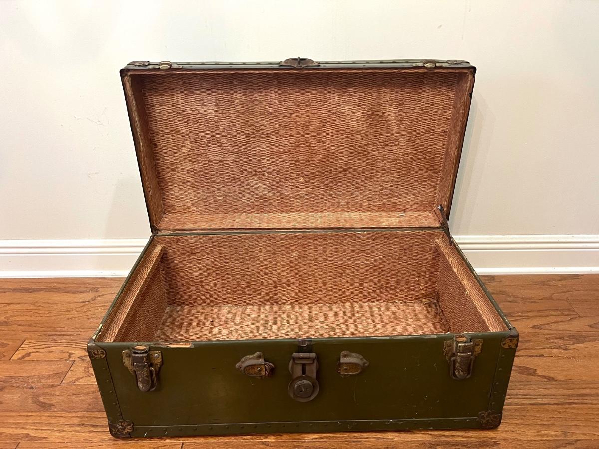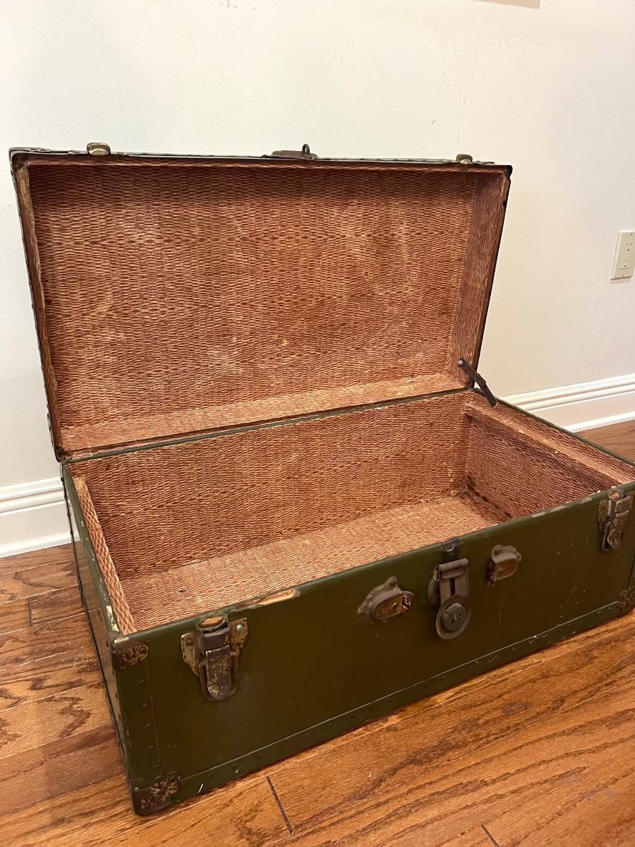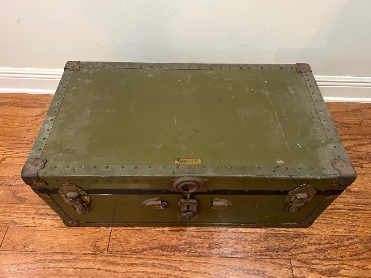 This army green chest is a genuine National Vulcanized Fibre Co. Trunk. See