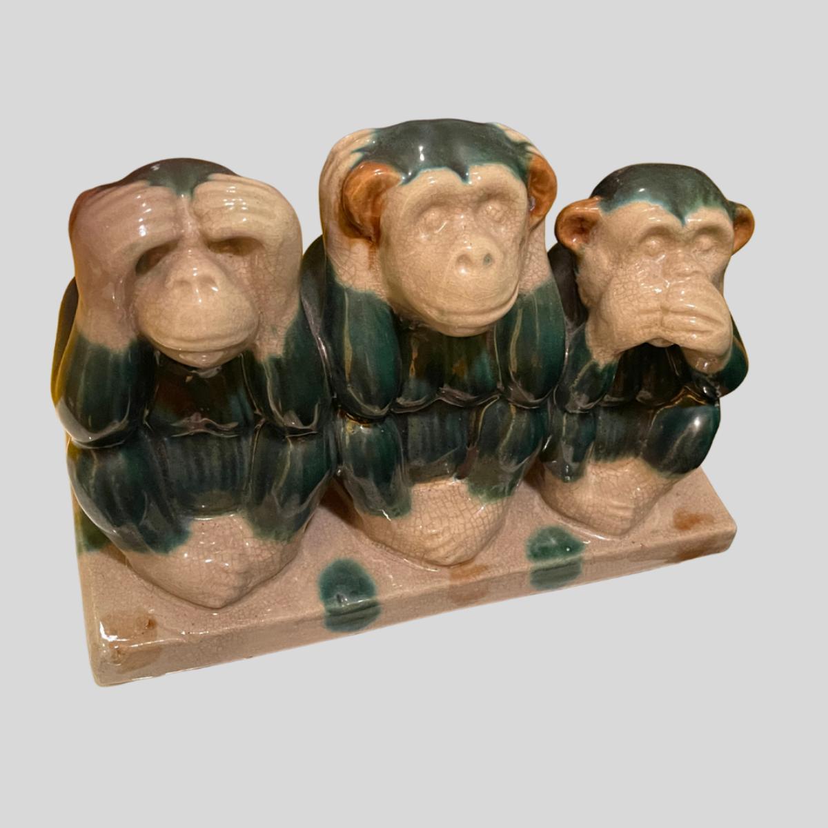 This item is for a vintage 1930s/40s Italian majolica-style statue of Three monkeys; See no evil, speak no evil, hear no evil. The color is green with amber and ivory. Beautiful glaze overtop. Very heavy piece, great for a shelf of mantle.