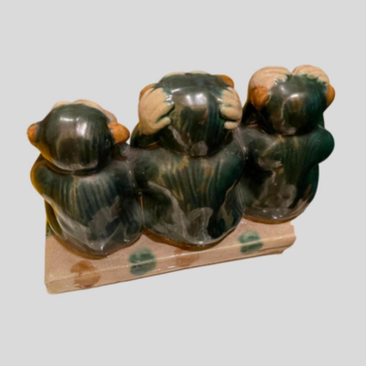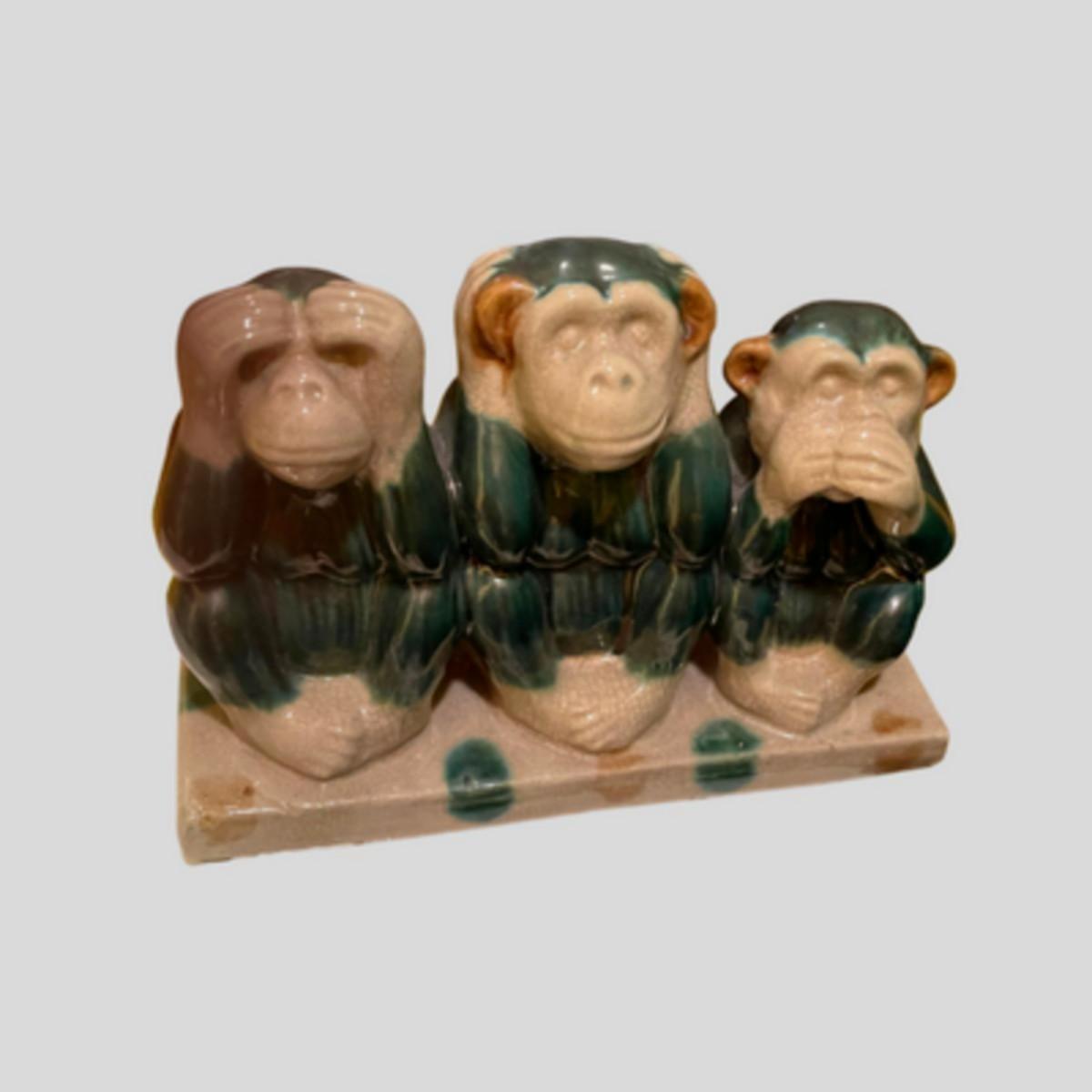 This item is for a vintage 1930s/40s Italian majolica-style statue of Three monkeys; See no evil, speak no evil, hear no evil. The color is green with amber and ivory. Beautiful glaze overtop. Very heavy piece, great for a shelf of mantle. It does appear to have a signature on the bottom and measures 11.75" wide x 5" deep x 7.75" tall.