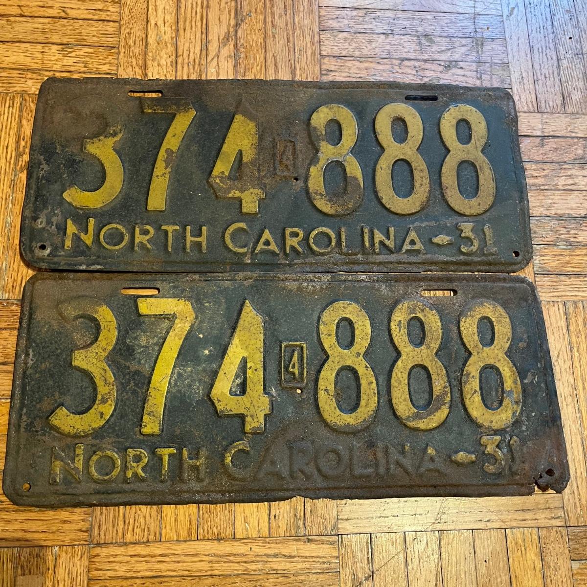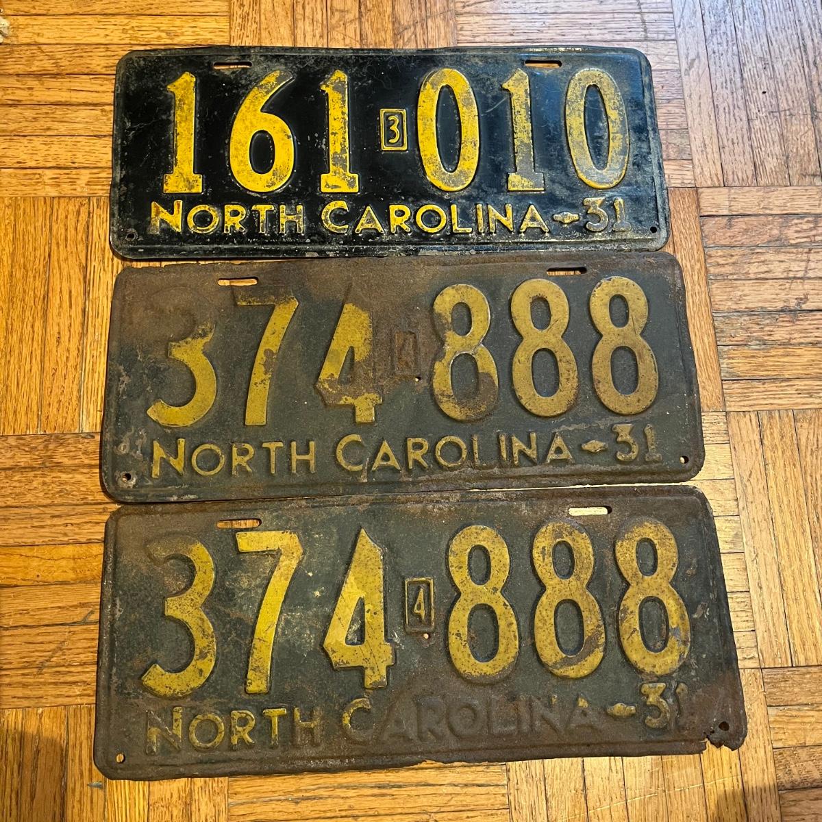 Lot includes a pair of 1931 North Carolina license plates with the same numbers and one individual 1931 North Carolina license plate.