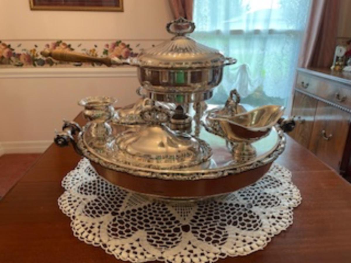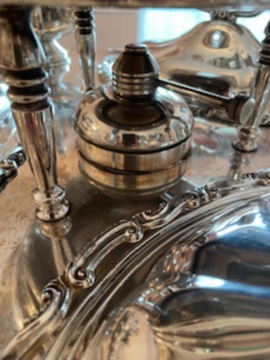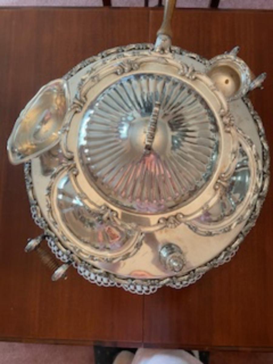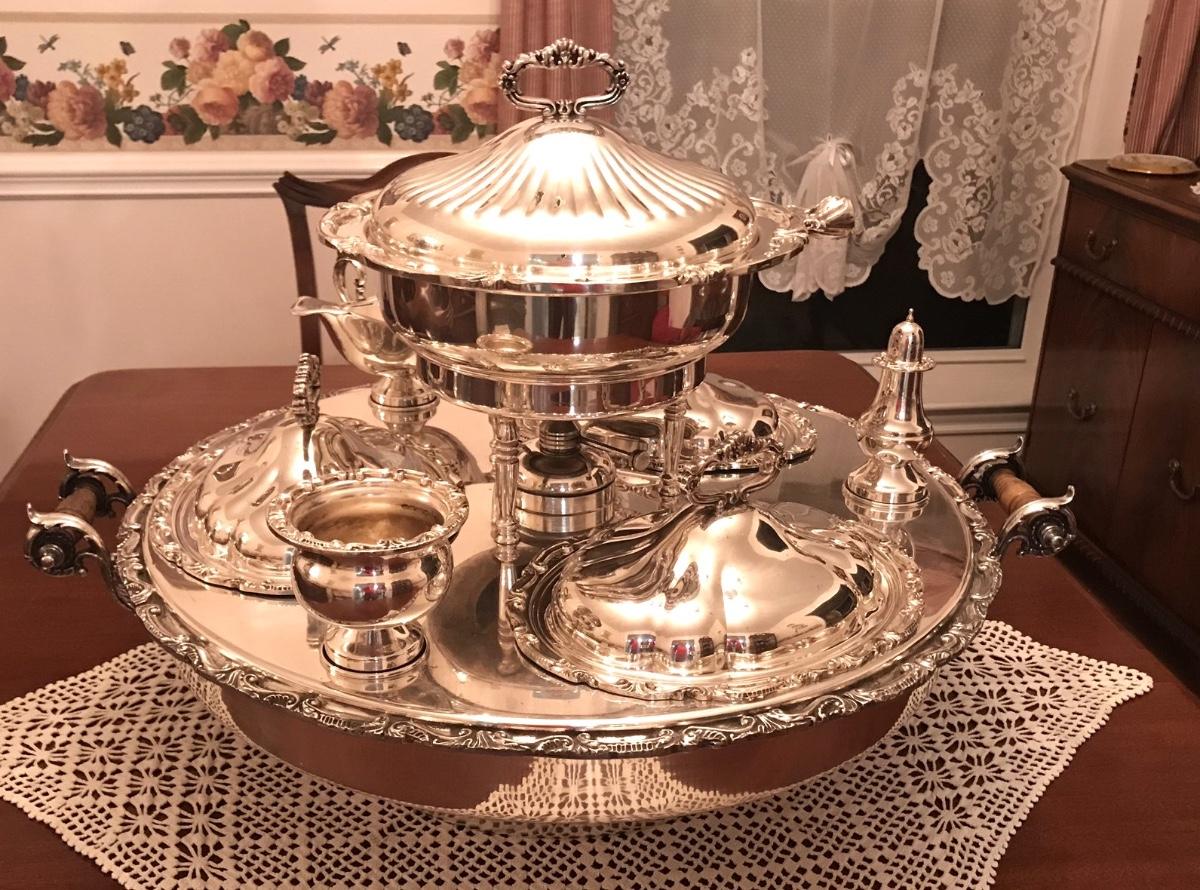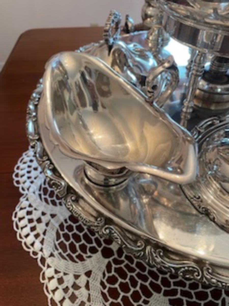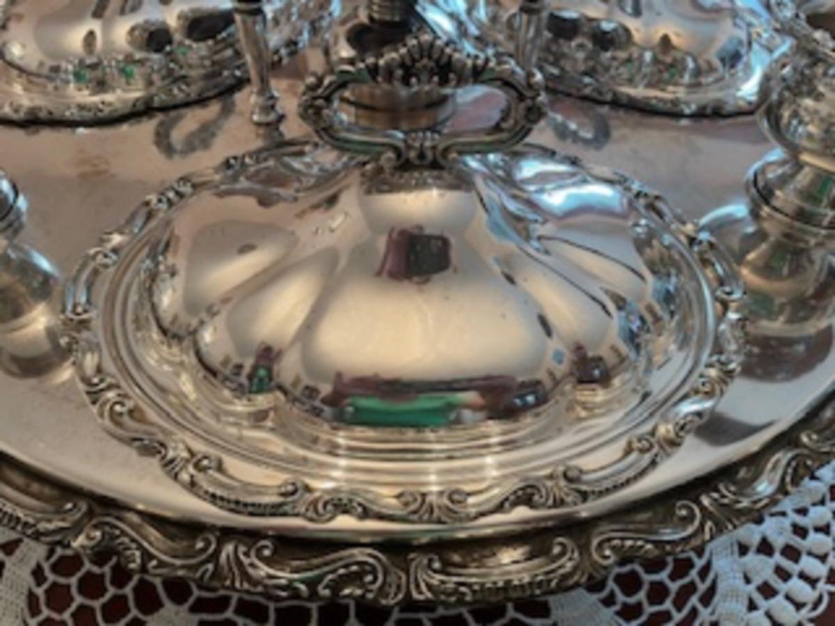 1932 Goldfelder Silver Co. Silver Plate Georgian Style Lazy Susan Dumbwaiter Server with Scroll & Shell Molded Lids. Comprises of 2 Handled Round Hot Water Basin on Lazy Susan Pedestal Base, Fitted with Center Footed Soup Tureen with Lid & Water Basin, 3 Oval Covered Entrée Dishes, Salt/Pepper Shaker, Footed Handled Gravy Boat, Footed Condiment Bowl. Height: 18 ½”