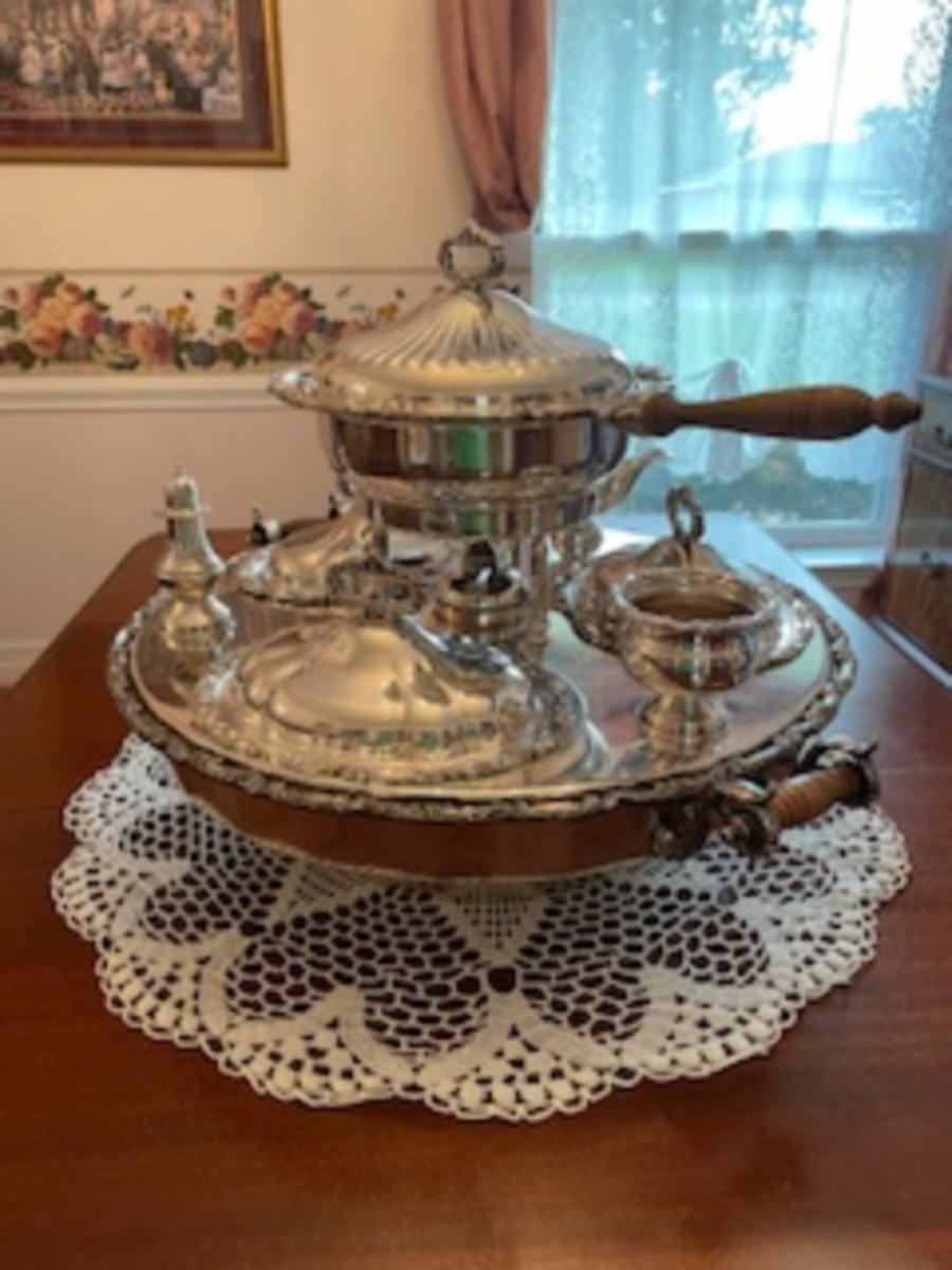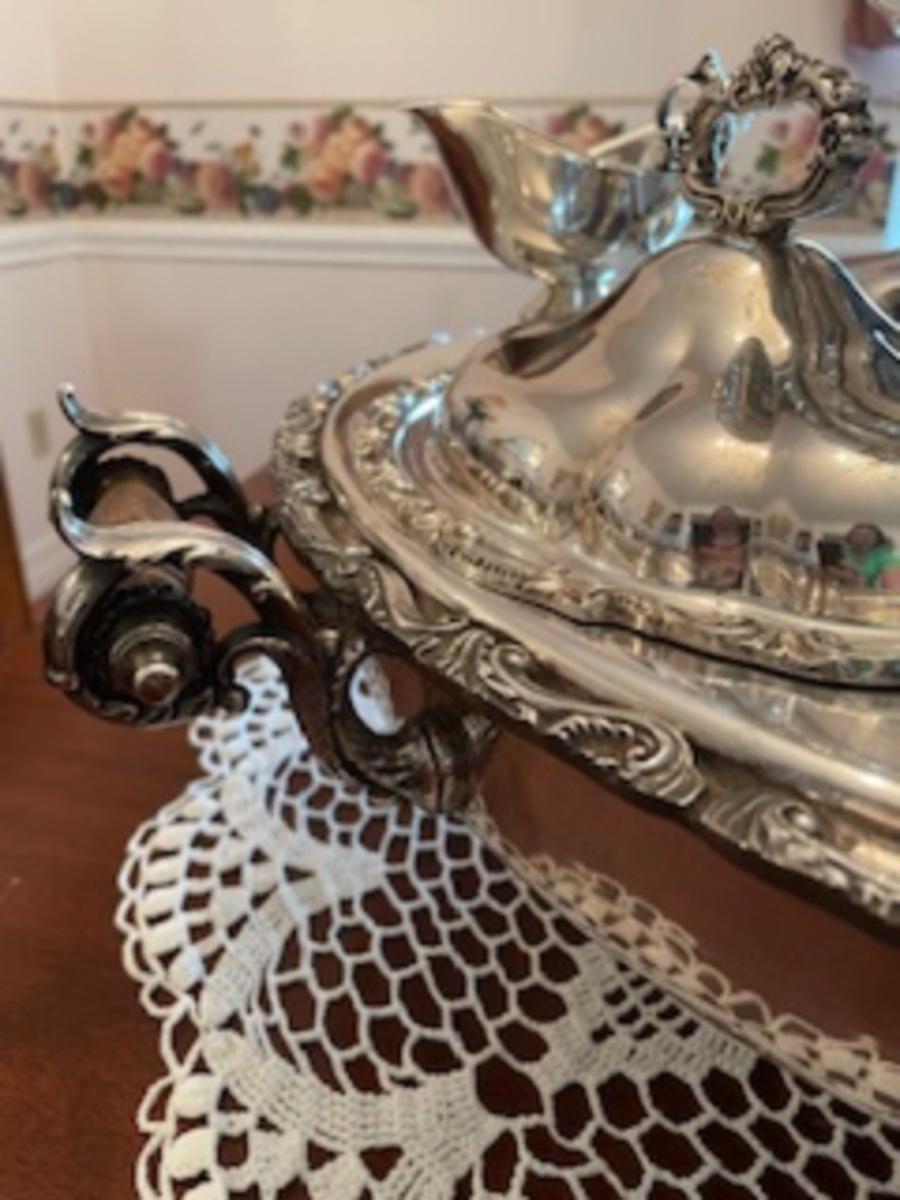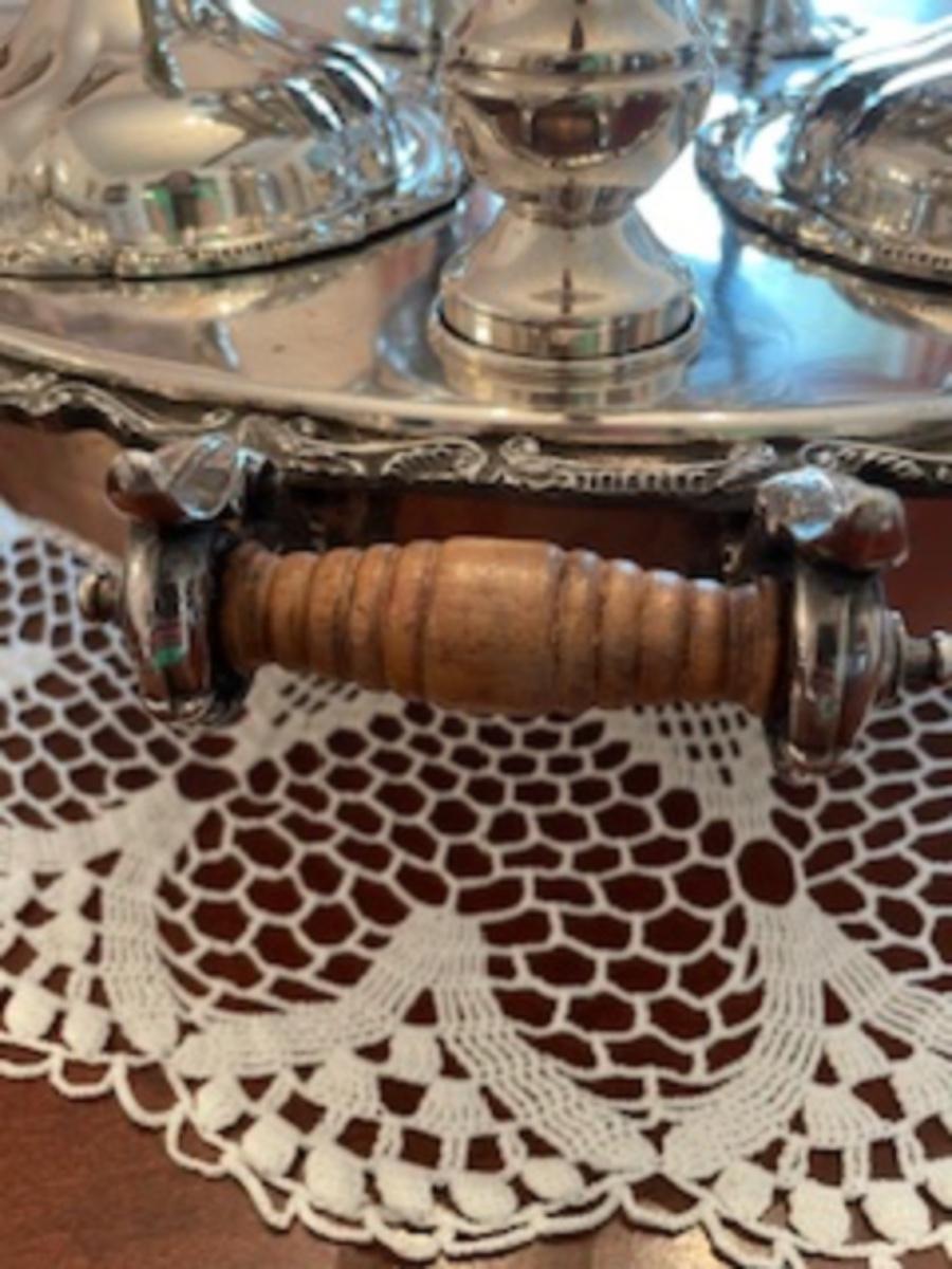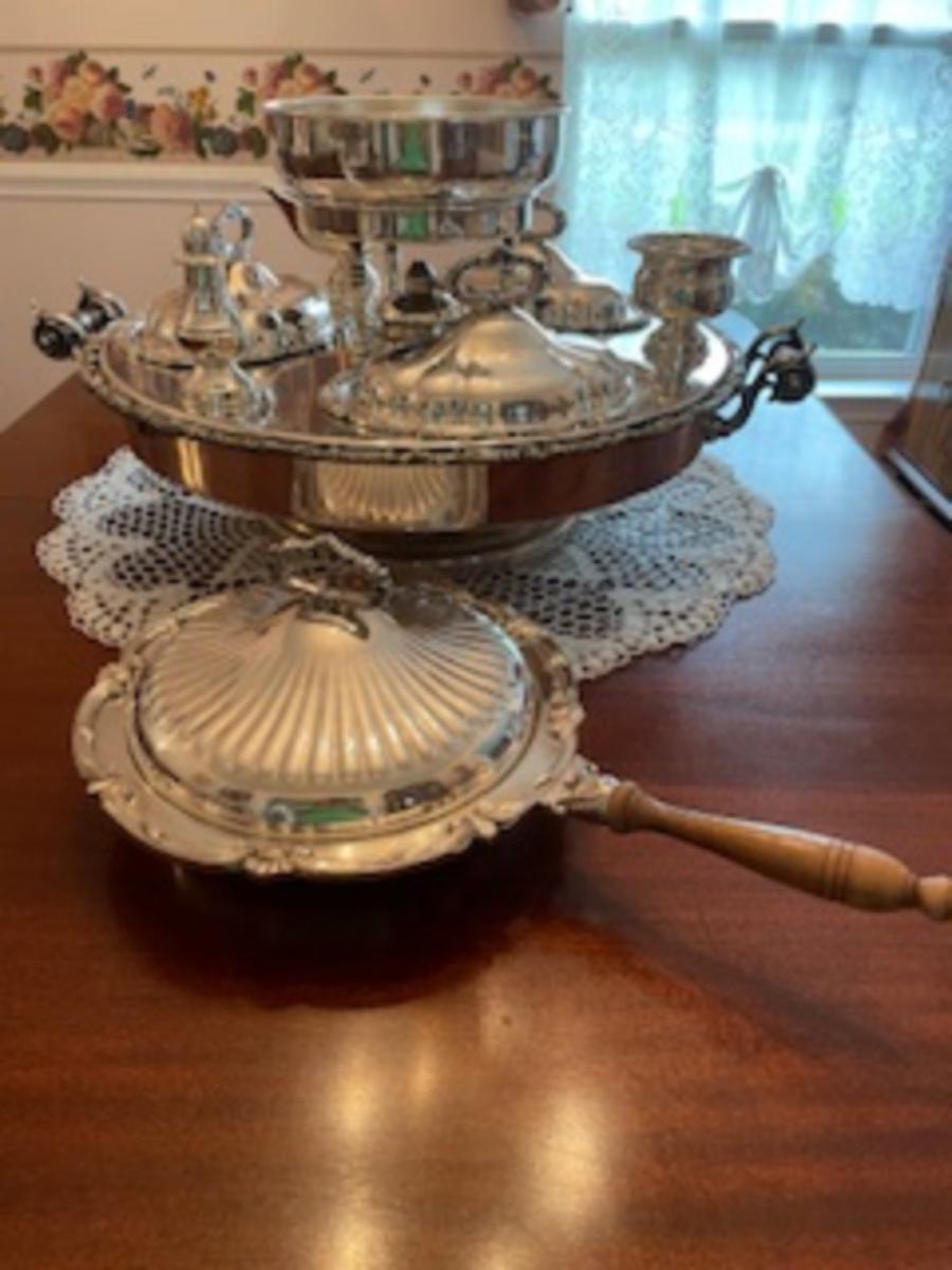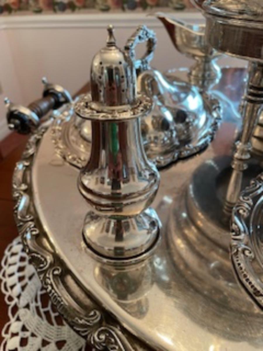 1932 Goldfelder Silver Co. Silver Plate Georgian Style Lazy Susan Dumbwaiter Server with Scroll & Shell Molded Lids. Comprises of 2 Handled Round Hot Water Basin on Lazy Susan Pedestal Base, Fitted with Center Footed Soup Tureen with Lid & Water Basin, 3 Oval Covered Entrée Dishes, Salt/Pepper Shaker, Footed Handled Gravy Boat, Footed Condiment Bowl. Height: 18 ½”