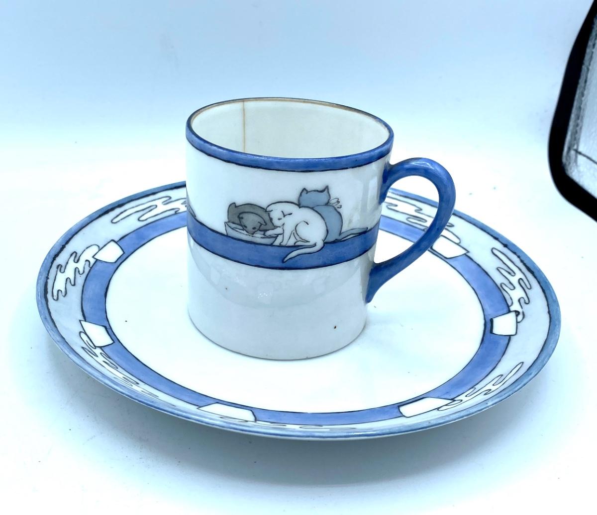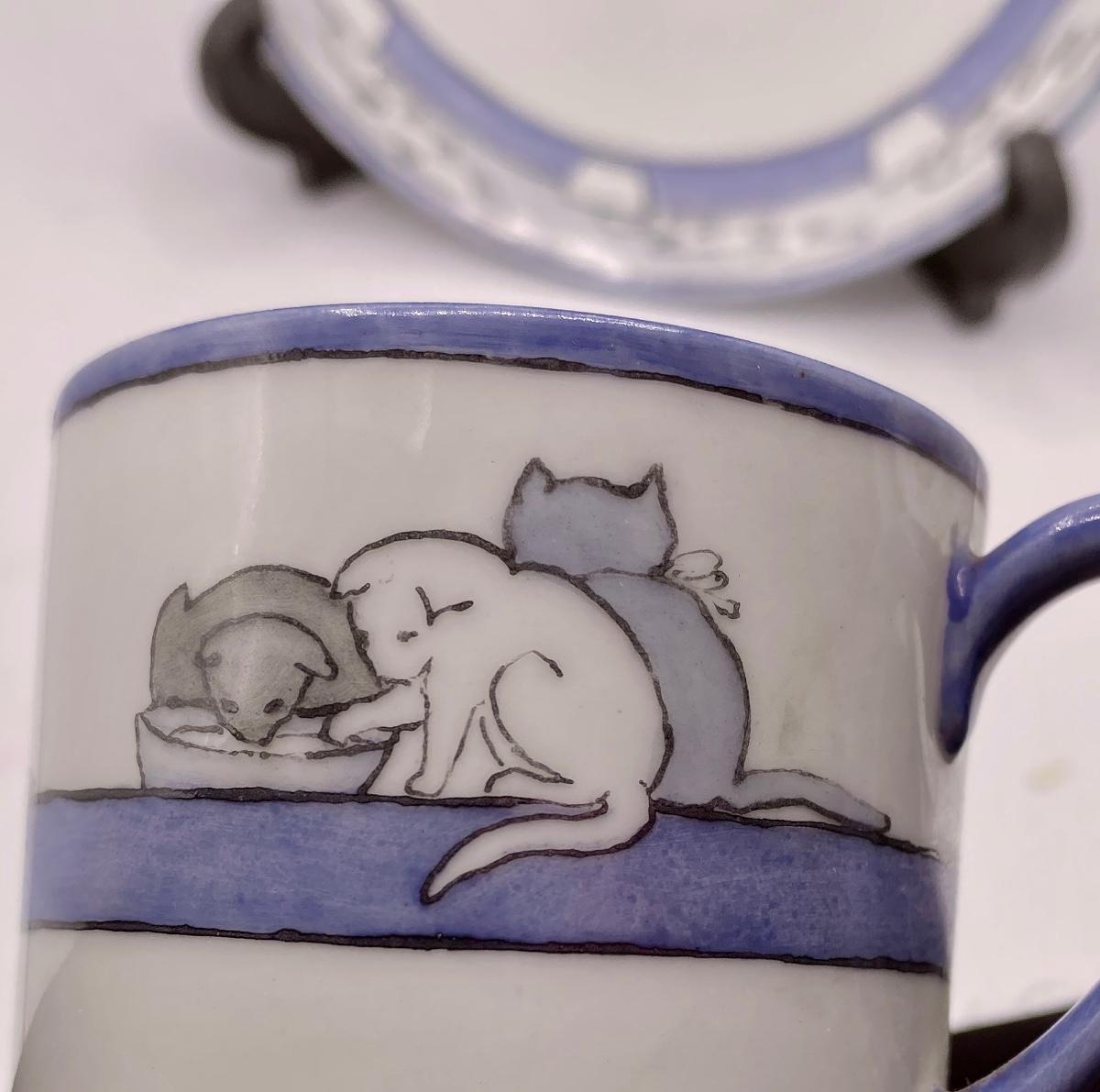 wonderful 90 year old handpainted porcelain cup and plate for a child in glorious arts & crafts style - the cup featuring cats drinking milk and the plate featuring steaming bowls around the rim.