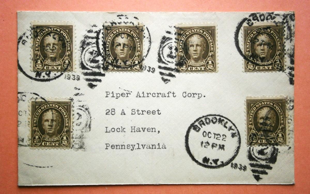 1933 Cover to Piper Aircraft Corp. with Multiple 1/2 Cent Stamps, 5 3/8 in. x 3 3/8 in., on tan paper, flap intact.