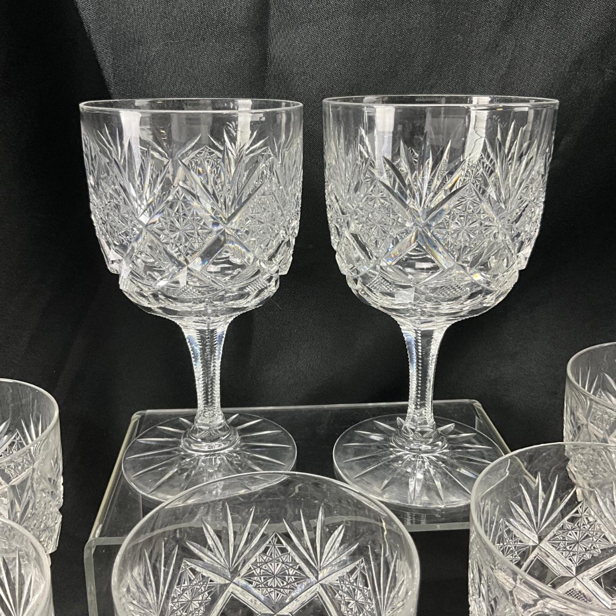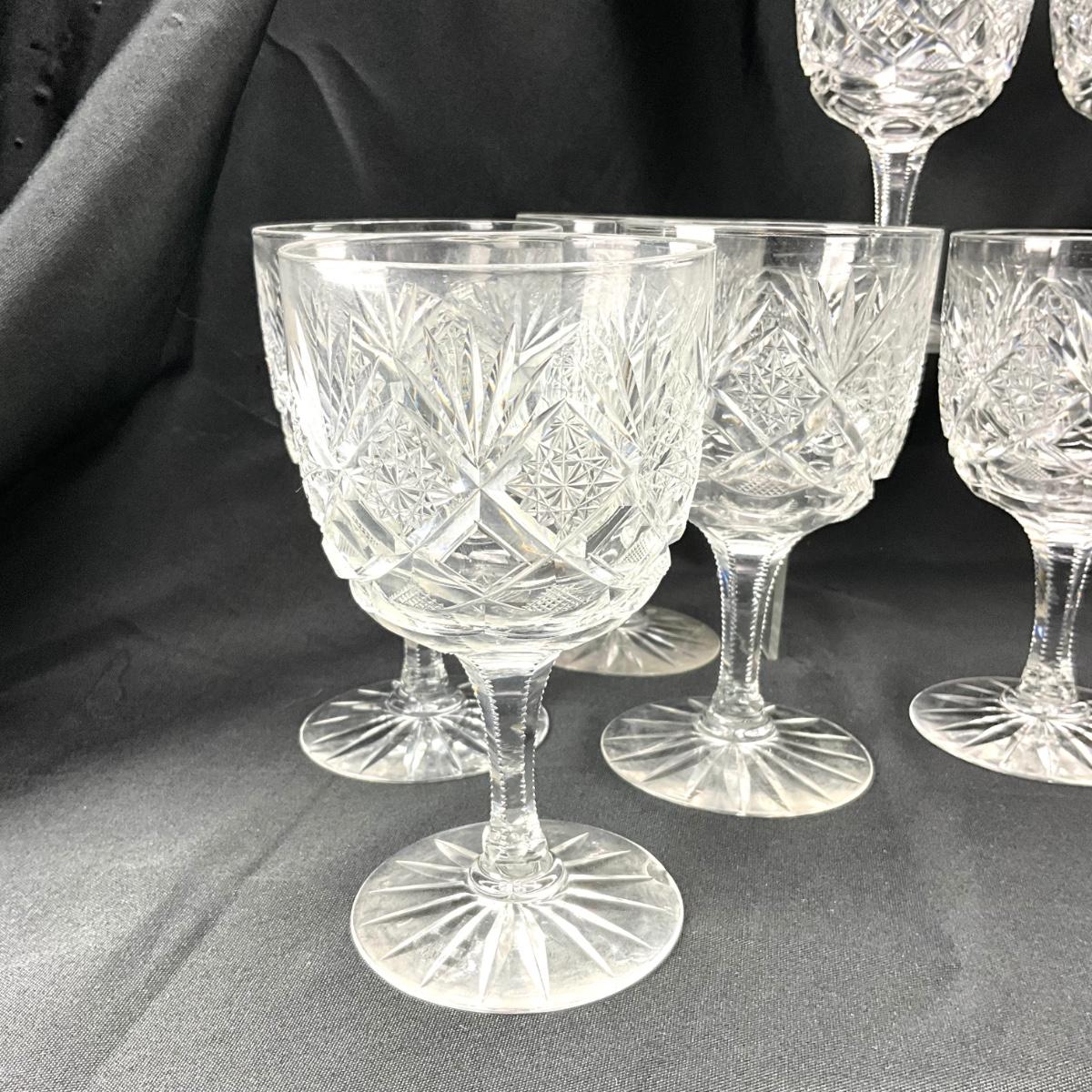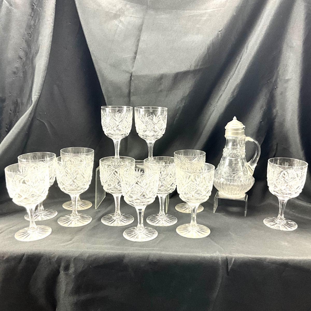 There are 12 crystal water goblets in this set and an antique syrup pitcher.