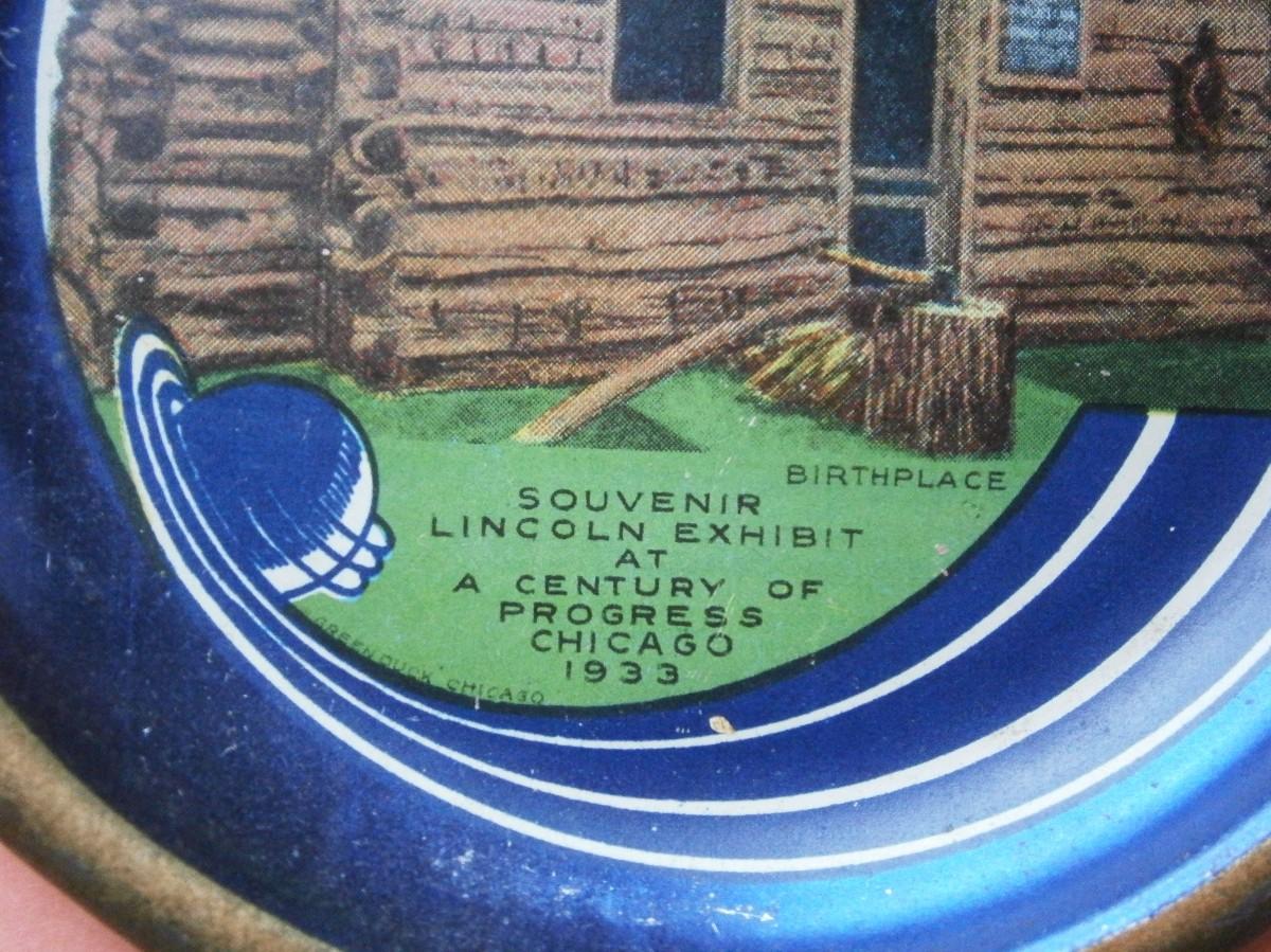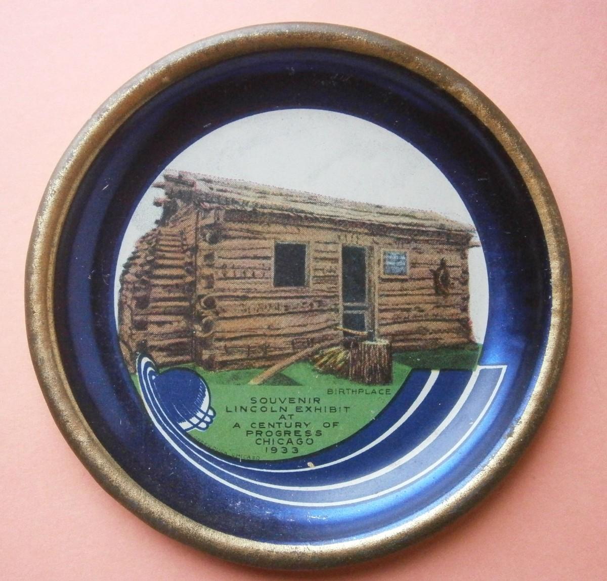 1933 World's Fair Coaster/Tray Souvenir Lincoln Exhibit by Green Duck Chicago, 4 in. diameter, lithographed tin.