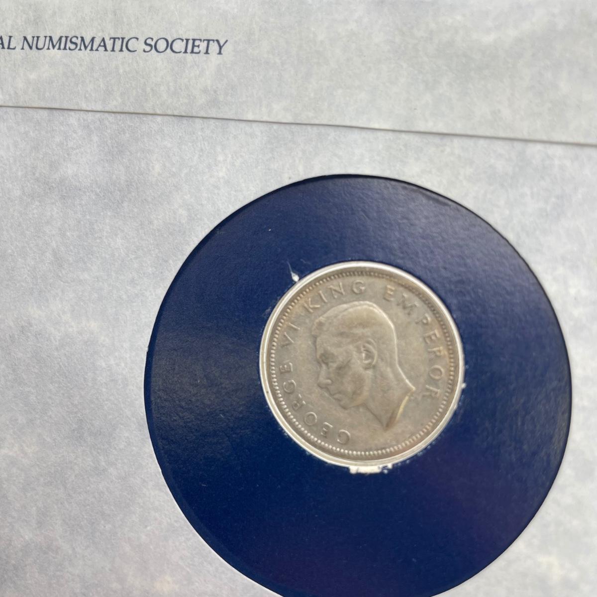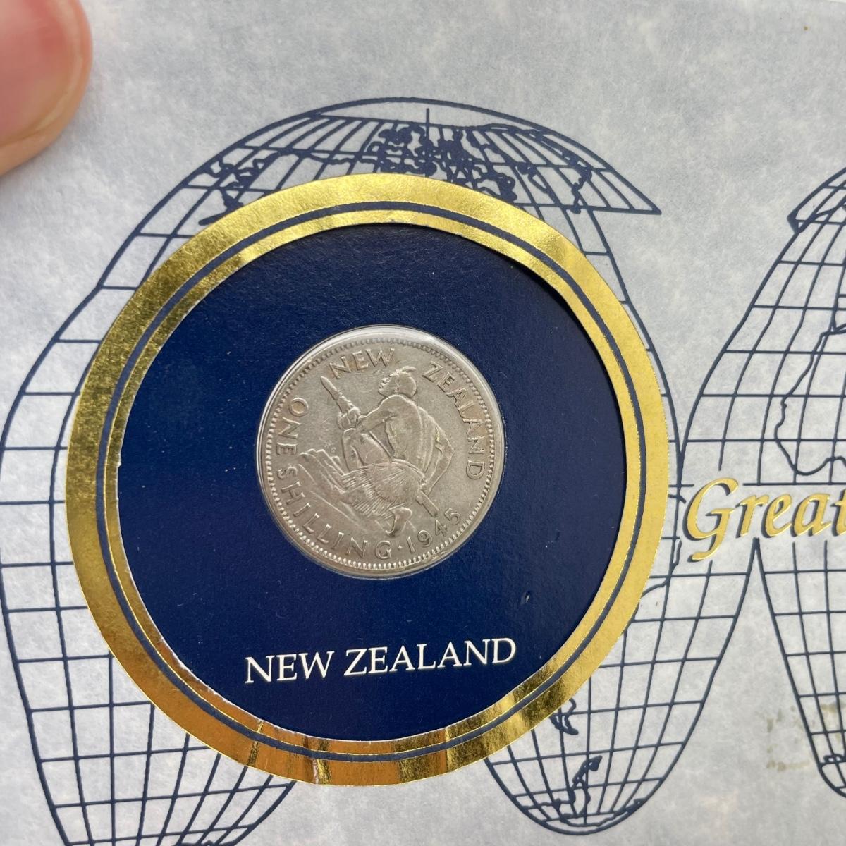 1934 Chinese Silver “Junk Dollar” and 1945 NZ Shilling with Stamps (ST-SS)