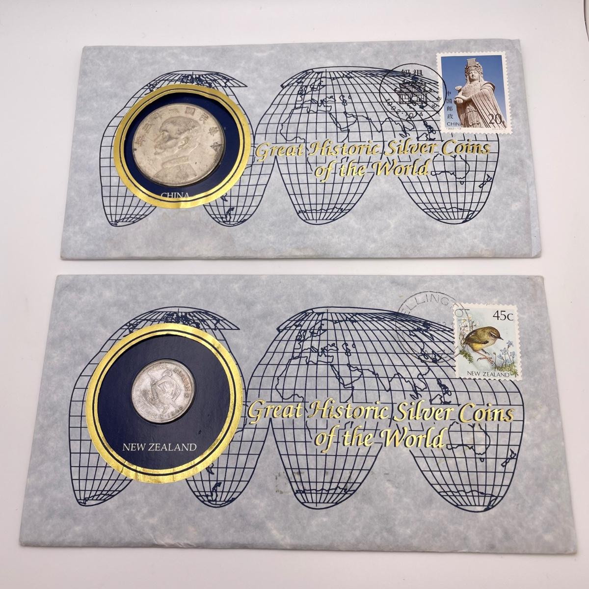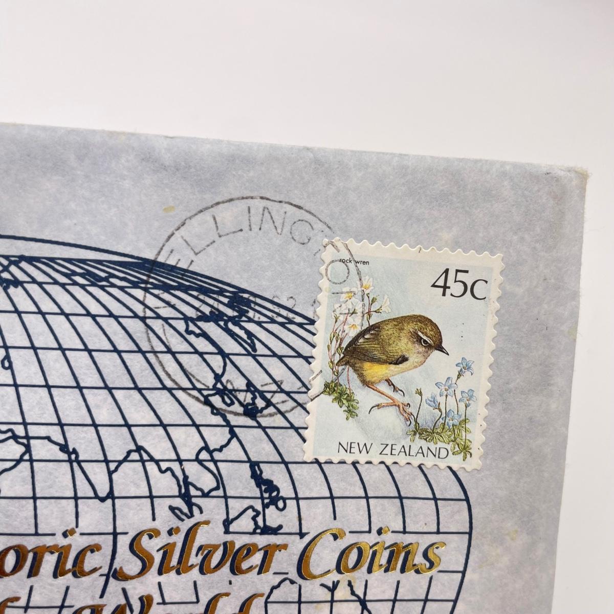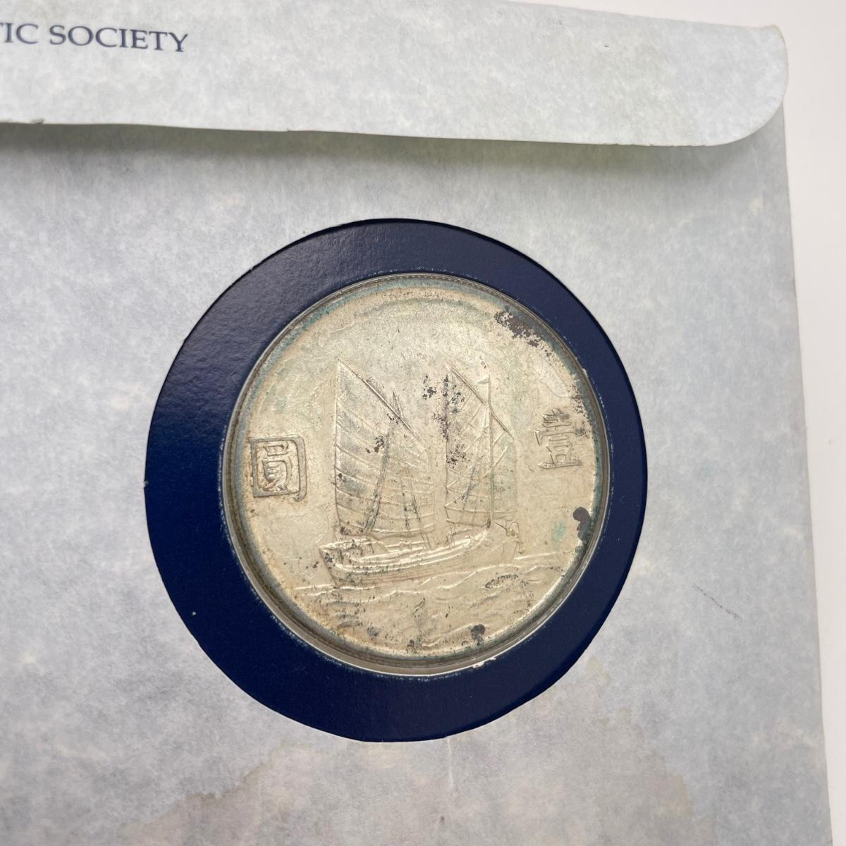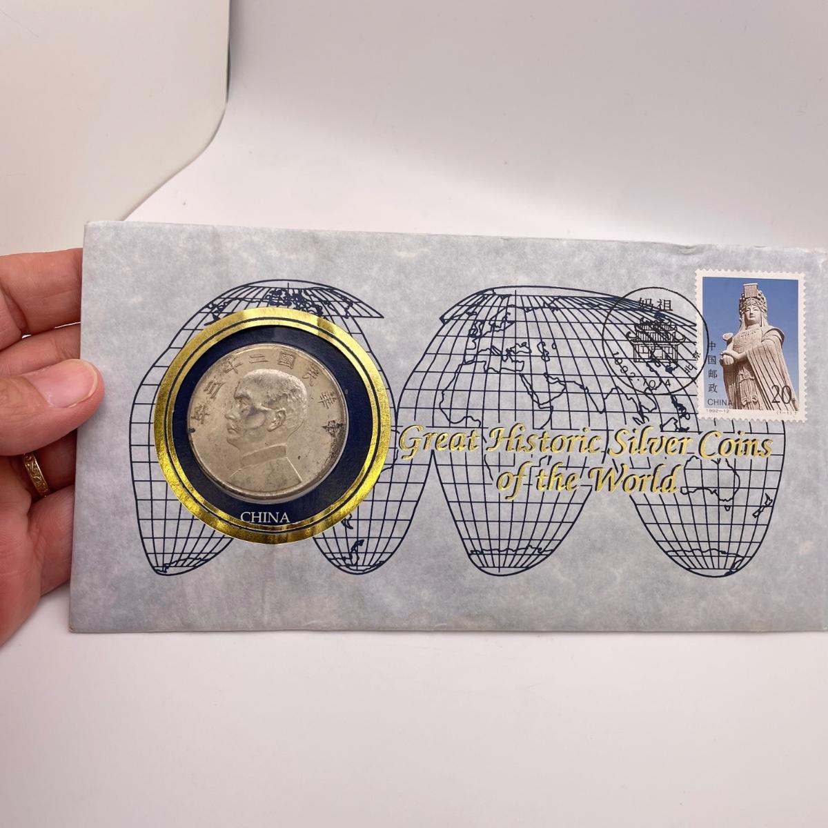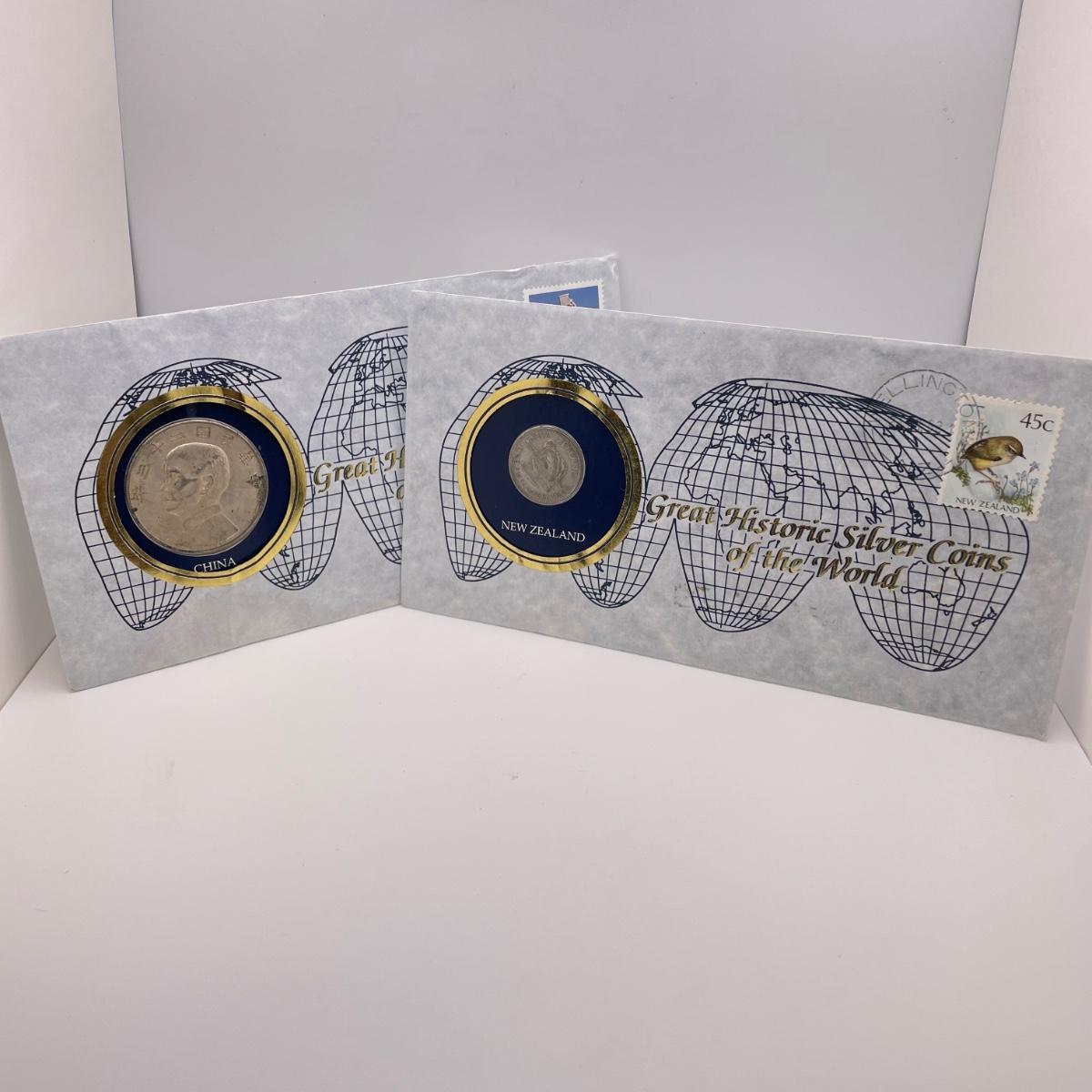 Lot holds what appears to be a silver 1934 “Junk Dollar” from the Chinese Republic in an opened envelope with a canceled 1992 Mazu stamp. Lot also contains what appears to be a 1945 silver New Zealand shilling in a sealed envelope with a canceled 45c Rock Wren stamp. All sales are final. No returns or refunds. Please bid accordingly. Shipping available.