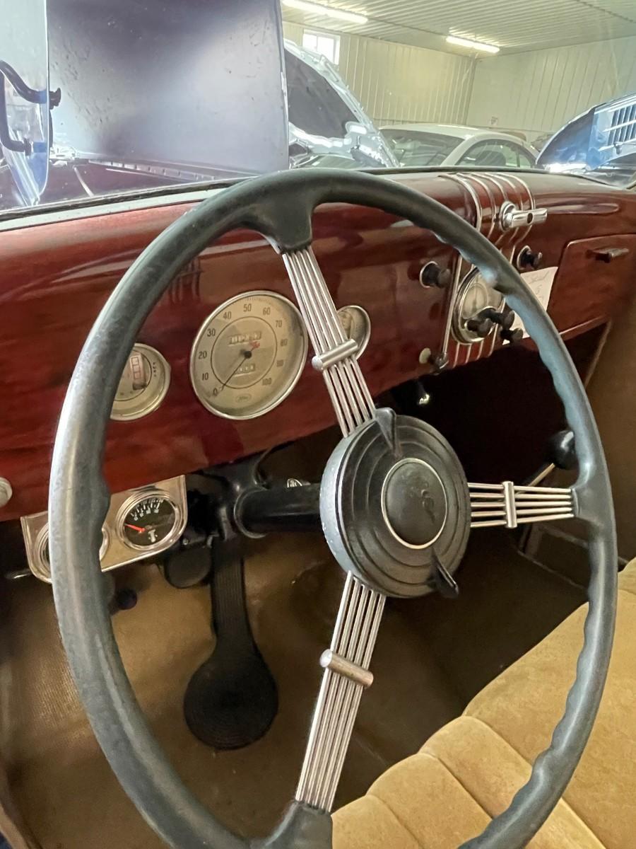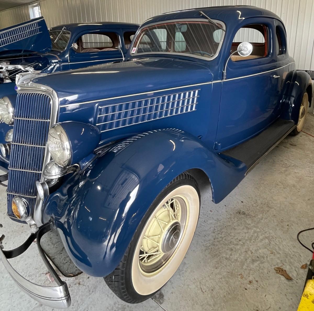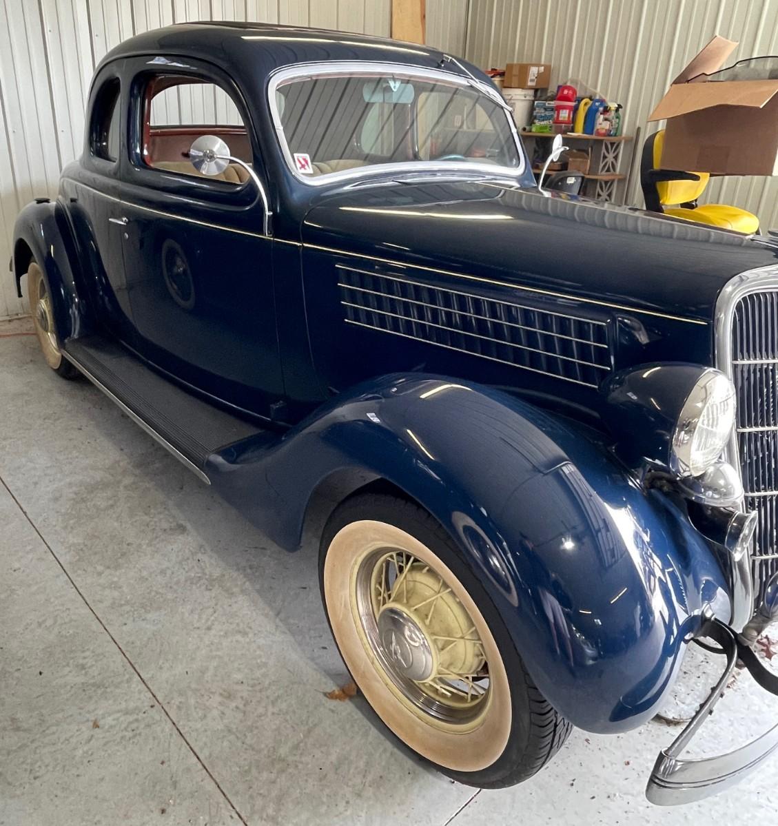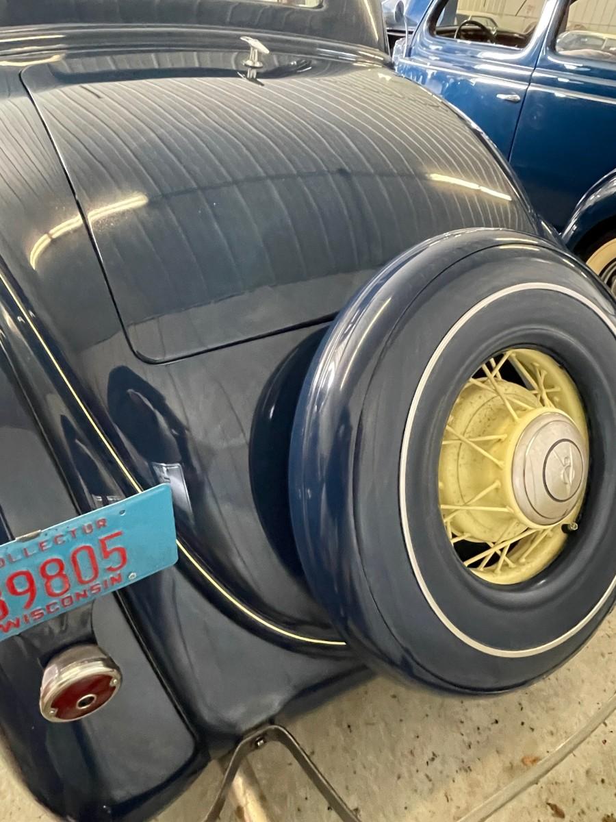 1934 Ford 5 window coupe, Blue exterior with tan cloth interior. Rumble seat has tan leather-like seat.. Original wire wheels & rear mounted spare with Cooker white wall tires. Exterior / interior condition is A+