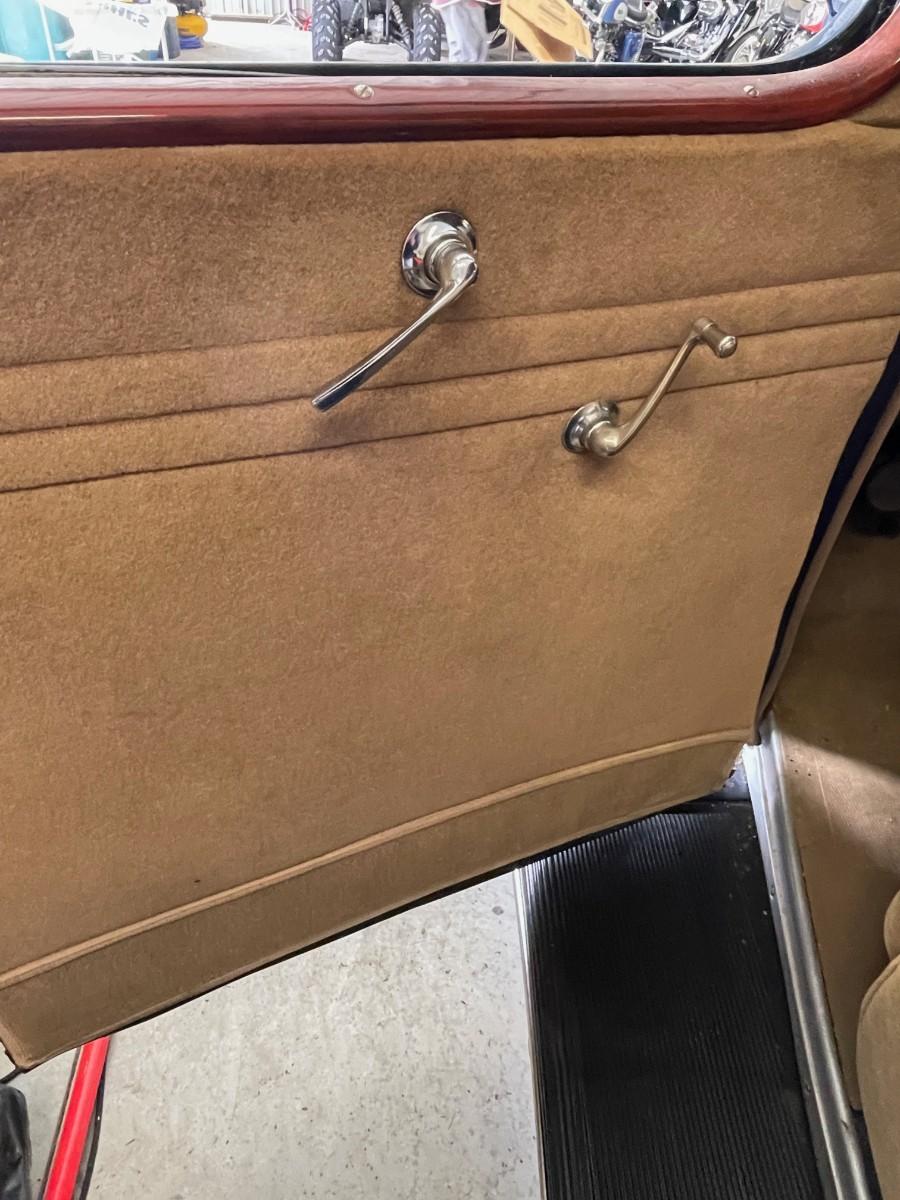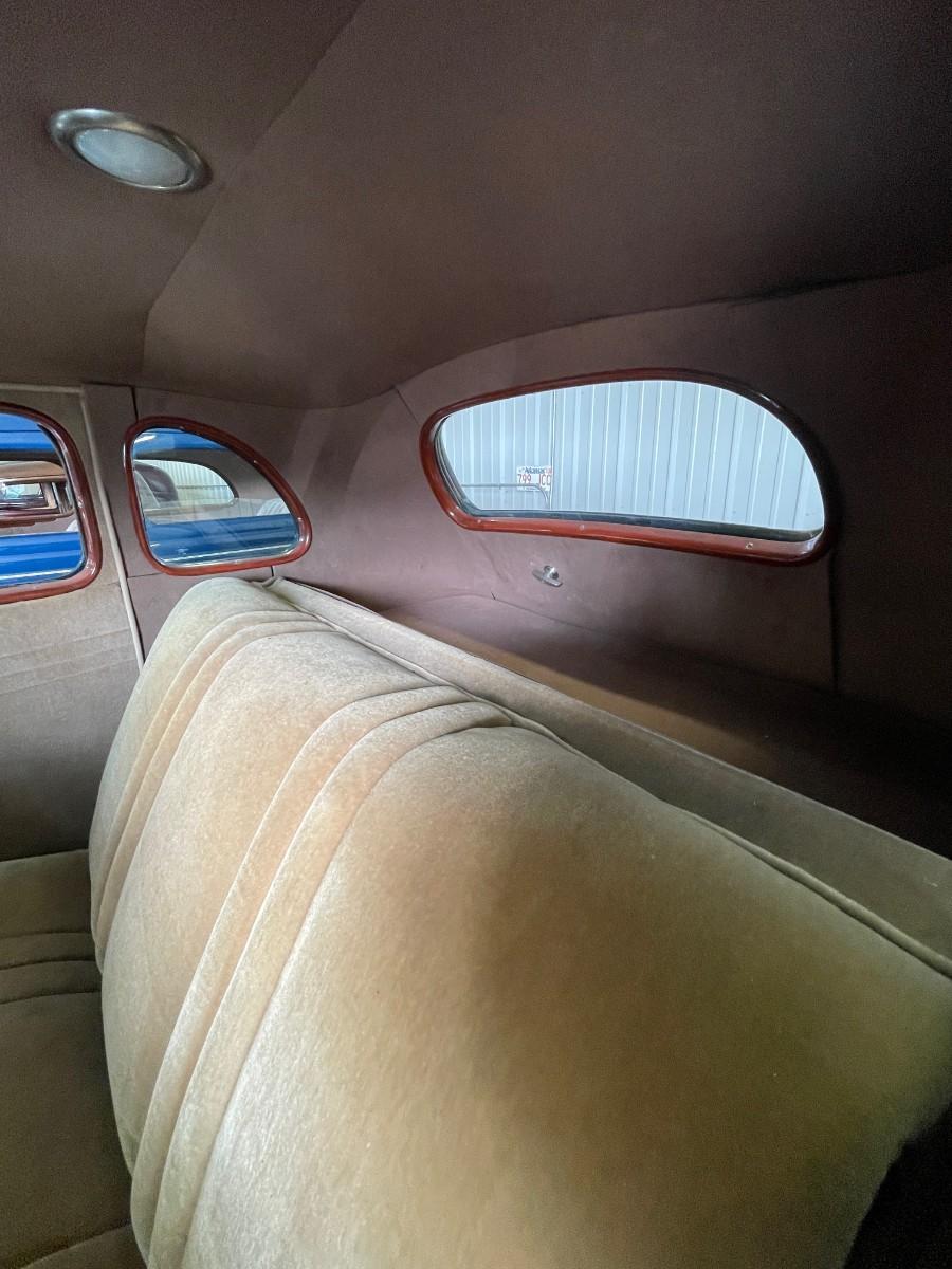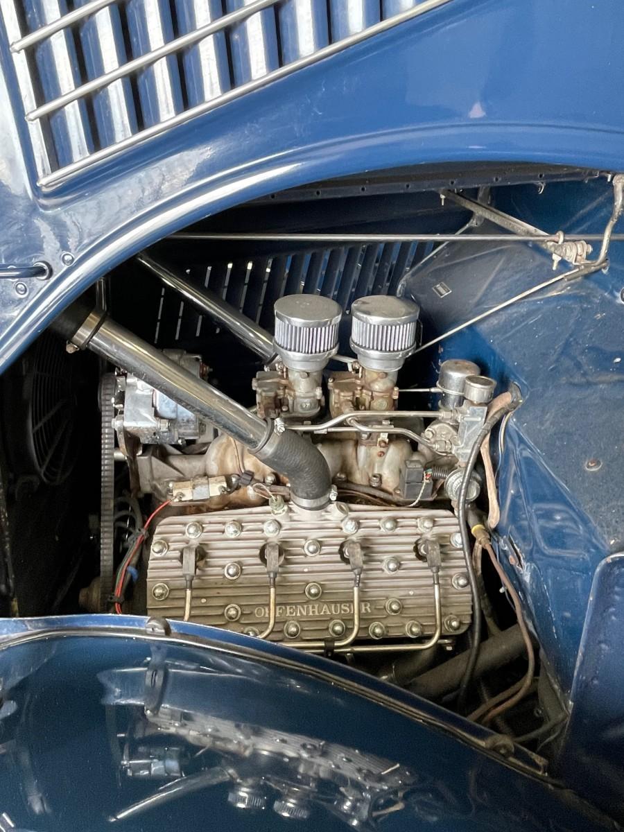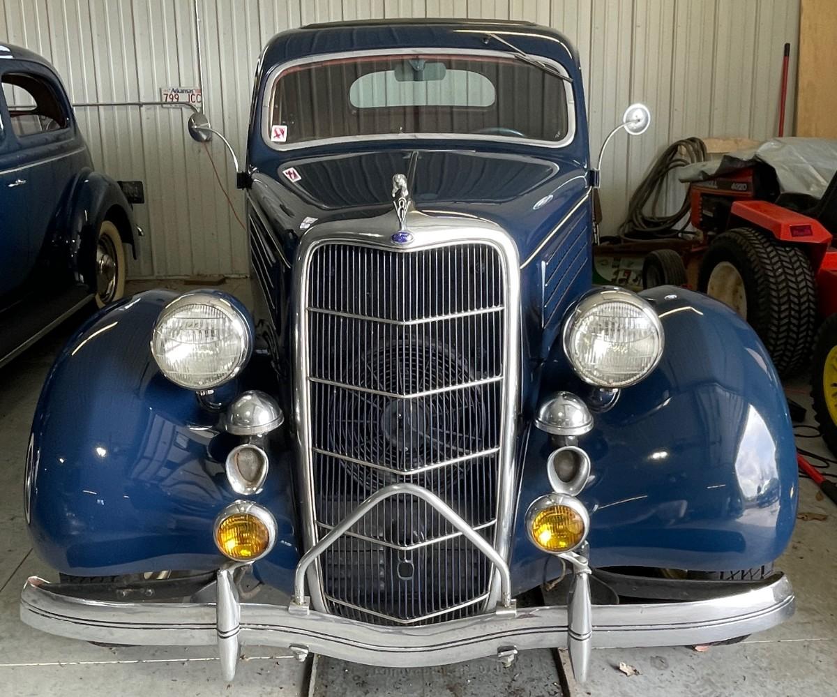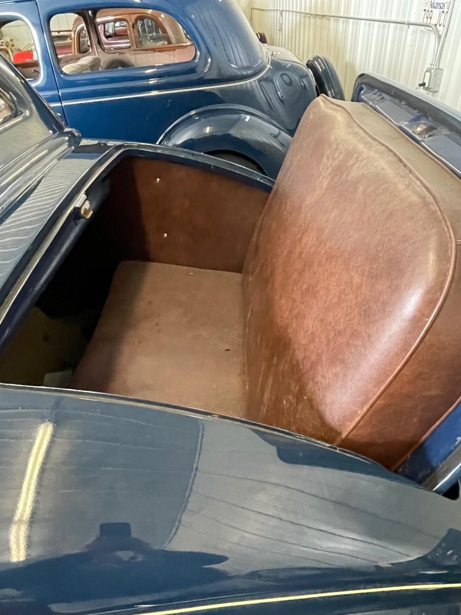 1934 Ford 5 window coupe, Blue exterior with tan cloth interior. Rumble seat has tan leather-like seat.. Original wire wheels & rear mounted spare with Cooker white wall tires. Exterior / interior condition is A+