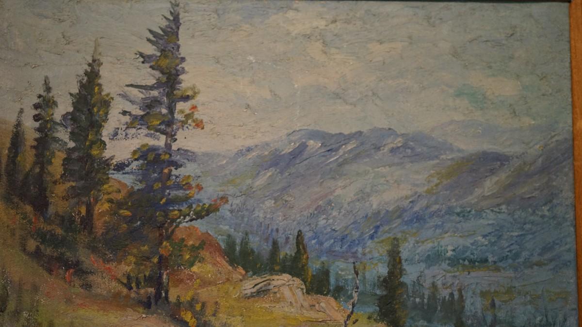 detailed oil on board of Colorado lake measuring framed: 14" by 12"
