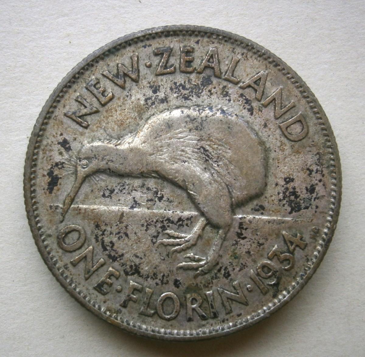 New Zealand - 1934 One Florin Coin, 28mm diameter.